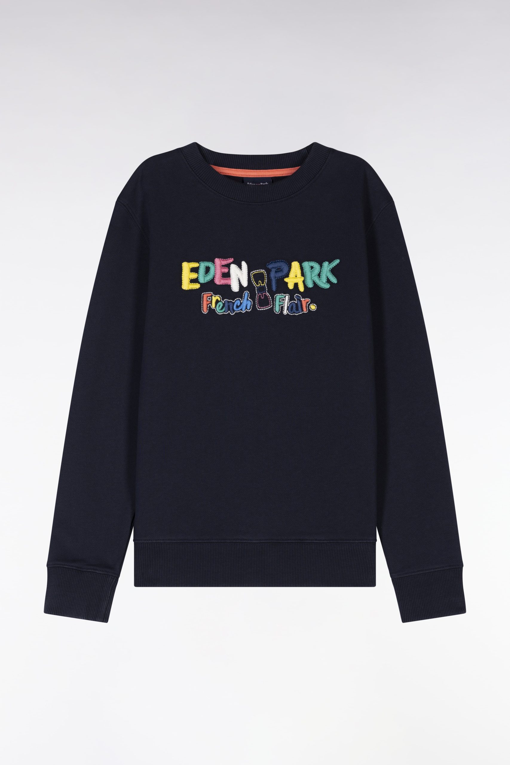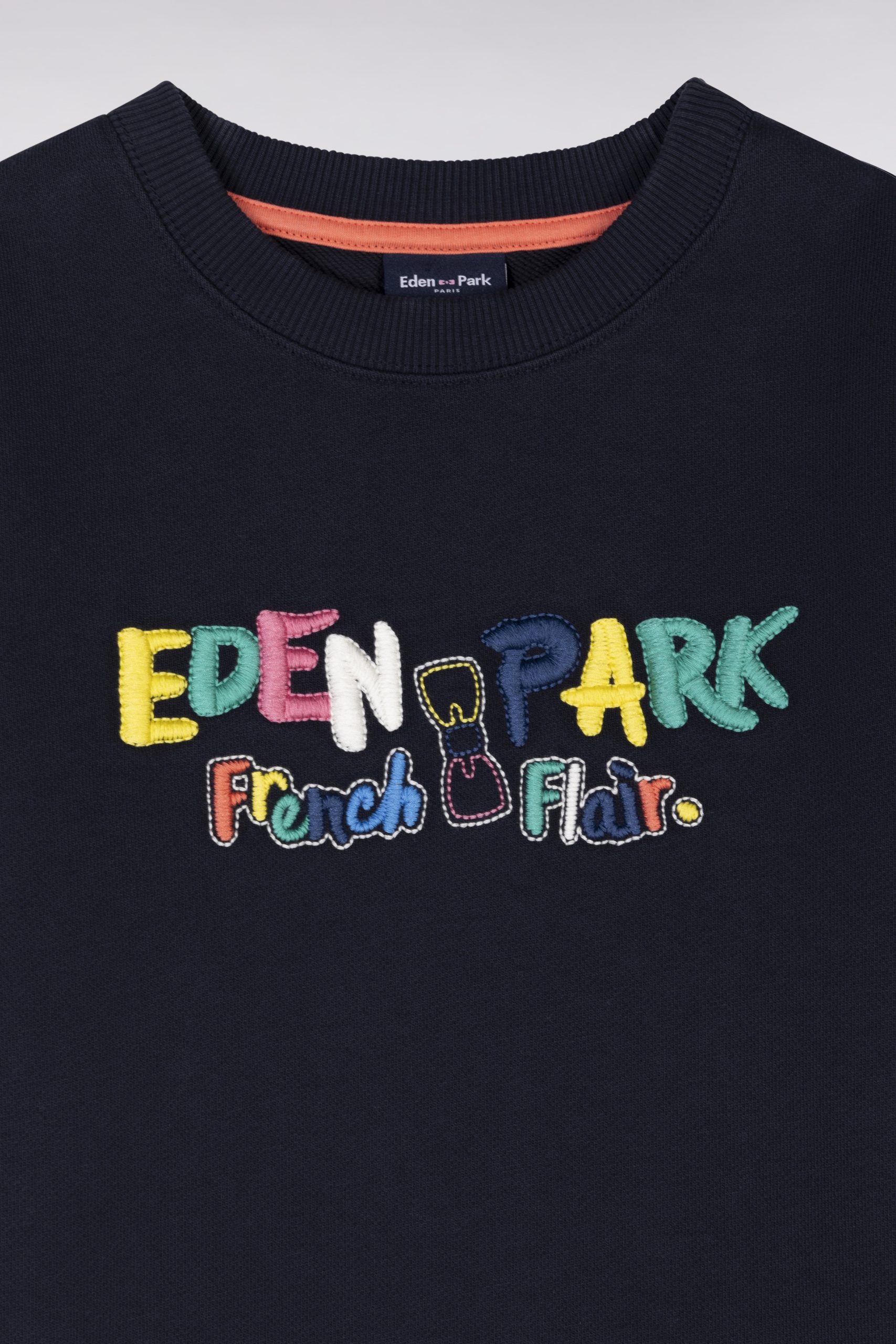 Ce sweatshirt enfant bleu marine se distingue par une broderie multicolore ludique. Avec ses bords-côtes soignés et sa coupe droite confortable, il est idéal pour accompagner les plus jeunes dans toutes leurs aventures avec style et originalité associé à un jean ou à un pantalon jogging marine.