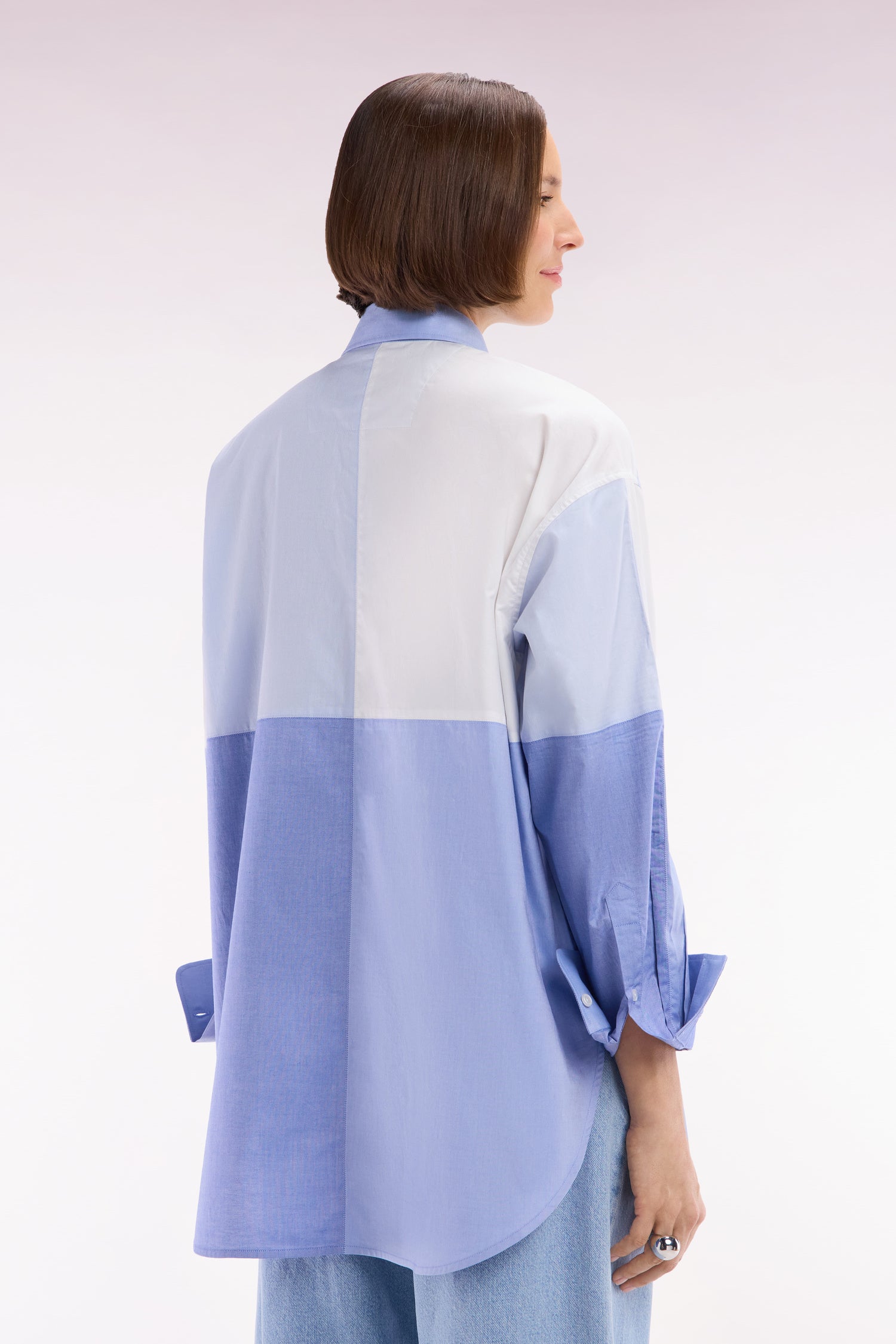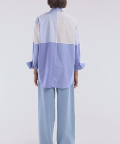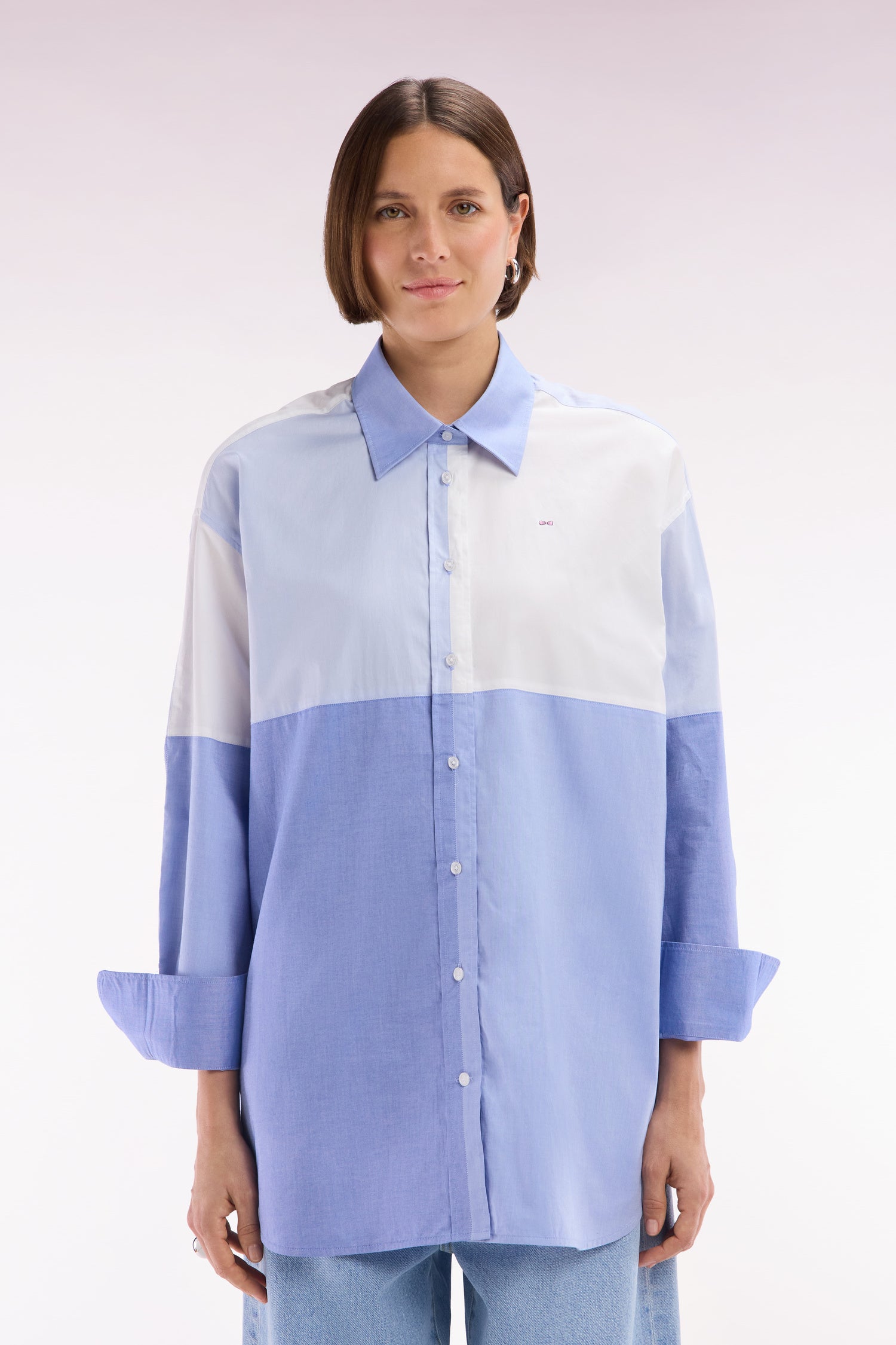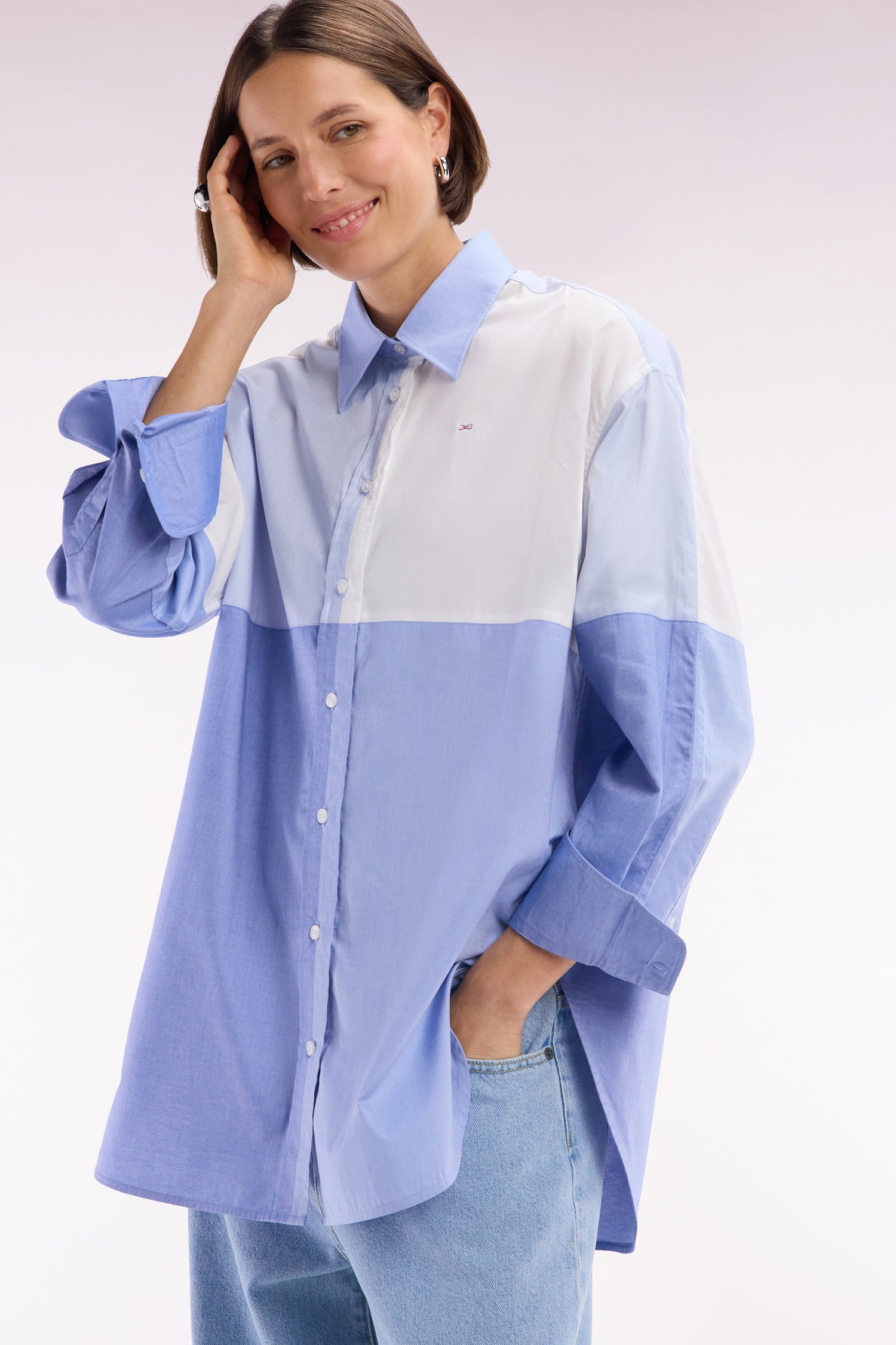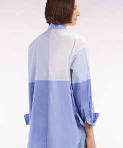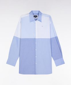 Adoptez une allure moderne et audacieuse avec cette chemise en popeline de coton. Sa coupe oversized et son design colorblock patché en dégradé de bleus façon maillot coupé-cousu en font une pièce unique et tendance. Idéale pour une silhouette affirmée, elle s’associe aussi bien à un jean qu’à un pantalon fluide.