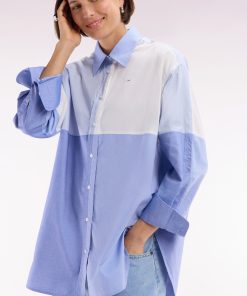 Adoptez une allure moderne et audacieuse avec cette chemise en popeline de coton. Sa coupe oversized et son design colorblock patché en dégradé de bleus façon maillot coupé-cousu en font une pièce unique et tendance. Idéale pour une silhouette affirmée, elle s’associe aussi bien à un jean qu’à un pantalon fluide.