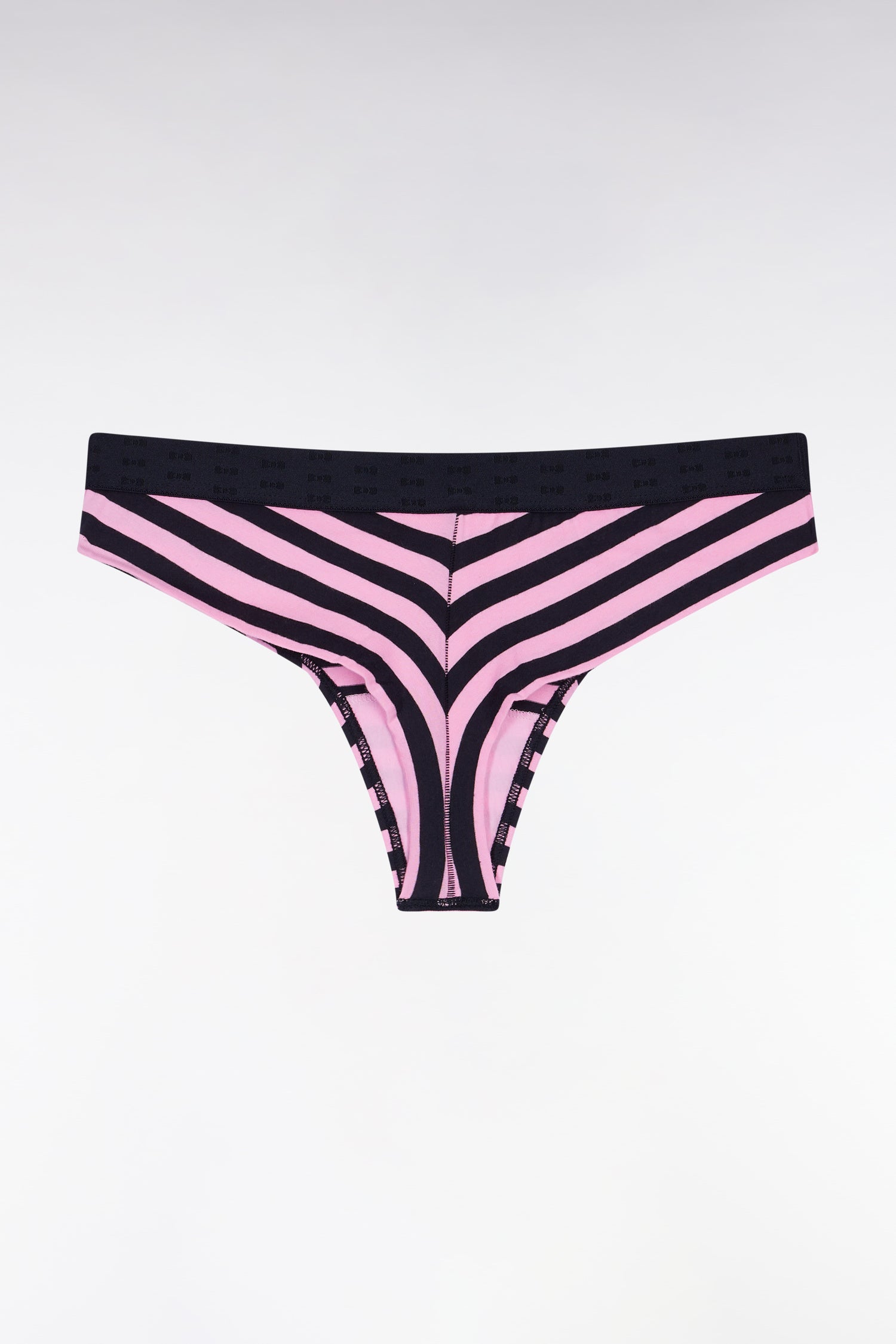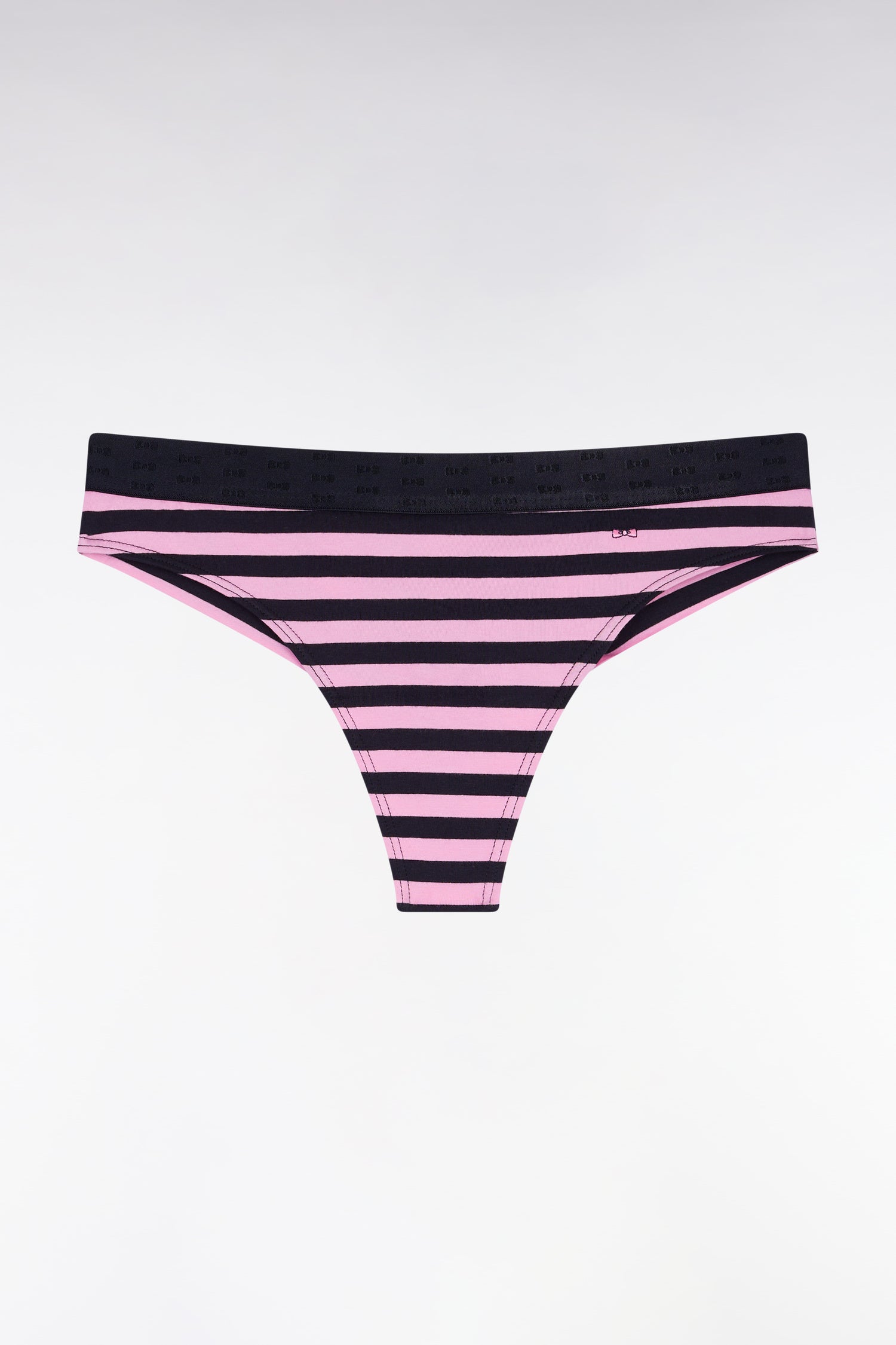 Notre culotte tanga en jersey de modal stretch est le sous-vêtement idéal pour allier discrétion et confort sous des vêtements ajustés. La bande élastique noire discrètement ornée de nœuds papillon ton sur ton apporte une signature visuelle mais aussi un ajustement parfait, faisant de ce tanga à rayure roses et marine un incontournable du vestiaire quotidien