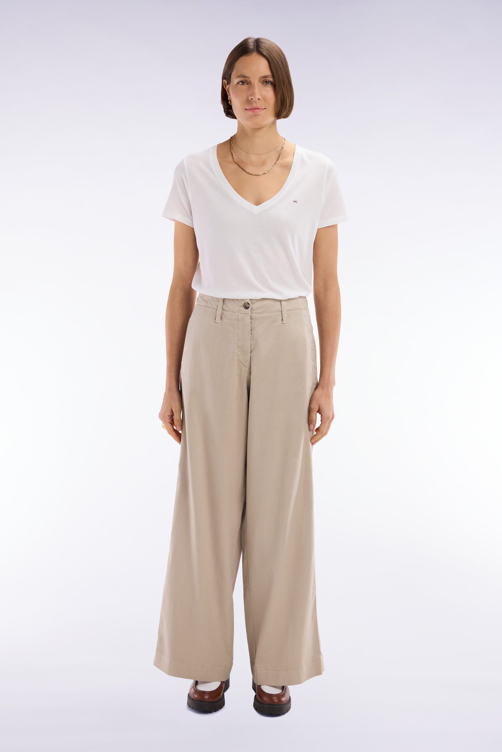 Associez confort et raffinement avec ce pantalon en lin et coton stretch beige, parfait pour les journées estivales. Sa coupe fluide et intemporelle sublime la silhouette tout en offrant une sensation de légèreté agréable. Facile à associer, il se marie à une chemise blanche pour une élégance classique ou à un maillot coloré pour un style plus décontracté. Une pièce essentielle du vestiaire féminin, alliant sophistication et polyvalence, idéale pour un look estival chic et décontracté.