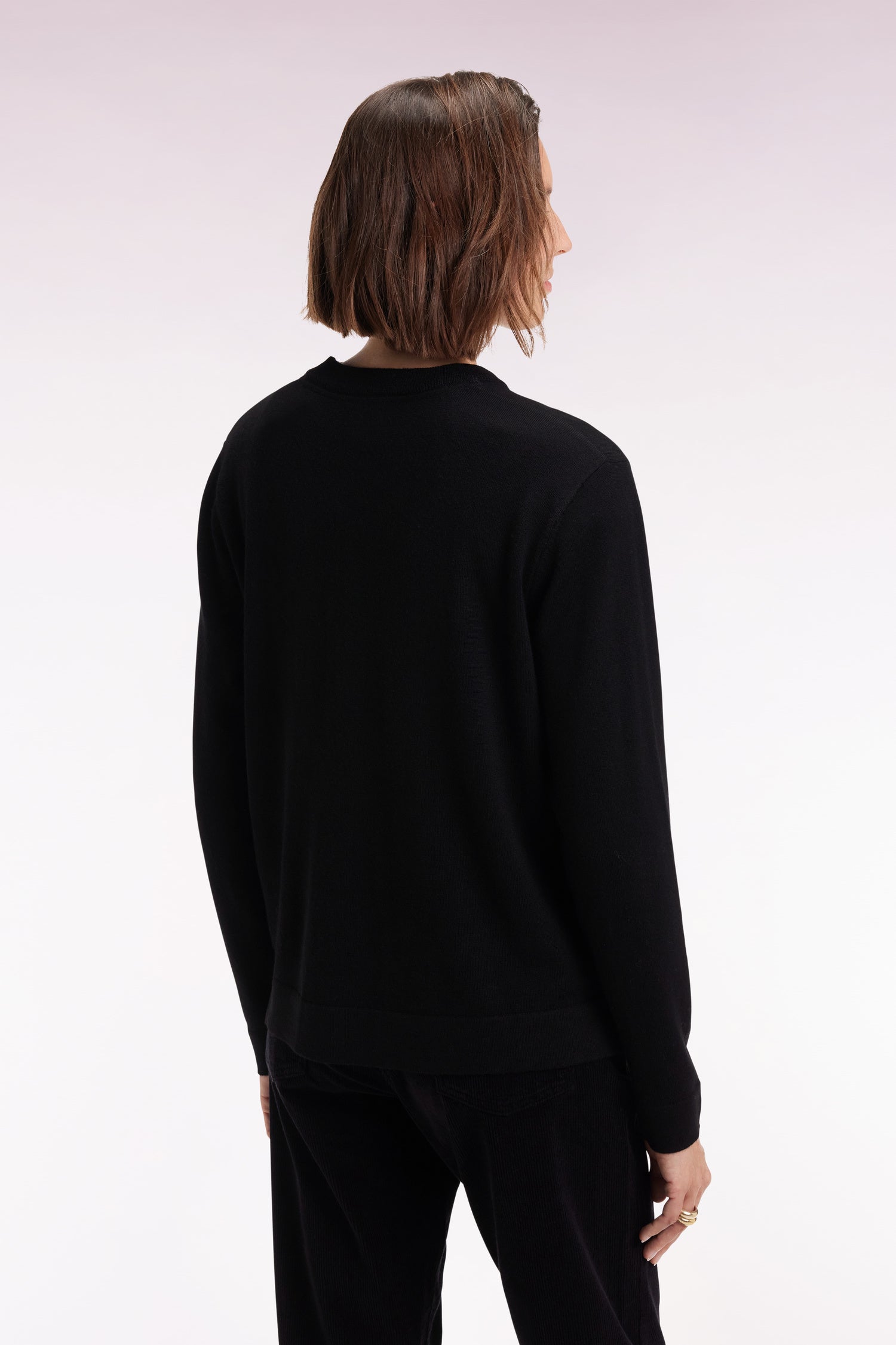 Ce pull femme à col rond en laine mérinos au toucher cachemire incarne la douceur et la simplicité sophistiquée de notre vestiaire d’hiver. Sa maille fine et respirante, travaillée dans une coupe droite confortable et seyante, se pare de finitions bords-côtes soignées et d’un discret nœud papillon brodé au fil rose en bas de pièce. Un essentiel intemporel, décliné en marine, noir ou écru lumineux