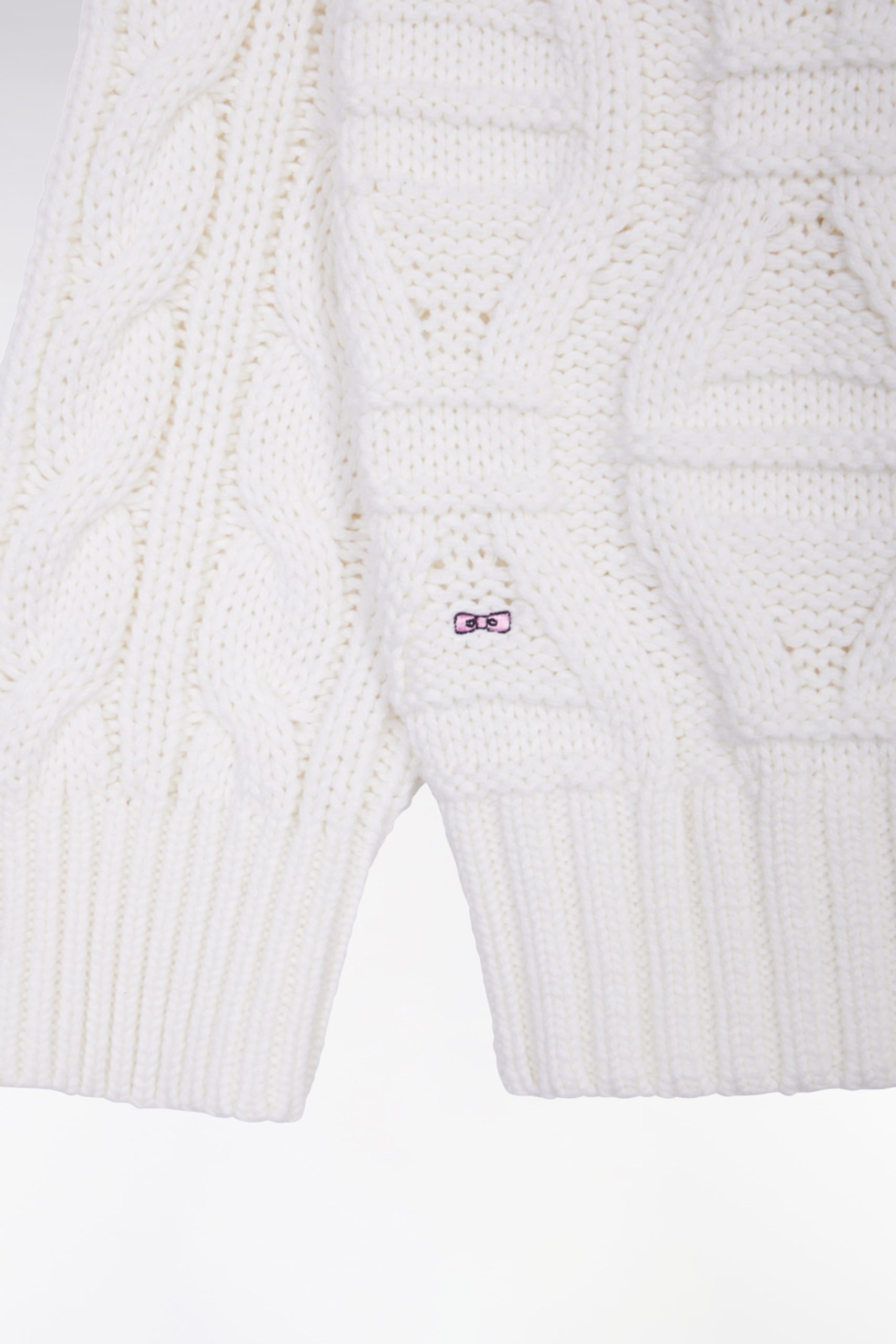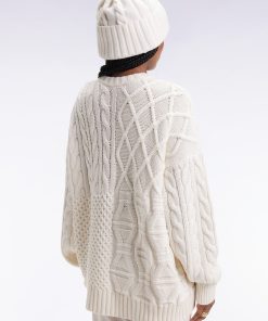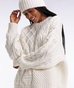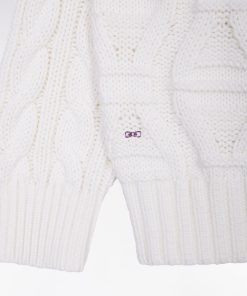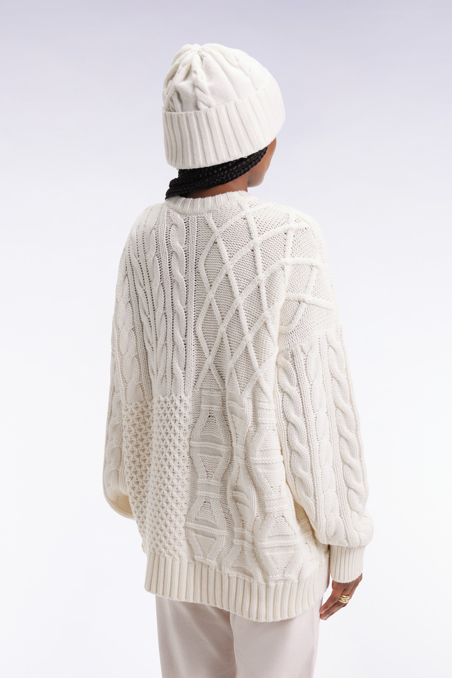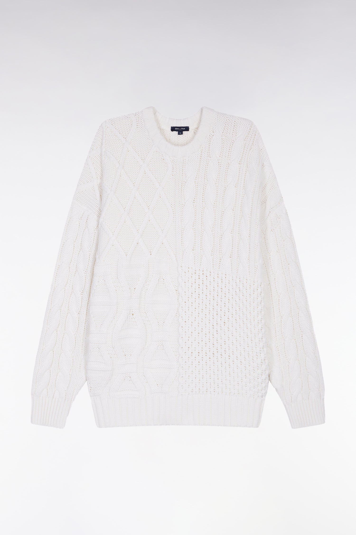 Inspiré des maillots légendaires du rugby, ce pull tricoté blanc revisite également l’emblématique pull à torsades dans une version féminine résolument contemporaine. Sa maille torsadée sublime un patchwork de points emblématiques, comme découpé en cadrans. Coupe ample et col rond pour un porté décontracté