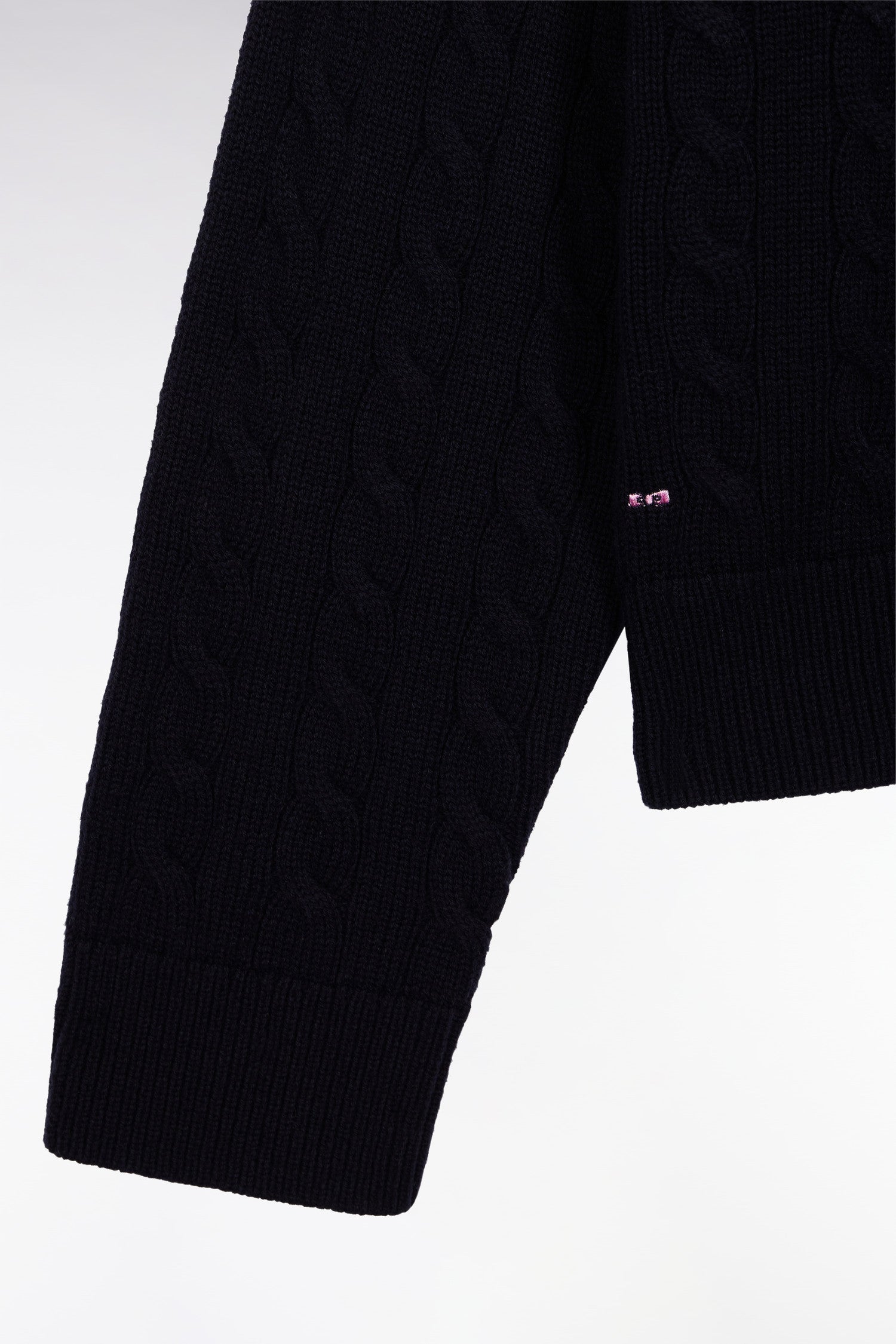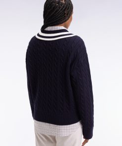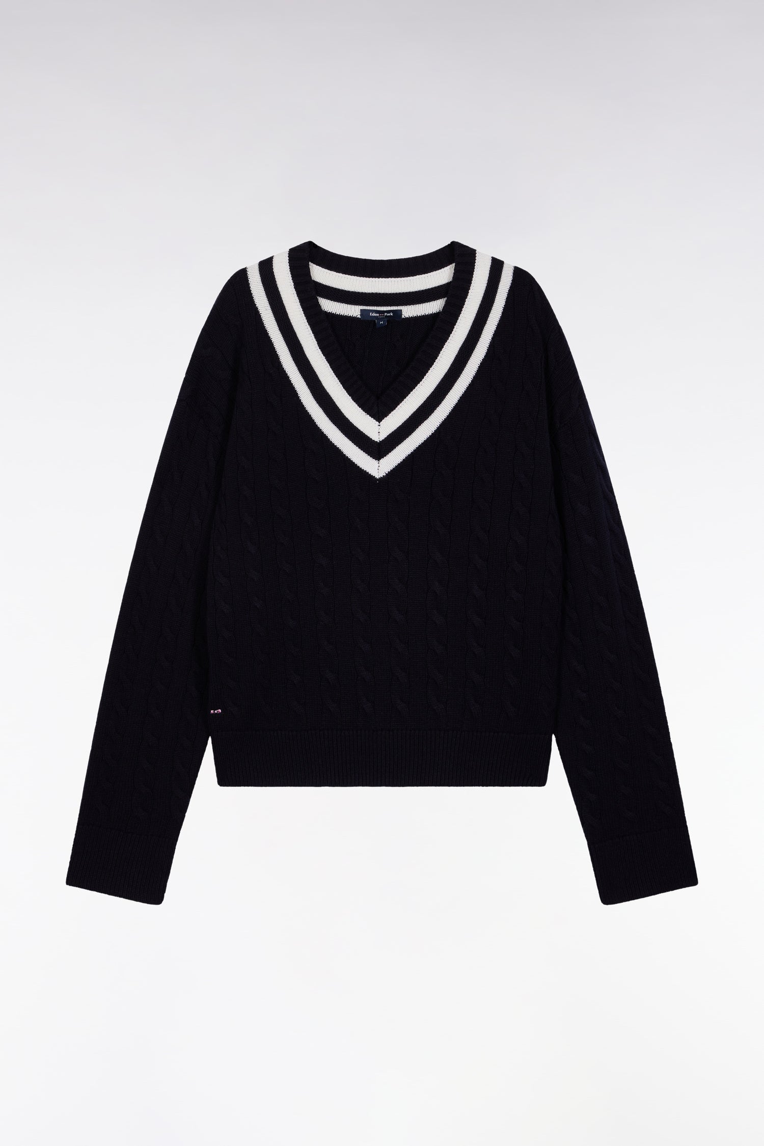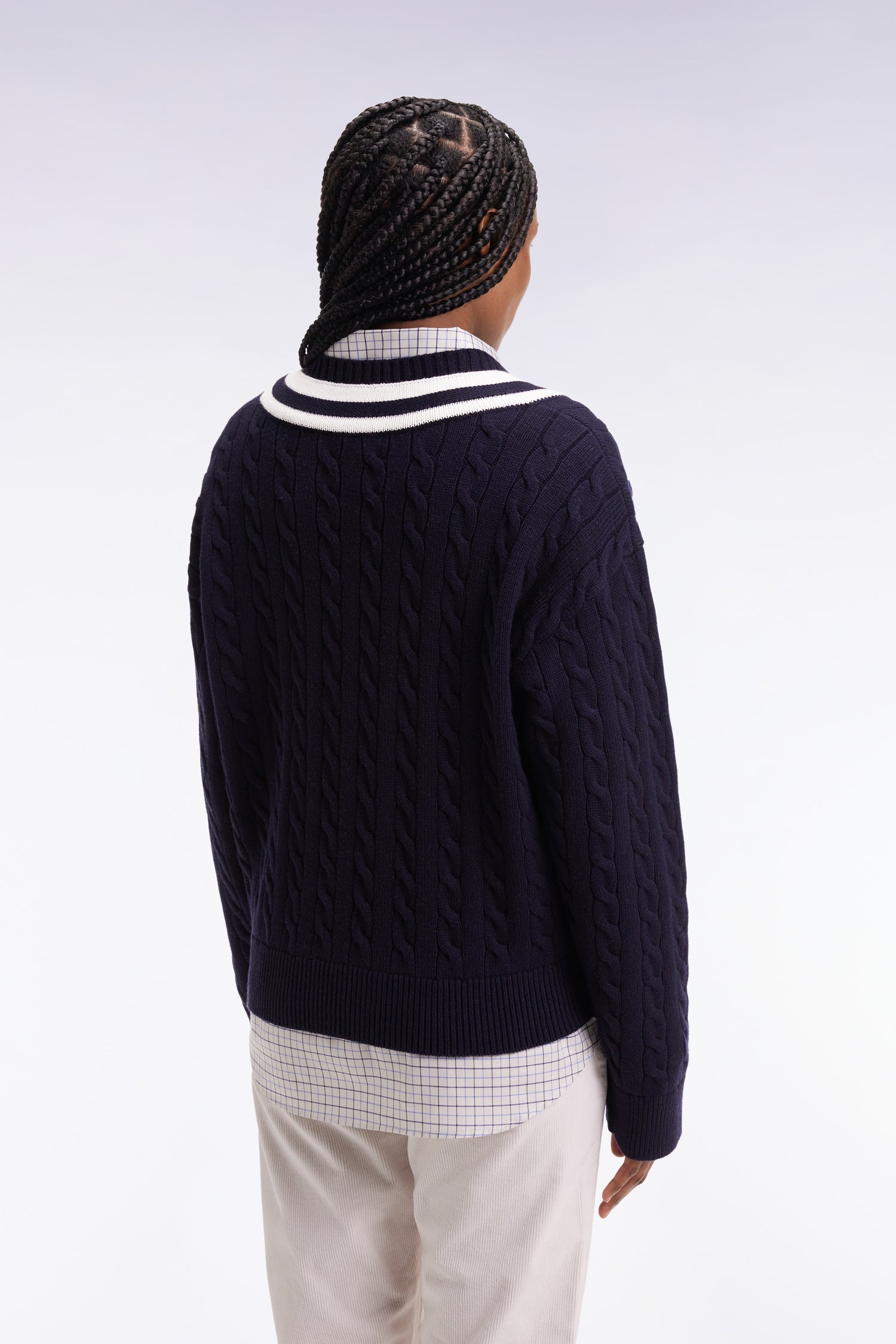 Inspiré des terrains de sport les plus élégants, ce pull cricket revisite l’iconique col en V à rayures contrastées dans une coupe oversized des plus contemporaines. Tricoté dans une maille torsadée marine à la douceur enveloppante grâce à l’alliance laine et coton, ce pull femme mêle esprit preppy et style urbain. À porter avec une chemise accessoirisée d’une cravate et un pantalon large pour cultiver l’élégance décontractée propre à notre maison
