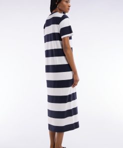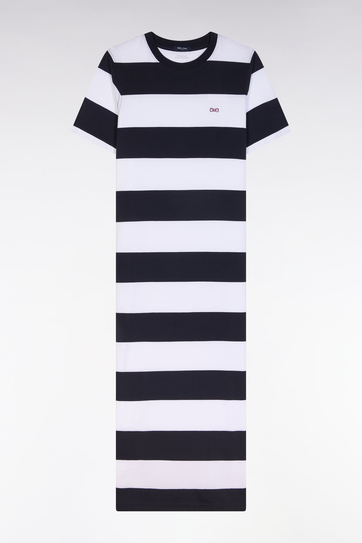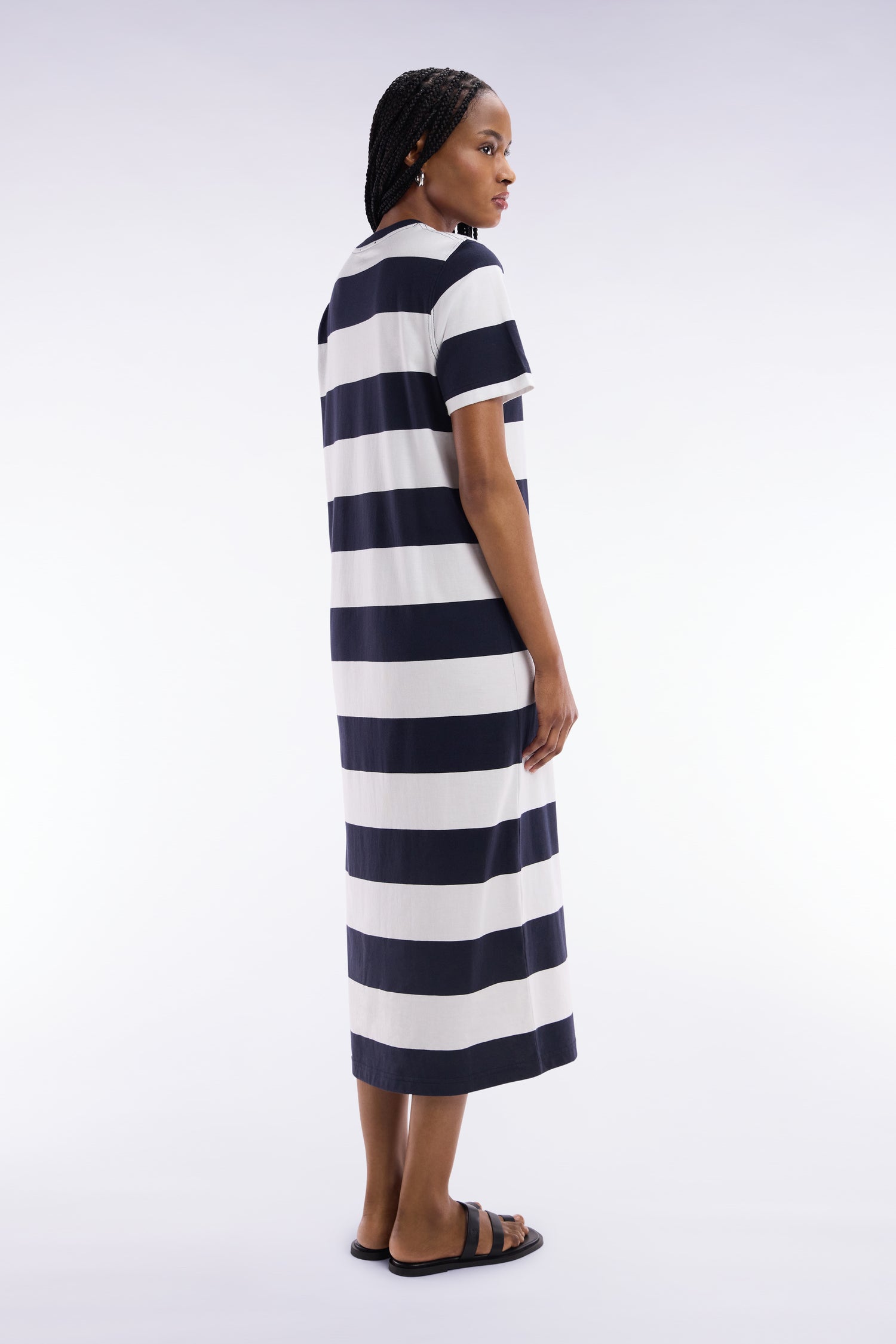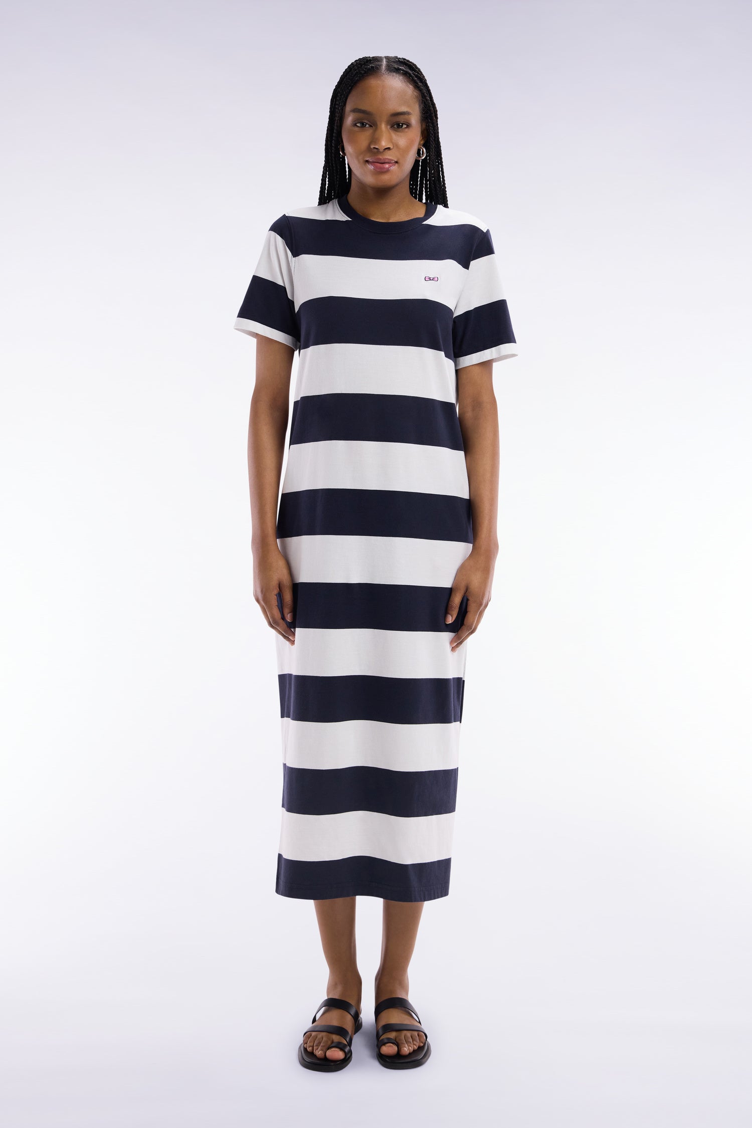 Plus proches du cerclage des maillots de rugby que de la classique marinière, les rayures de cette robe en coton apporteront à vos tenues d’été une touche sport-chic et graphique. Pour sublimer votre quotidien, notre Maison a sélectionné un coton Pima péruvien écoresponsable, réputé pour sa douceur soyeuse et sa tenue exceptionnelle. Avec son col rond et ses manches courtes, cette robe T-shirt longue promet une silhouette tendance. À Porter avec des sandales comme avec une paire de baskets basses.