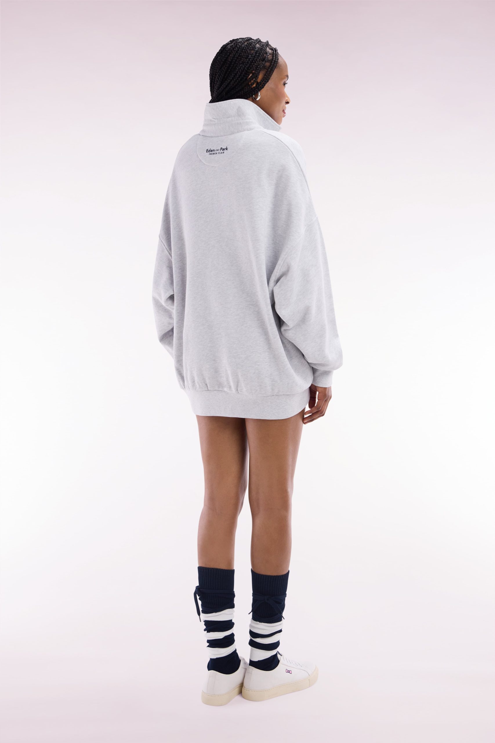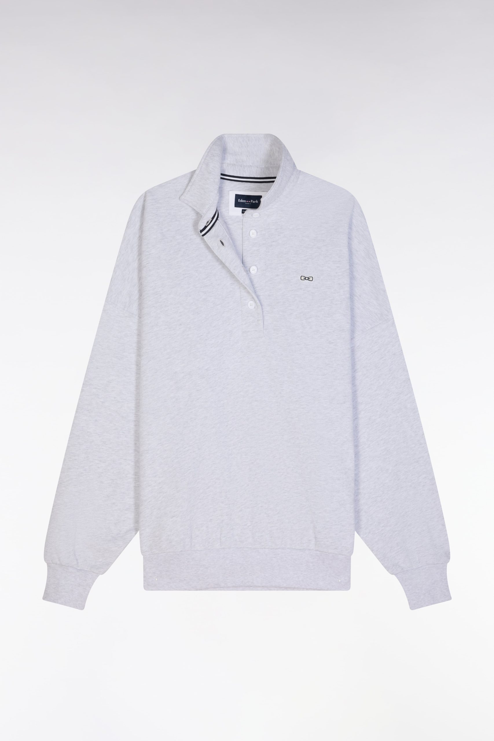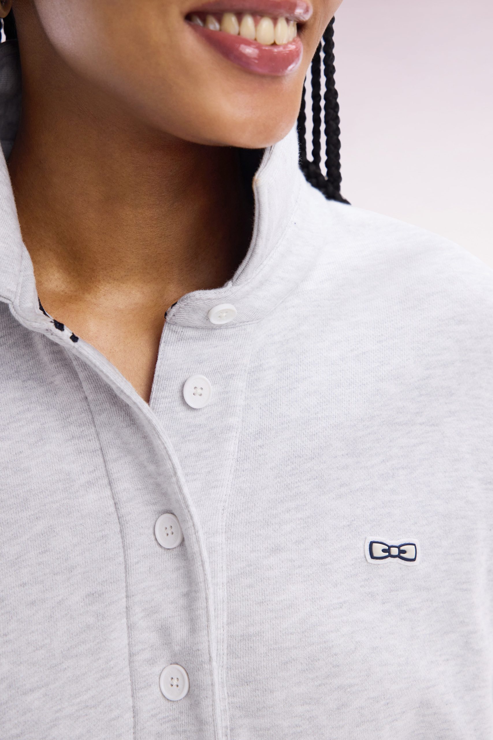Adoptez une silhouette décontractée avec ce sweatshirt gris confectionnée dans une coupe oversized dans un molleton non gratté pour plus de douceur. Inspiré du style rugby avec son col maillot emblématique, il est rehaussé d’un badge nœud papillon en silicone sur une base en feutre. Un modèle sport-chic à associer avec le short assorti pour une tenue coordonnée et tendance.