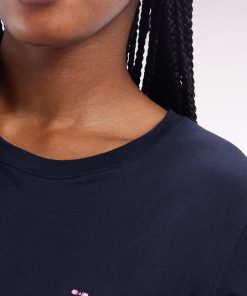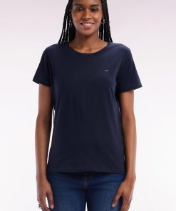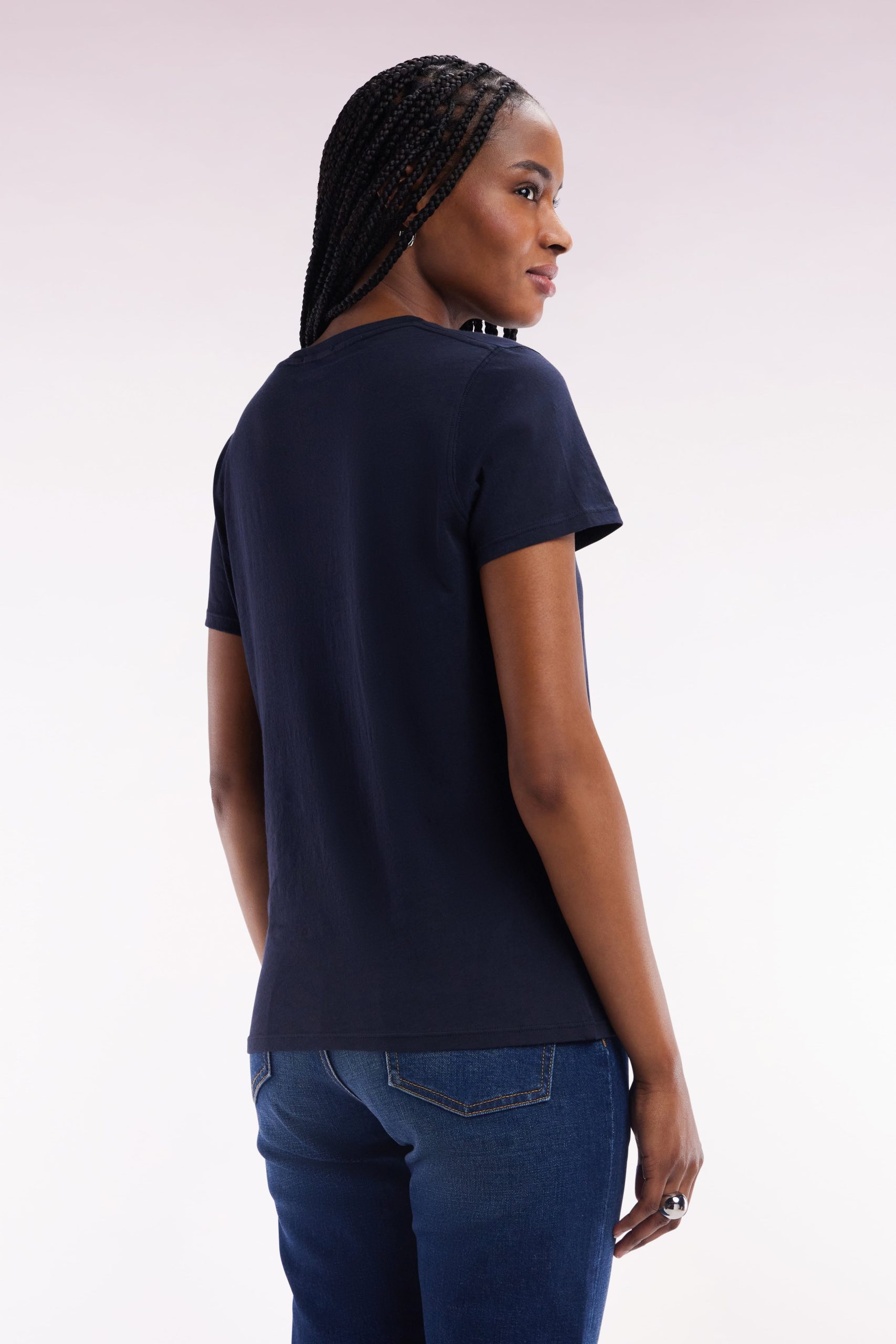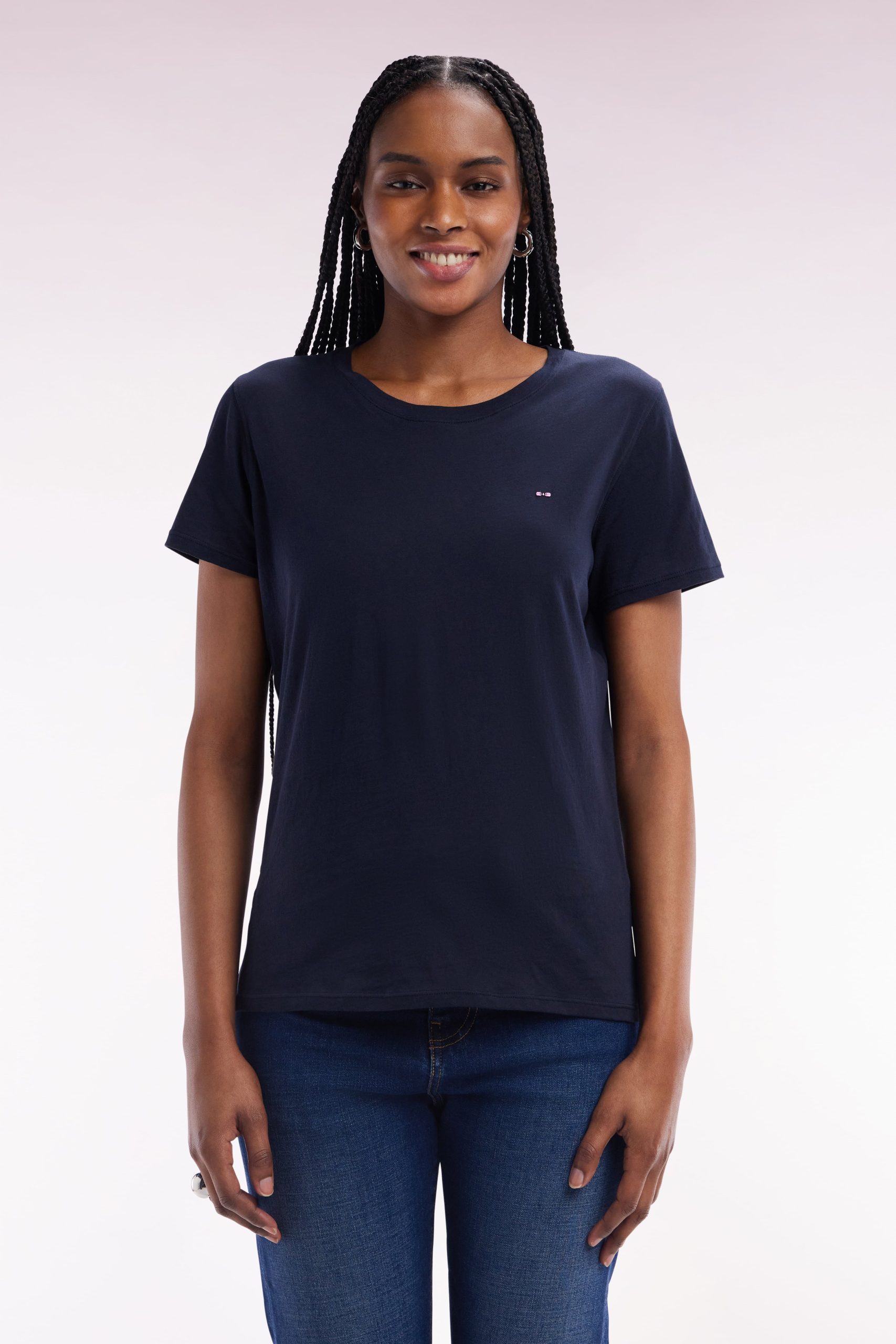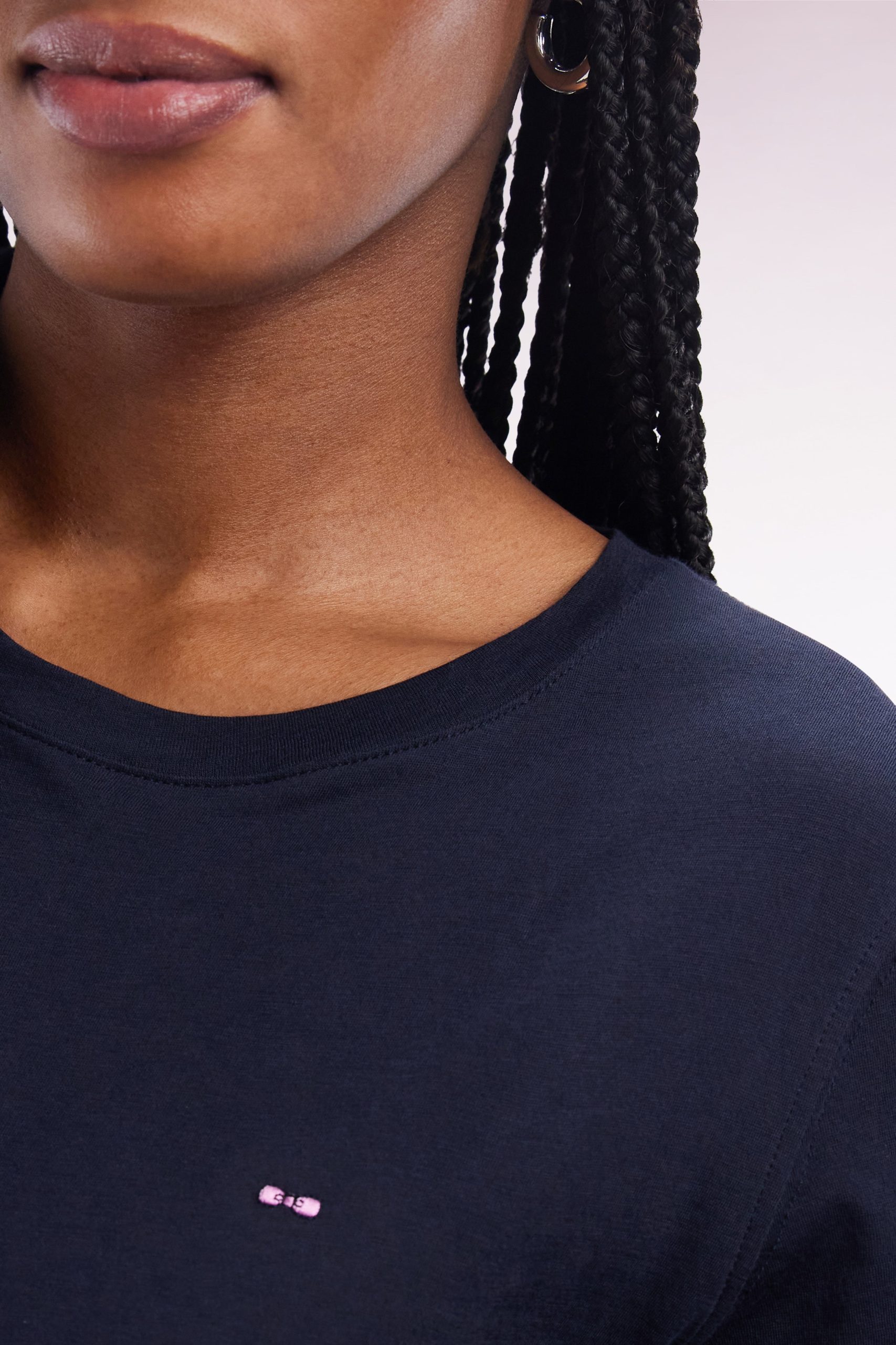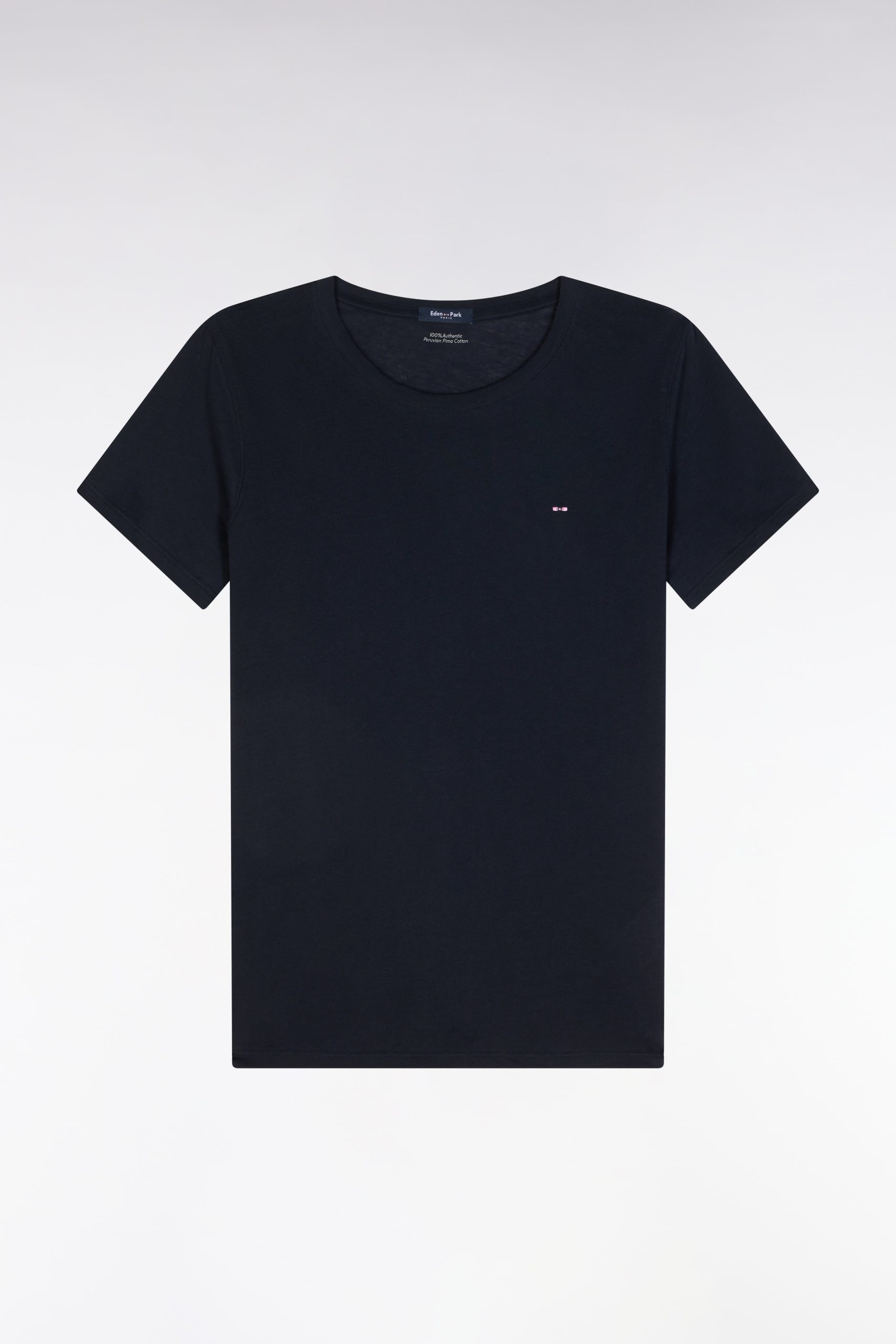 Ce T-shirt uni en 100% coton, réalisé dans un jersey léger, revisite les essentiels du vestiaire féminin. Confectionné à partir de coton Pima péruvien, éthique et durable, ce modèle garantit une tenue impeccable et un confort optimal, saison après saison. Réalisé avec soin, il est proposé en trois coloris intemporels : marine, noir ou blanc. Avec sa coupe droite et son col rond, il s’adapte à toutes vos tenues avec simplicité.