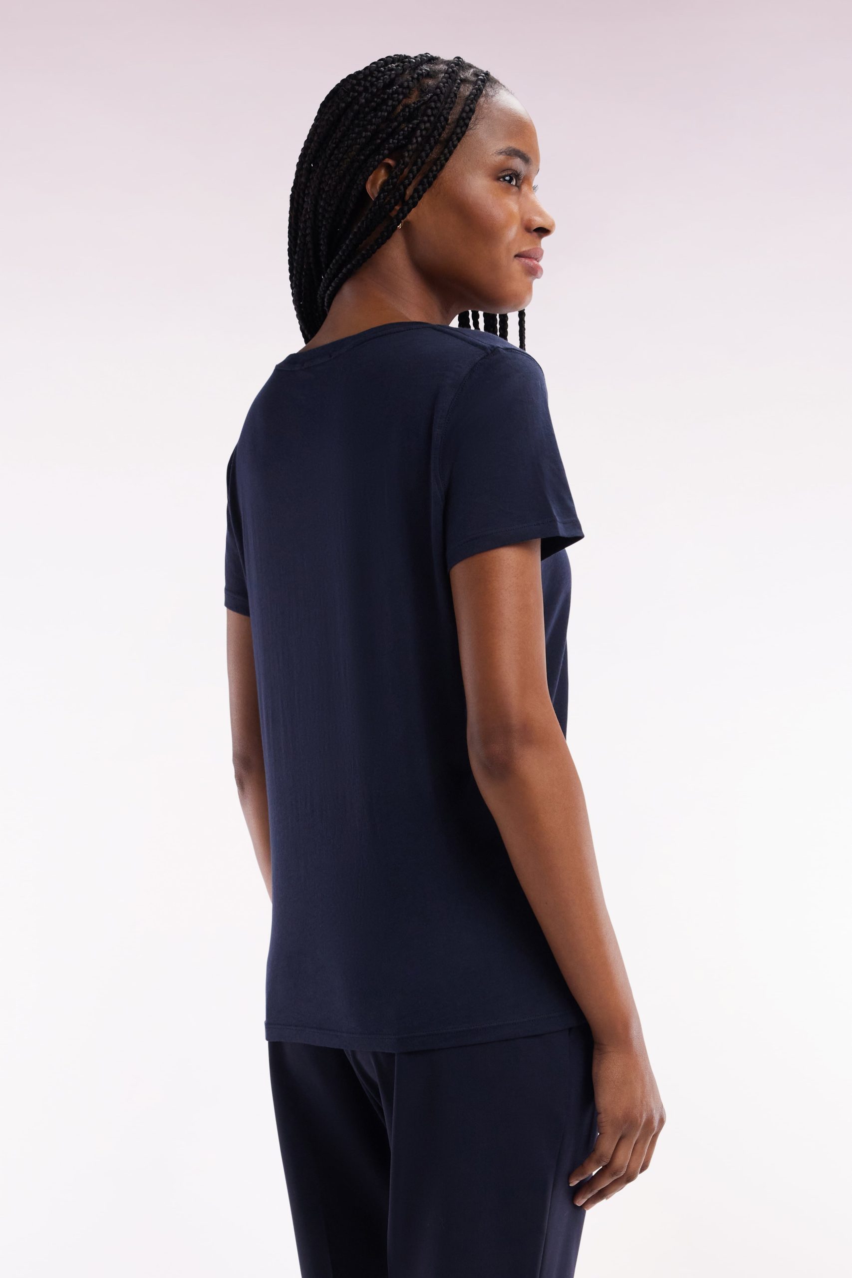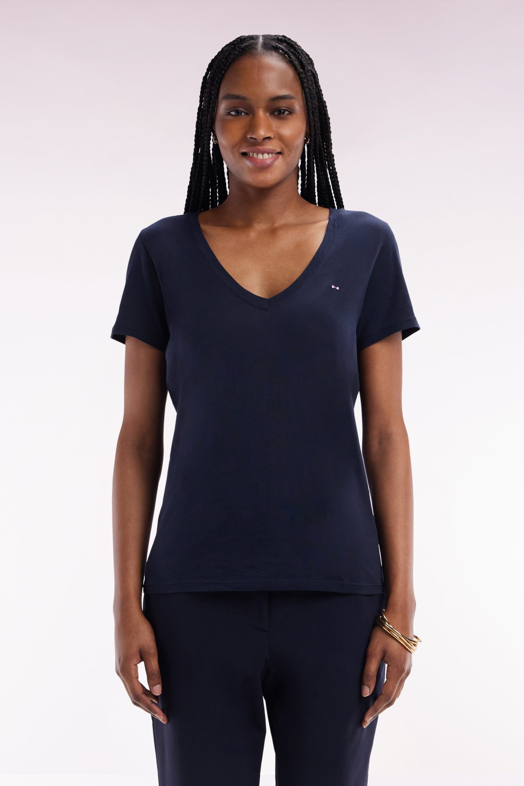 Avec son col V subtilement échancré, ce T-shirt en jersey de coton léger met délicatement en valeur le décolleté. Ce modèle, élégamment brodé de notre emblème, se décline en plusieurs coloris intemporels, parfait pour un style décontracté et raffiné au quotidien. Notre Maison s’engage pour le confort et la durabilité en sélectionnant pour ce modèle un coton Pima péruvien d’exception, issu de méthodes écoresponsables, pour un confort naturel.