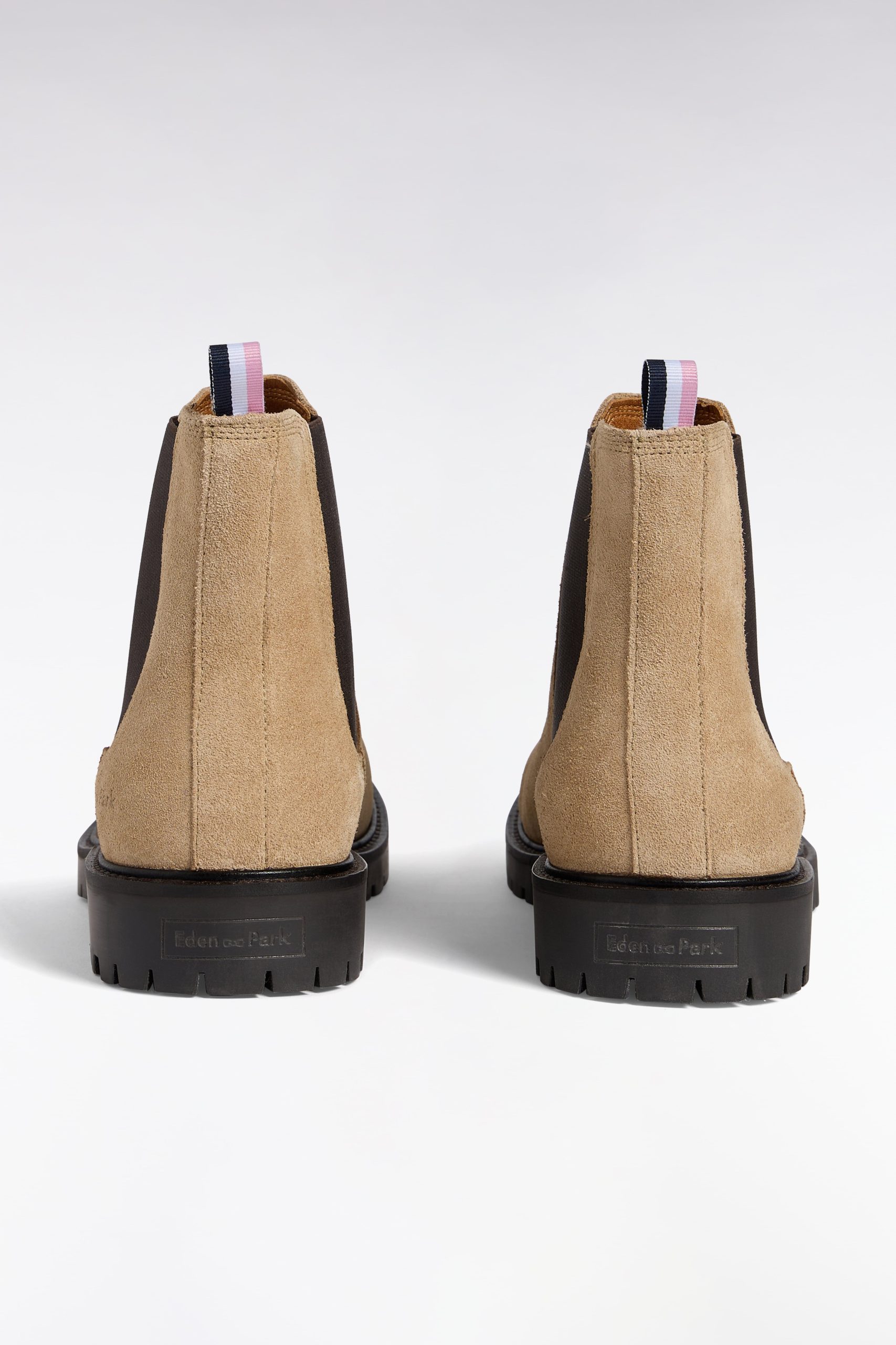 Pensées pour affronter l’hiver avec style, nos Chelsea boots revisitent un grand classique du vestiaire masculin. Confectionnées en cuir suédé beige, noir ou gris, elles conjuguent allure citadine et confort au quotidien. Leur semelle crantée assure une bonne accroche au sol, tandis que les élastiques latéraux facilitent l’enfilage et s’adaptent naturellement à votre pied. À porter avec un jean brut ou un pantalon plus habillé, pour une silhouette chic et décontractée, du matin jusqu’au soir. Au dos, un ruban tricolore affiche l’ADN French Flair d’Eden Park