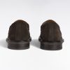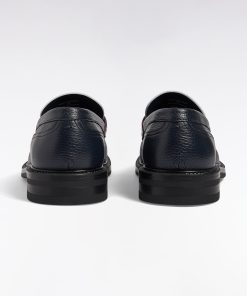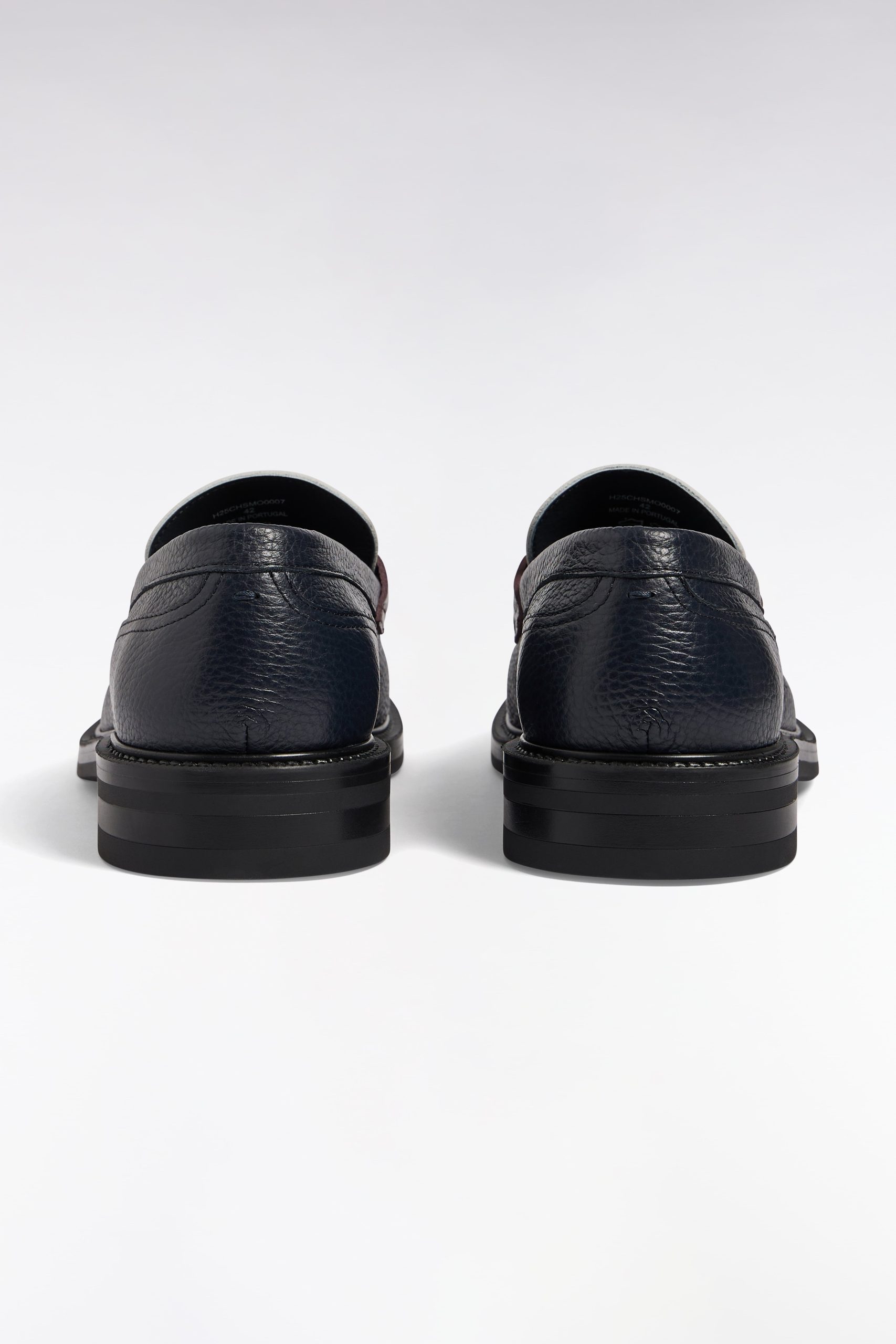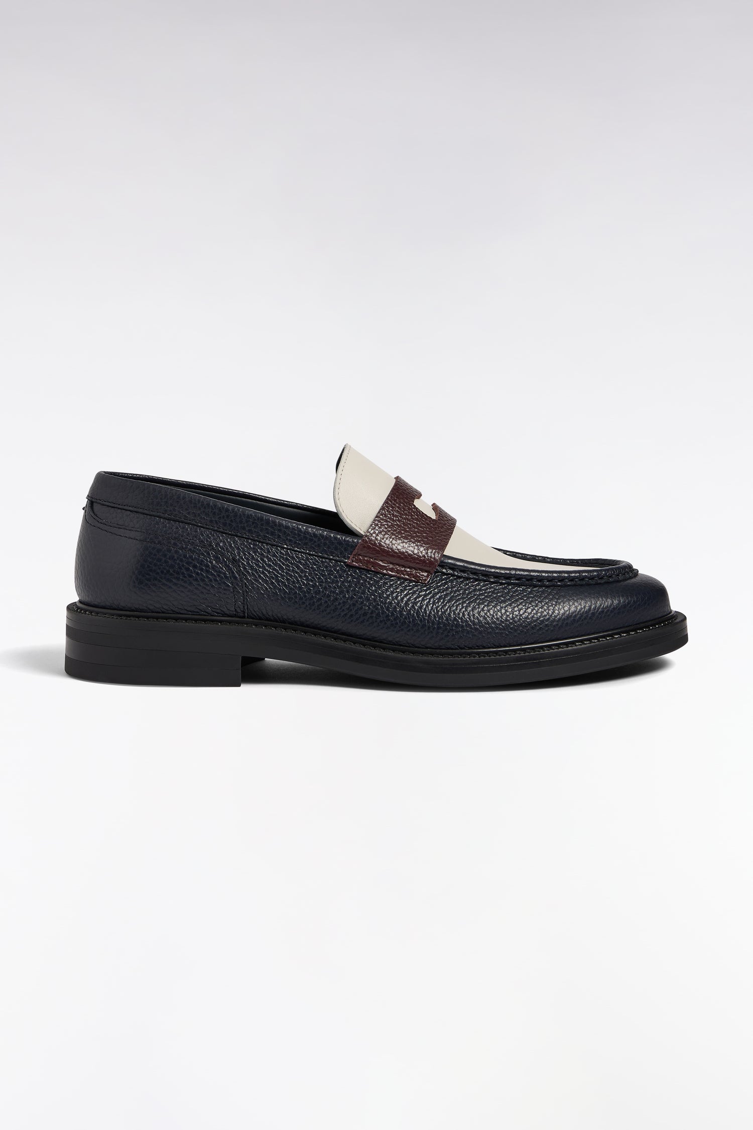 Ce modèle de mocassins masculin revisite le classique et incontournable penny loafer dans une version contemporaine à l’élégance très britannique. Confectionnés en cuir grainé marine, ces mocassins pour homme se distinguent par un empiècement contrasté en cuir lisse écru qui dessine une silhouette audacieuse, sans ostentation. La patte en cuir grainé marron, ornée d’une découpe en forme de nœud papillon, évoque discrètement l’ADN d’Eden Park. Leur semelle lisse assure confort et stabilité au quotidien. Un soulier à l’allure racée, parfait pour rehausser vos tenues formelles comme vos tenues plus urbaines