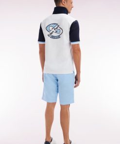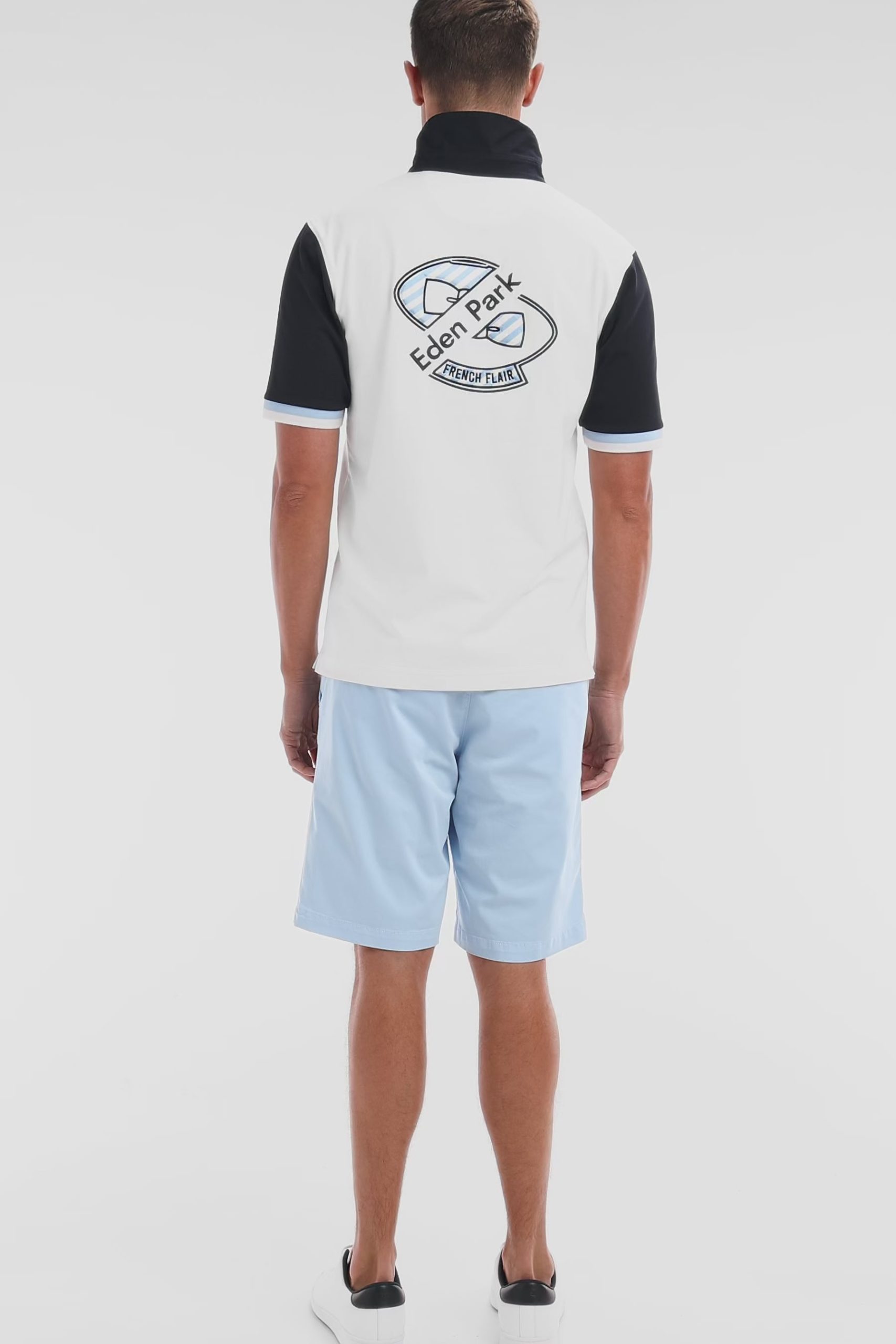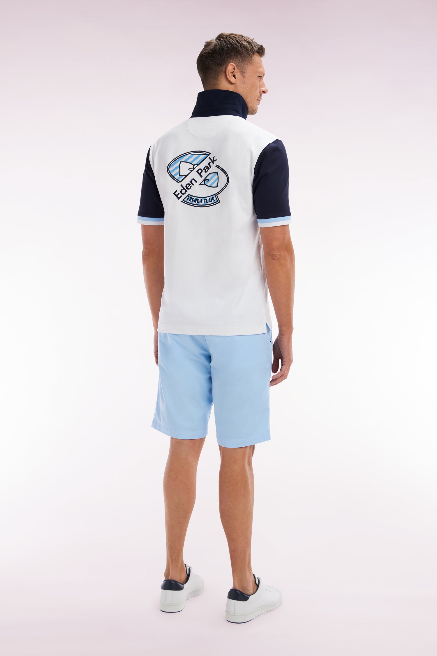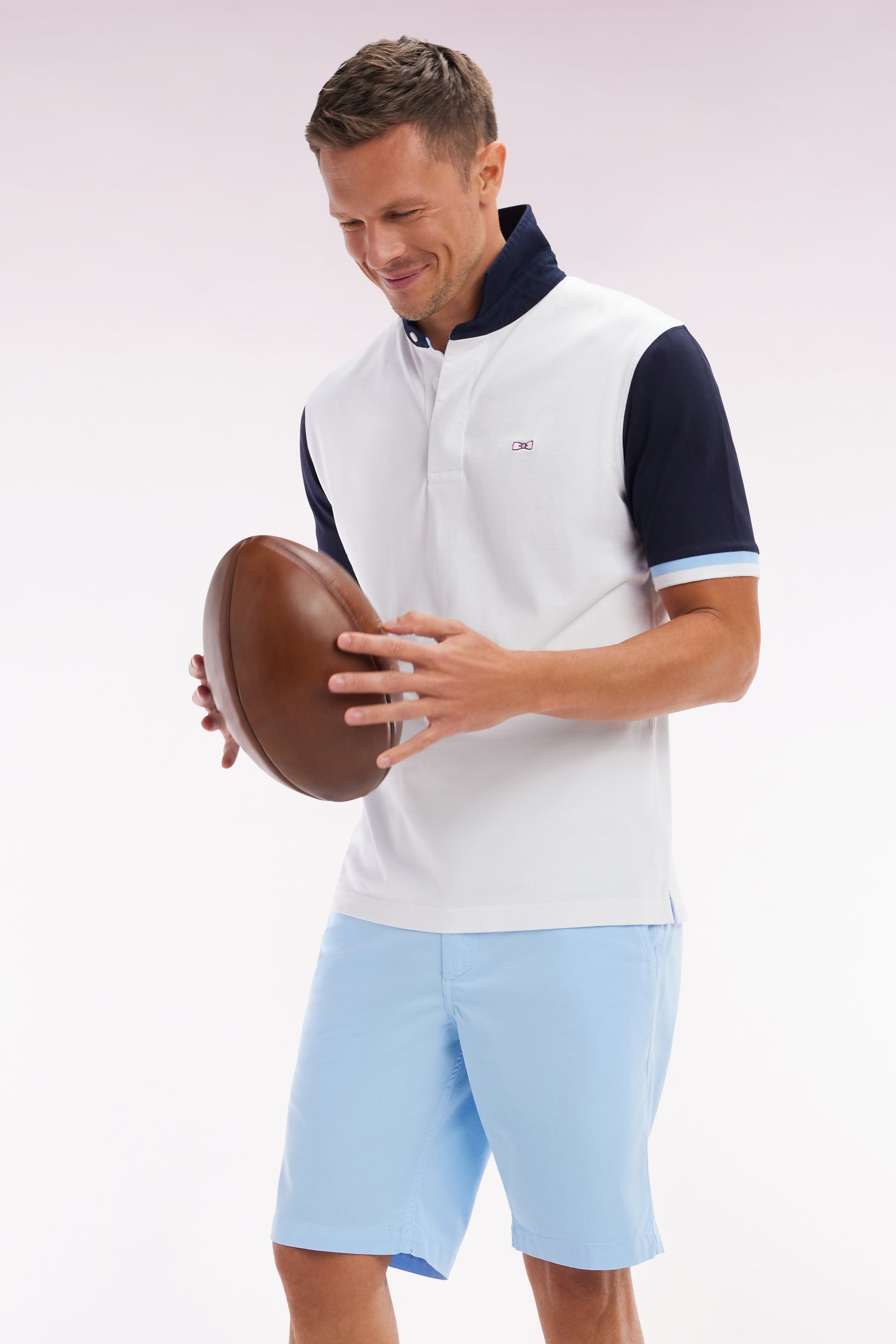 Ce bermuda chino en gabardine de coton stretch est parfait pour l’été. Avec ses poches côtés, ses poches dos double passepoil et son ruban ottoman tricolore brodé sur la poche arrière, il allie confort et élégance. Disponible en plusieurs coloris, ce bermuda au chic décontracté s’adapte à tous les styles.