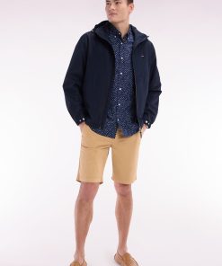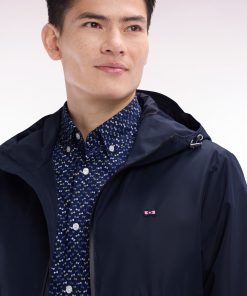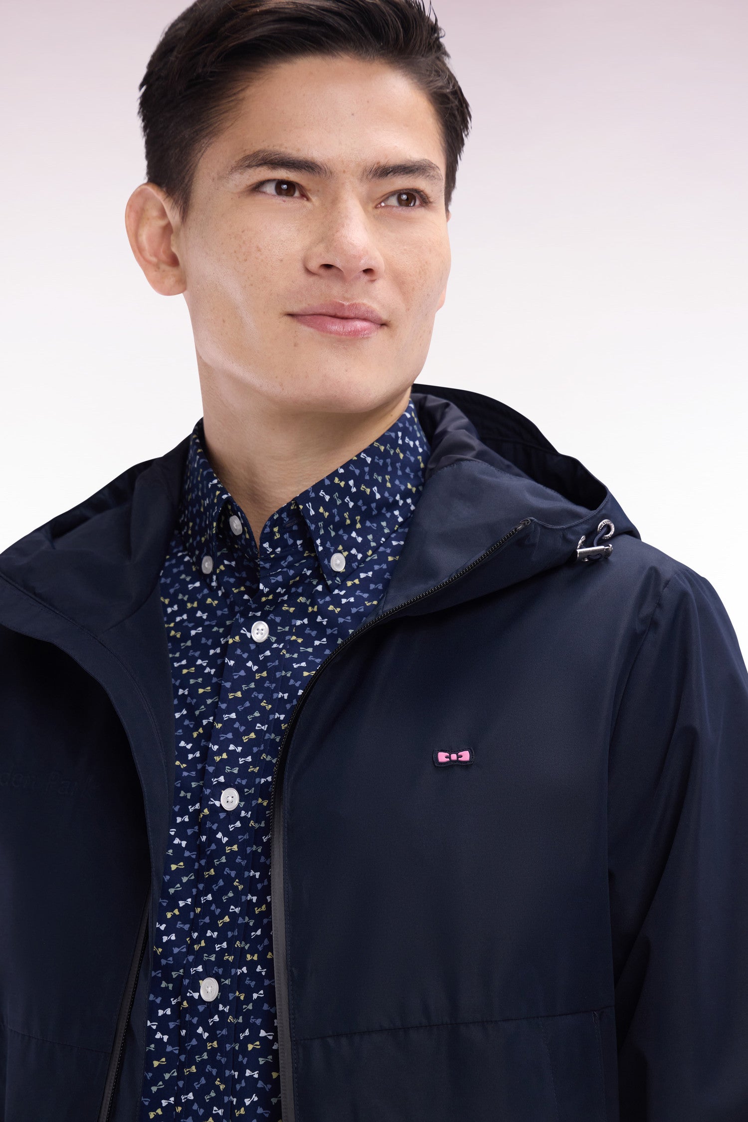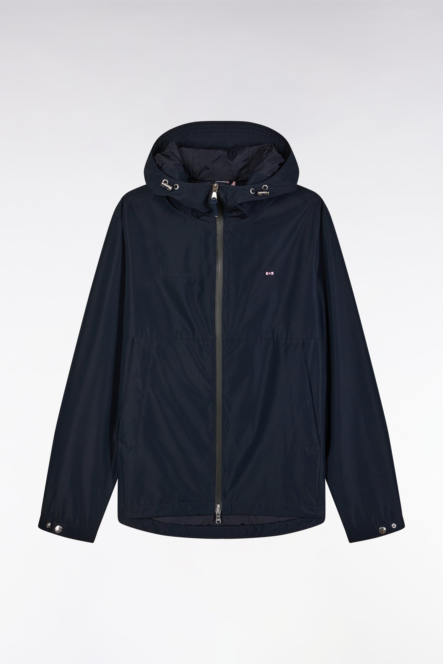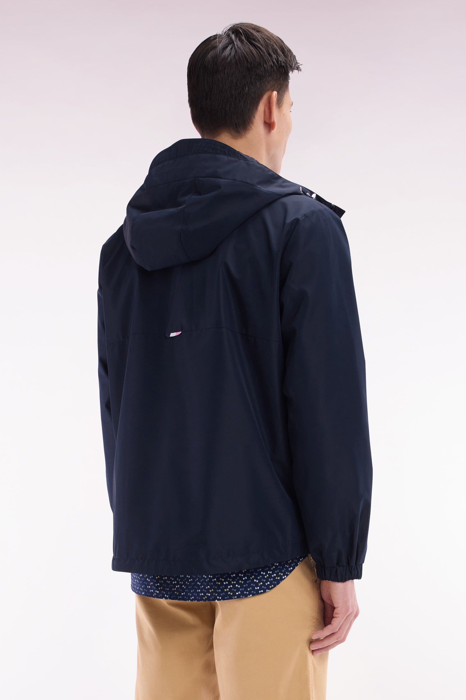 Ce blouson en polyamide soft toucha, doublé en résille et polyamide, se distingue par sa capuche intégrée avec visière surpiquée et cordon de serrage, pour un style fonctionnel et moderne. Le jeu de découpes sur le devant et le dos, ainsi que les bords-côtes aux poignets et à la taille, apportent une touche dynamique. Doté de poches zippées et de détails signature comme le nœud gomme et le logo embossé, ce coupe-vent masculin allie praticité et élégance, idéal pour une tenue urbaine chic par tous les temps.