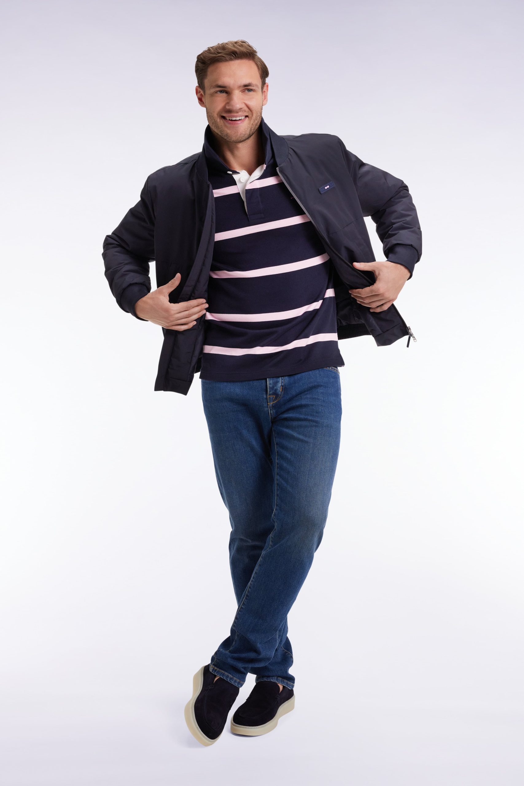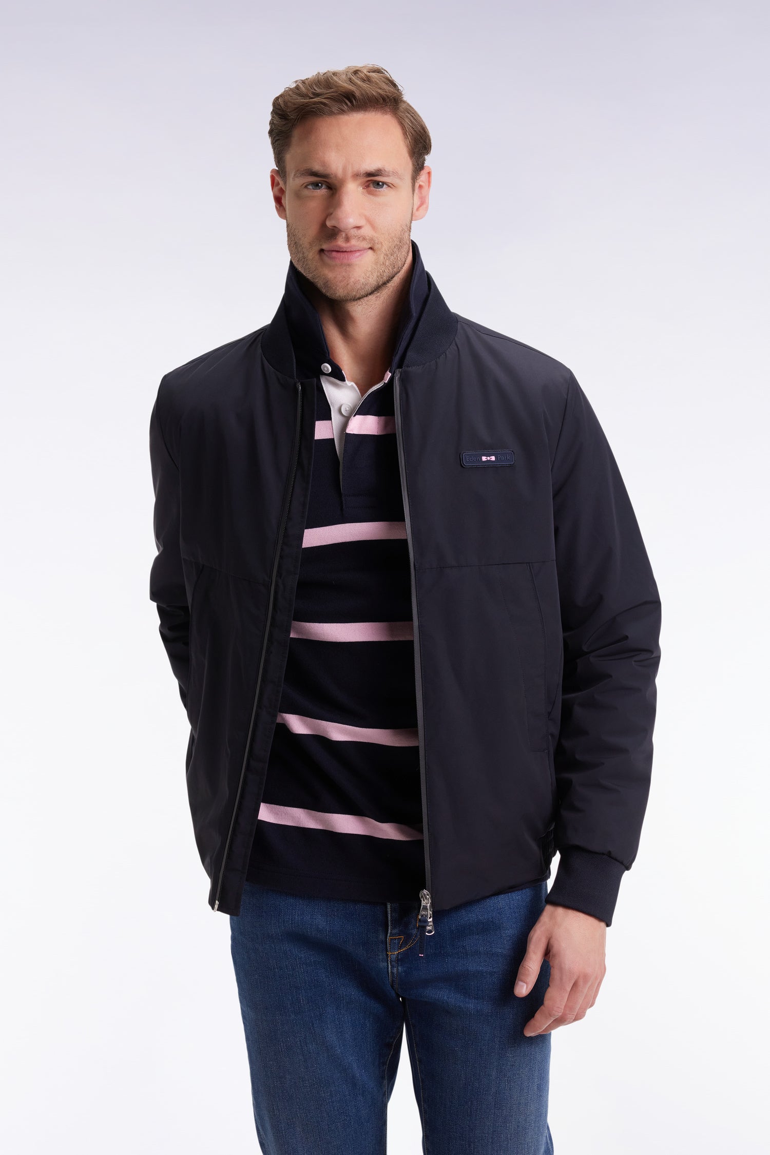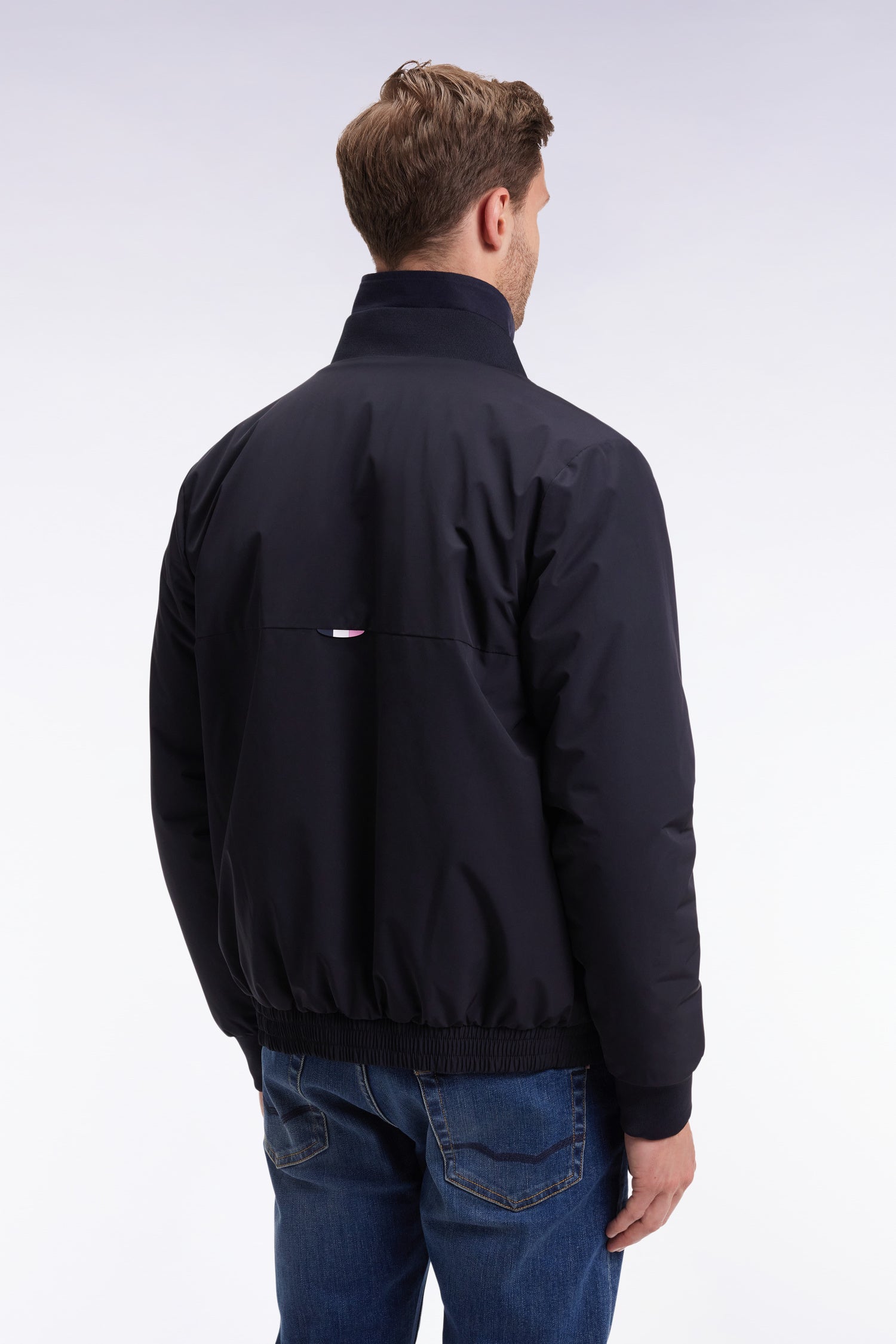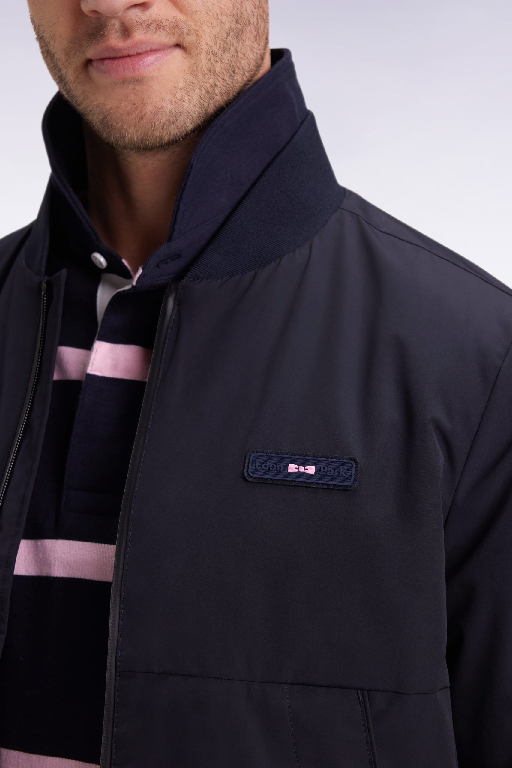 Élégance sportive et détails techniques pour ce blouson Starter marine en nylon doublé de nylon ouatiné. Le jeu de découpes sur le devant et le dos structure la silhouette, tandis que les finitions soignées : zip Aquagard, poches zippées passepoilées et bords-côtes en soulignent le caractère. L’inimitable touche Eden Park ? Un ruban tricolore subtilement glissé sous l’encolure et sa barrette logo en gomme !