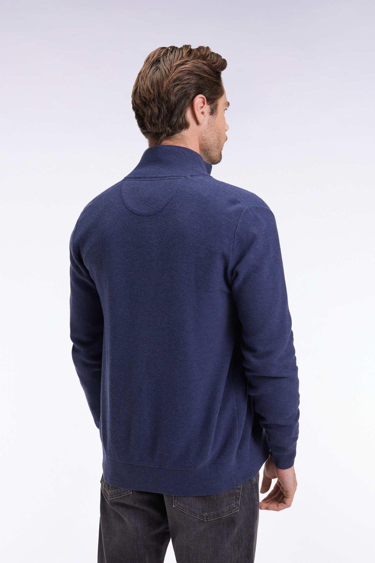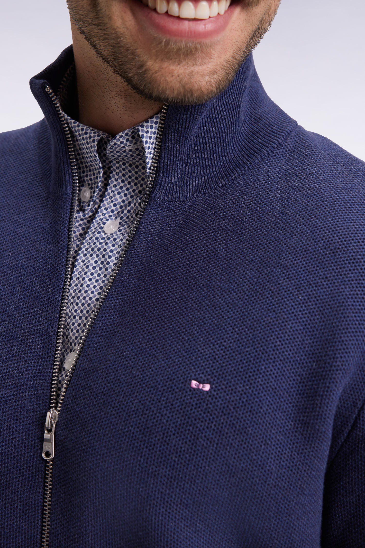 Ce pull zippé à col camionneur alliant à la perfection élégance et confort. Confectionné en coton tricoté en nid d’abeille pour un rendu plus texturé, il met en valeur son nœud papillon brodé au fil rose, l’emblème iconique de notre maison française. Le col montant zippé et les finitions soignées apportent une touche moderne à ce cardigan col camionneur proposé dans plusieurs coloris classiques