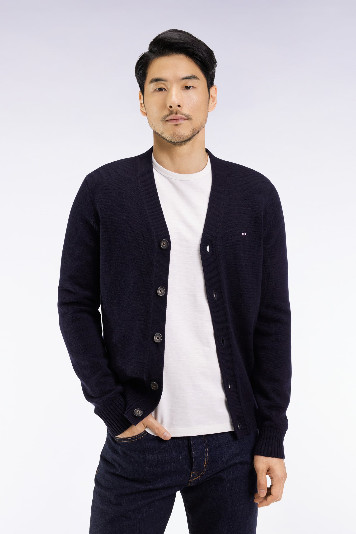 Le style de notre maison se reconnaît à ses équilibres subtils : rigueur de la coupe, matières de qualité et liberté du détail. Avec sa maille épaisse tricotée à plat dans un doux mélange laine – coton, ce cardigan col V incarne l’alliance parfaite entre savoir-faire et durabilité. Pensée pour durer, sa construction robuste et ses finitions soignées, de la patte de boutonnage aux bords-côtes, en font une pièce forte du vestiaire masculin, capable de traverser les saisons sans perdre de son élégance. La broderie nœud papillon rose signe discrètement cette pièce d’exception, fidèle à l’héritage Eden Park