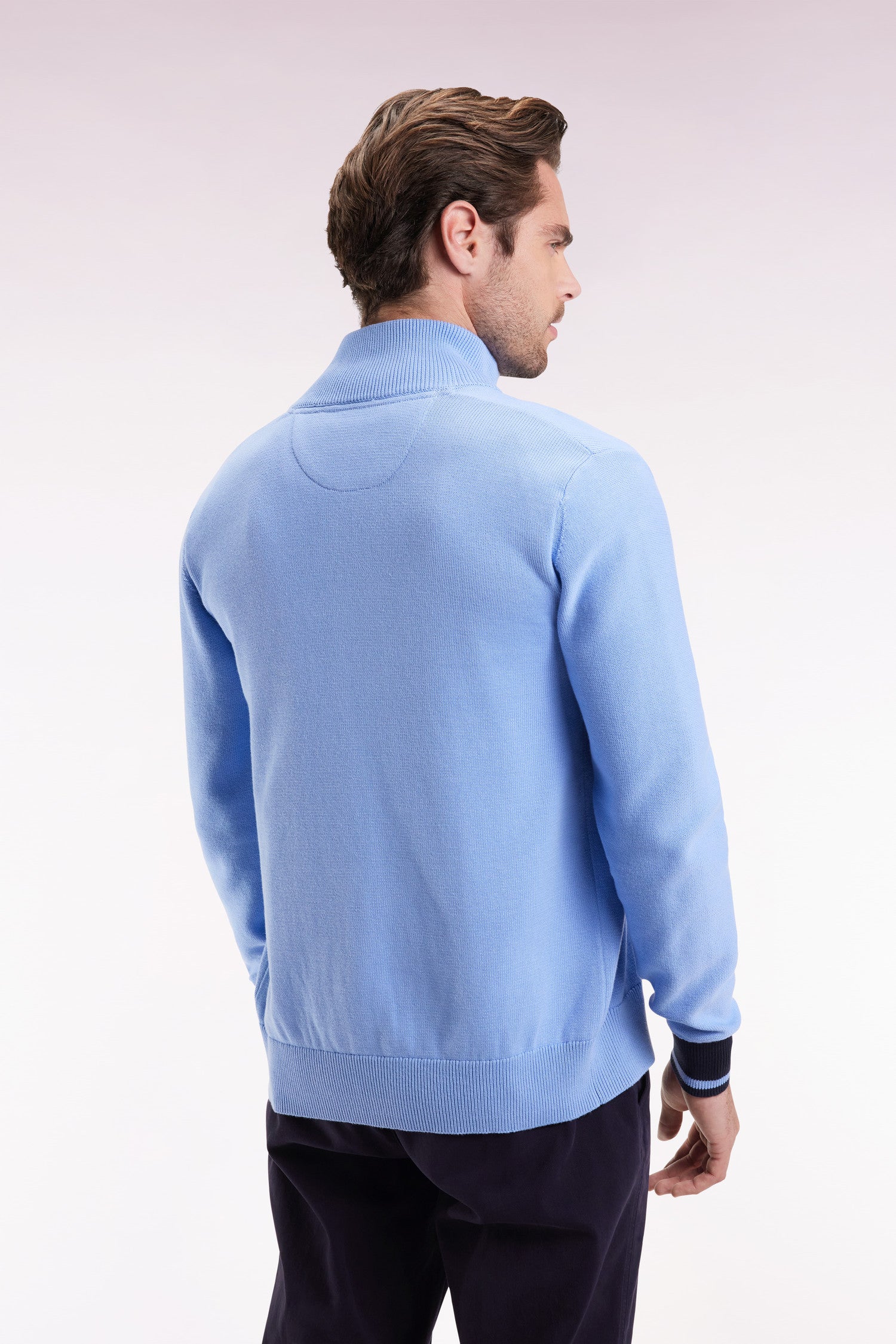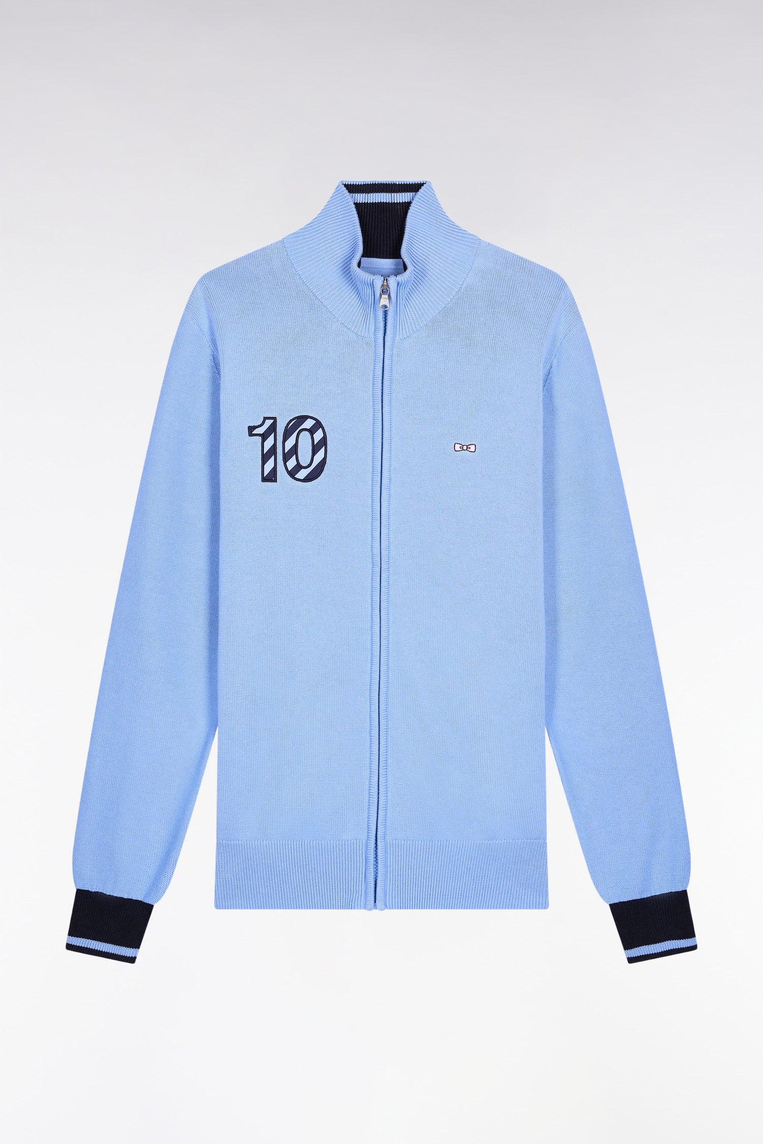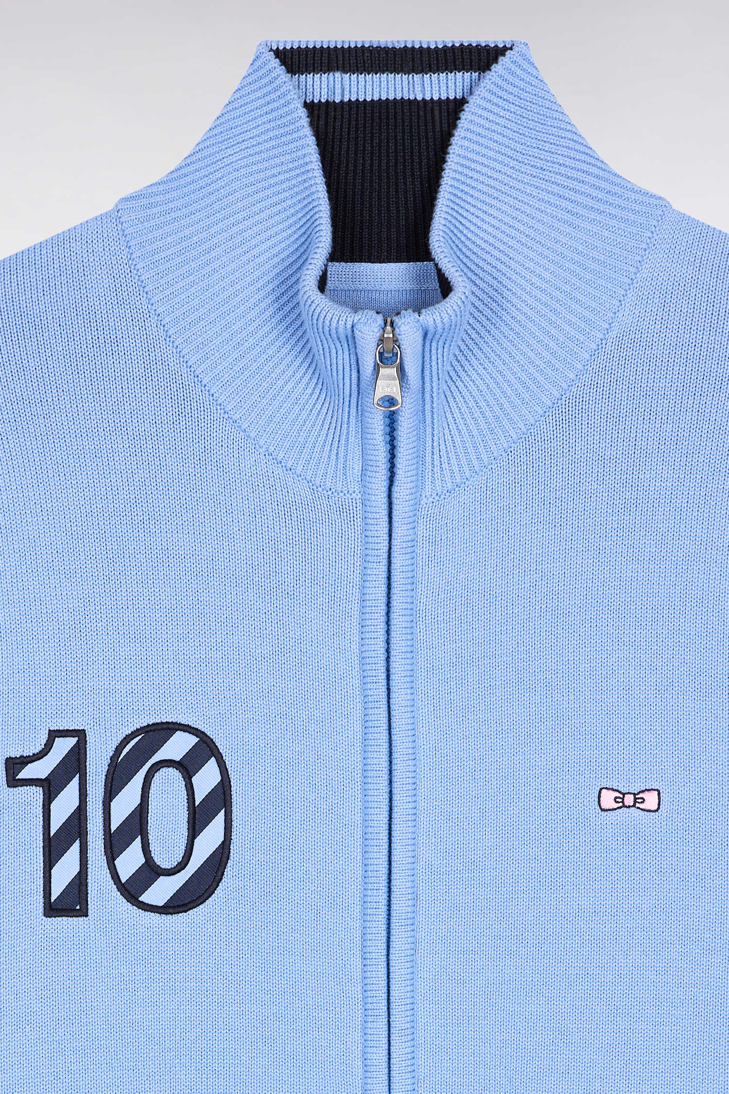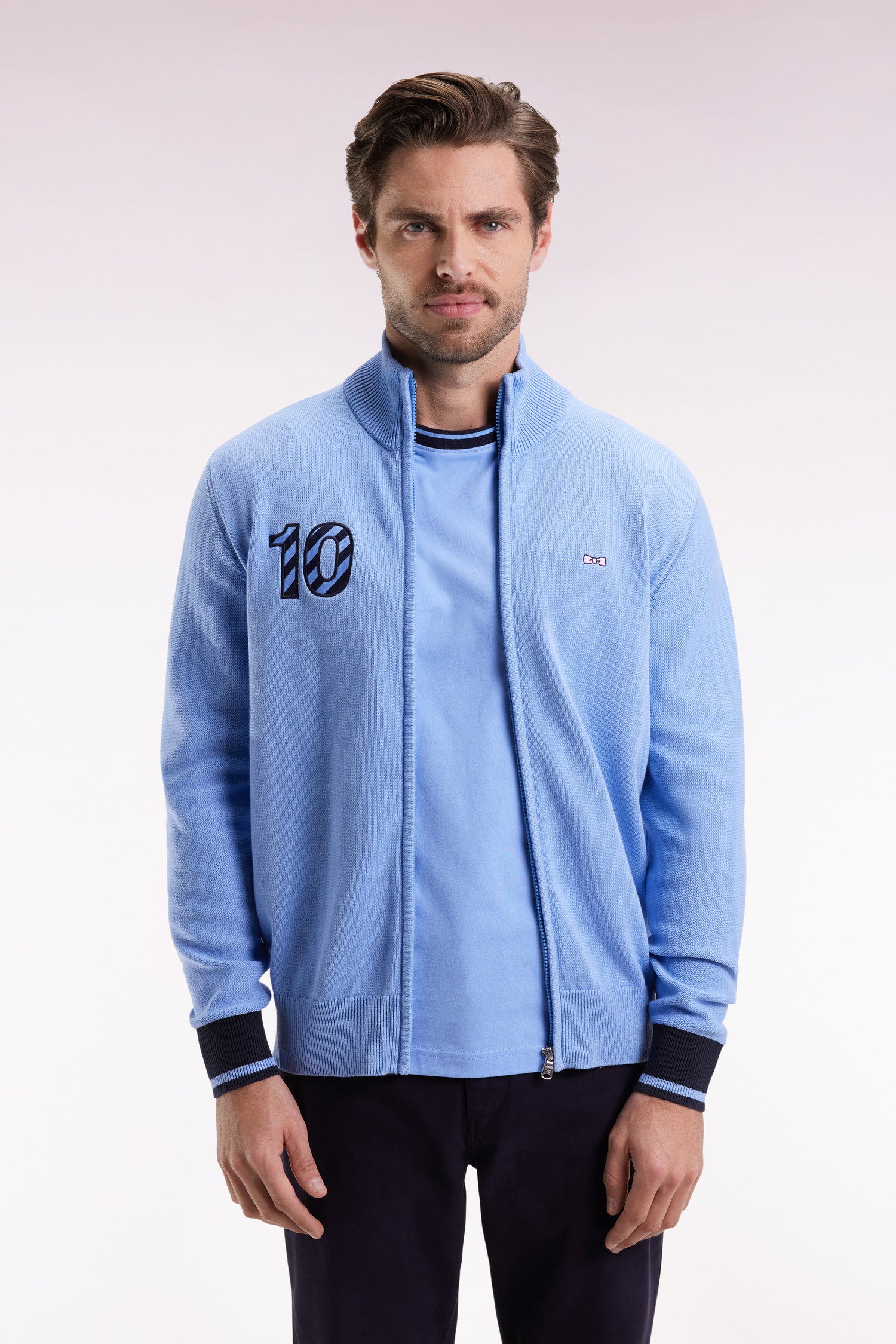 Ce cardigan zippé à col montant affirme son caractère sport-chic à travers ses jeux de textures entre point jersey et jersey envers. Ses bords-côtes manches et sa broderie 10 rehaussée d’une application de tissu cravate apporte une touche graphique discrète. Une pièce confortable et soignée, pensée pour rythmer les silhouettes du quotidien
