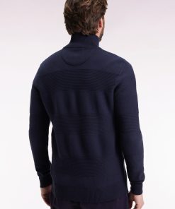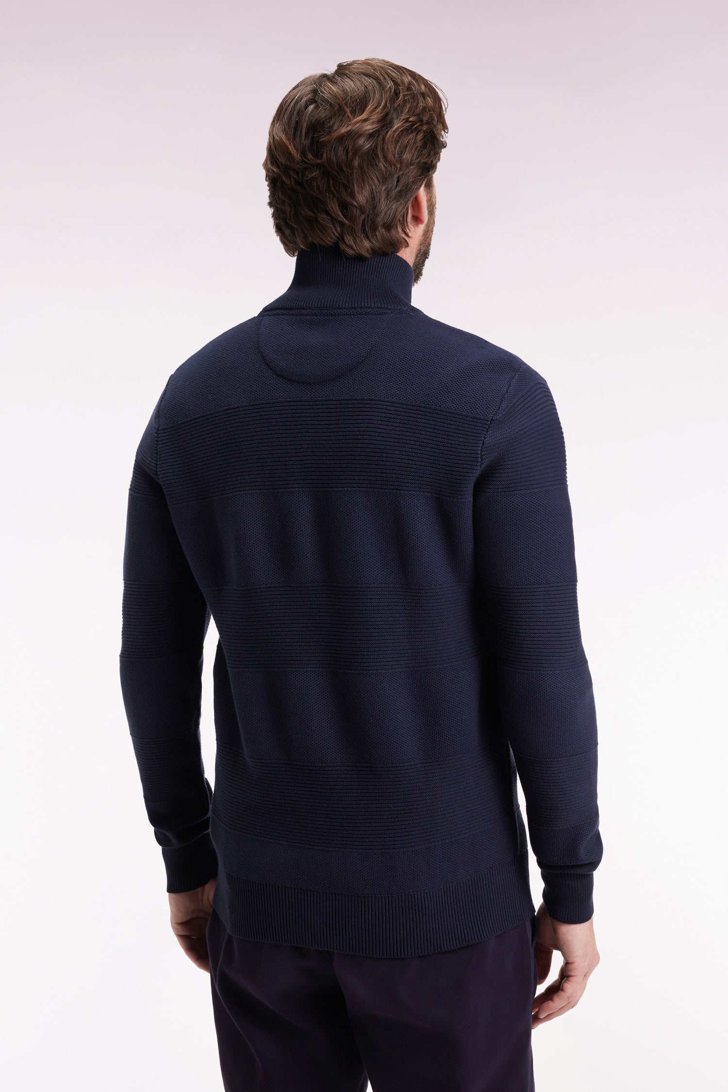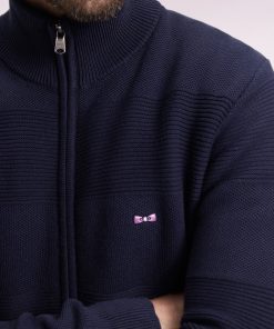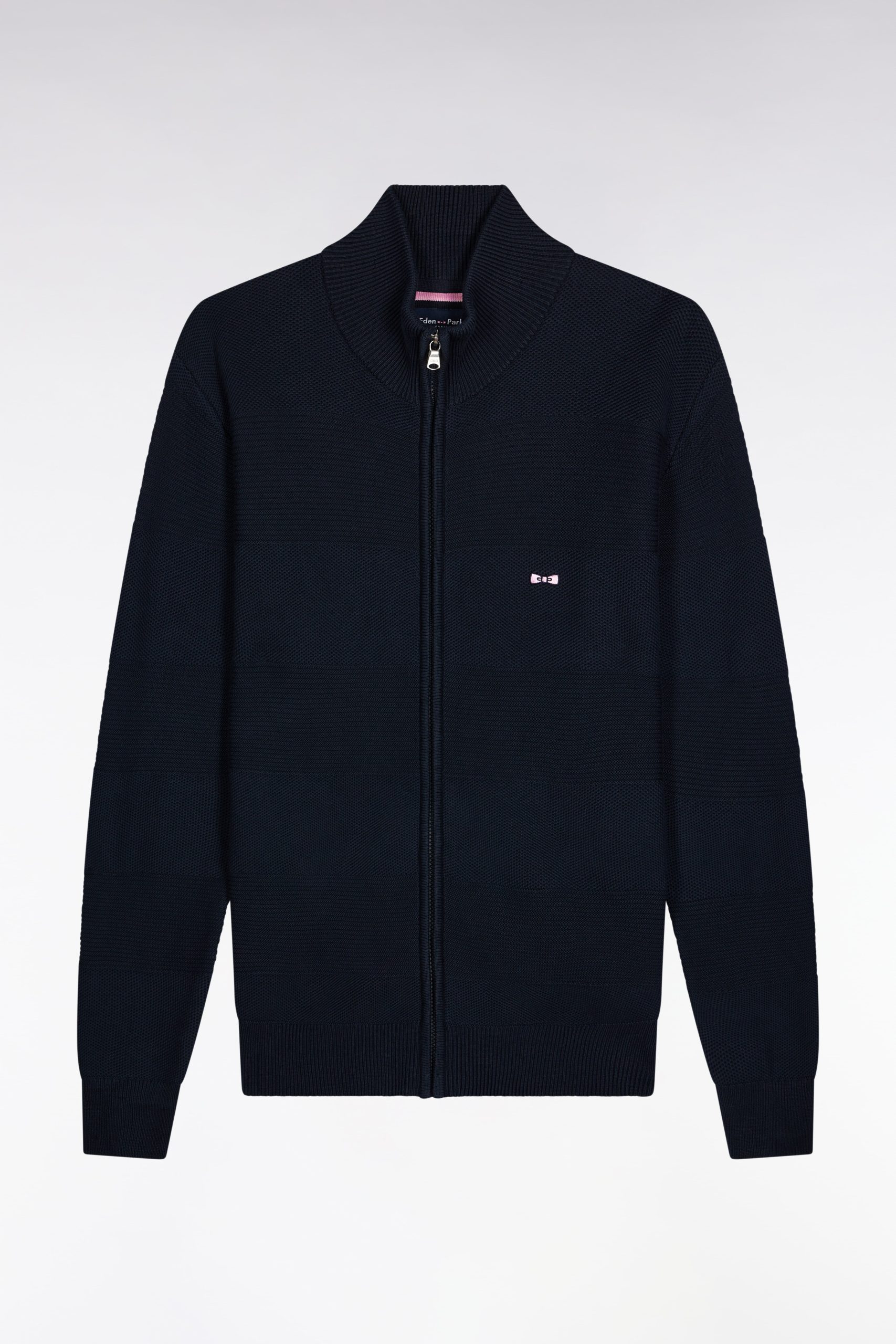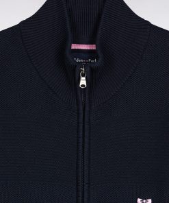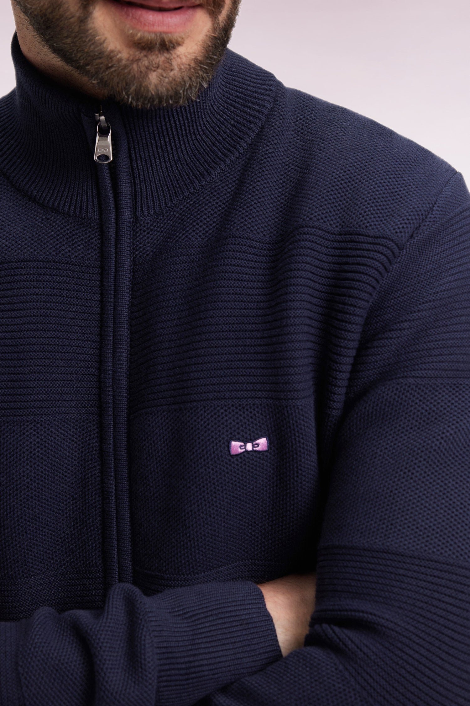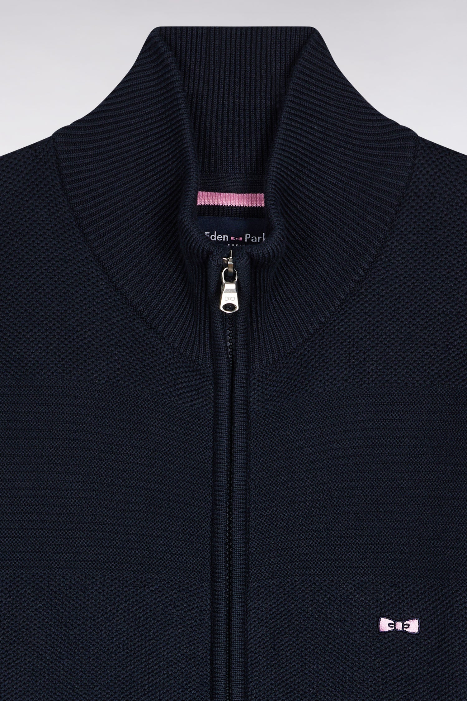 Ce cardigan zippé en coton tricoté séduit par ses jeux de points qui apportent en trompe-l’œil un effet de rayures rugby. Le col montant et la broderie poitrine soulignent l’attention aux détails chère à Eden Park. Ce cardigan col camionneur vous est proposé dans nos coloris signature