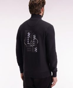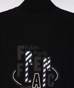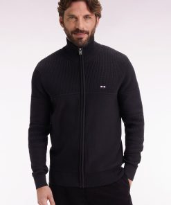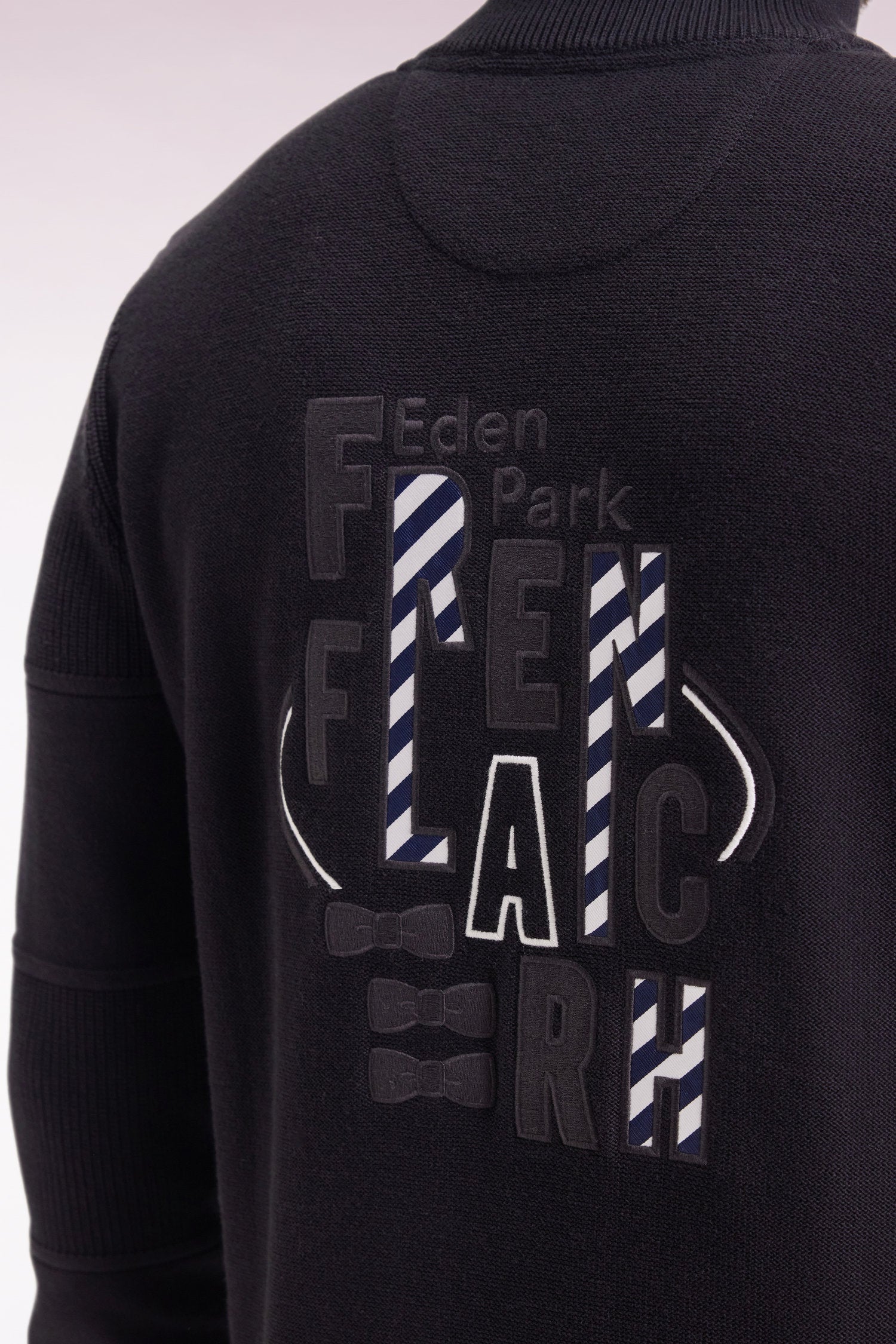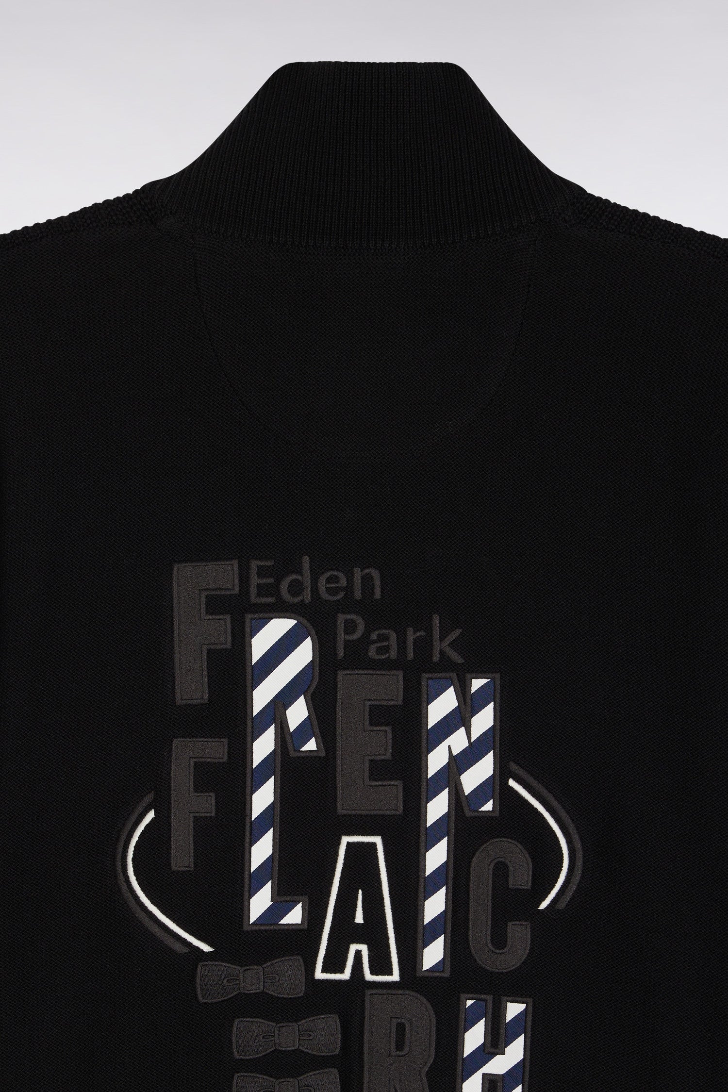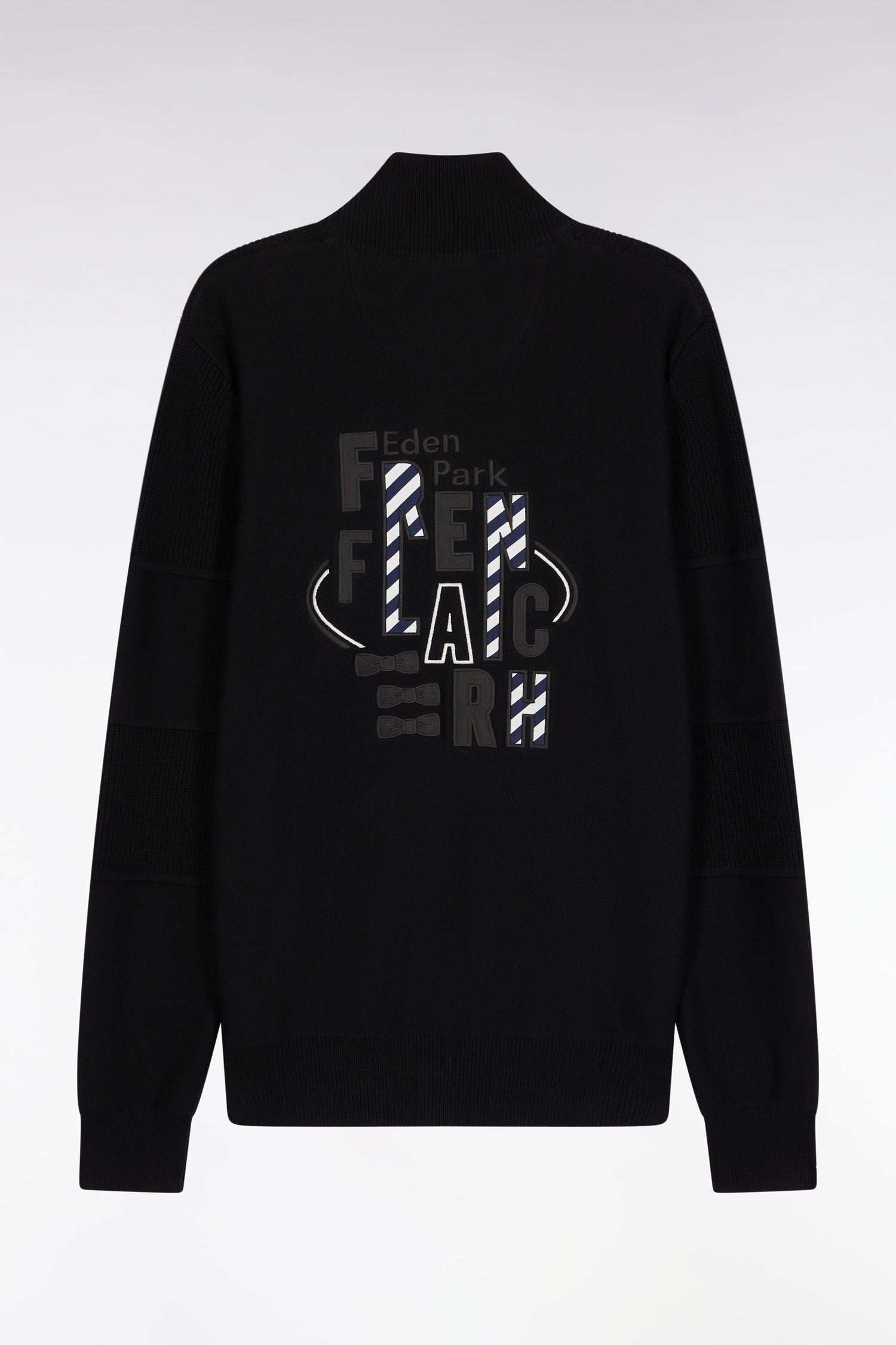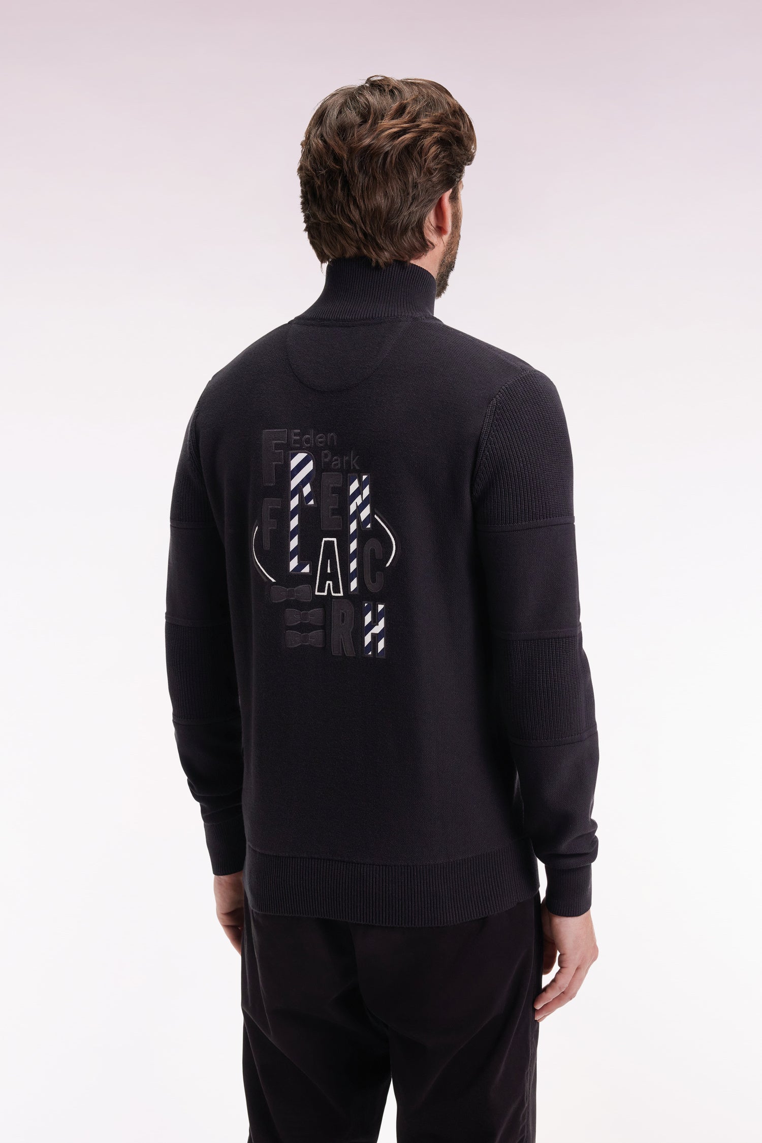 Ce cardigan à zip droit en pur coton tricoté dans un mélange de jersey et côtes anglaise incarne l’esprit sport-chic si propre à Eden Park. Au dos, sa large broderie French Flair est rehaussée d’un tissu cravate rayé : un détail typique du vestiaire de notre maison de mode