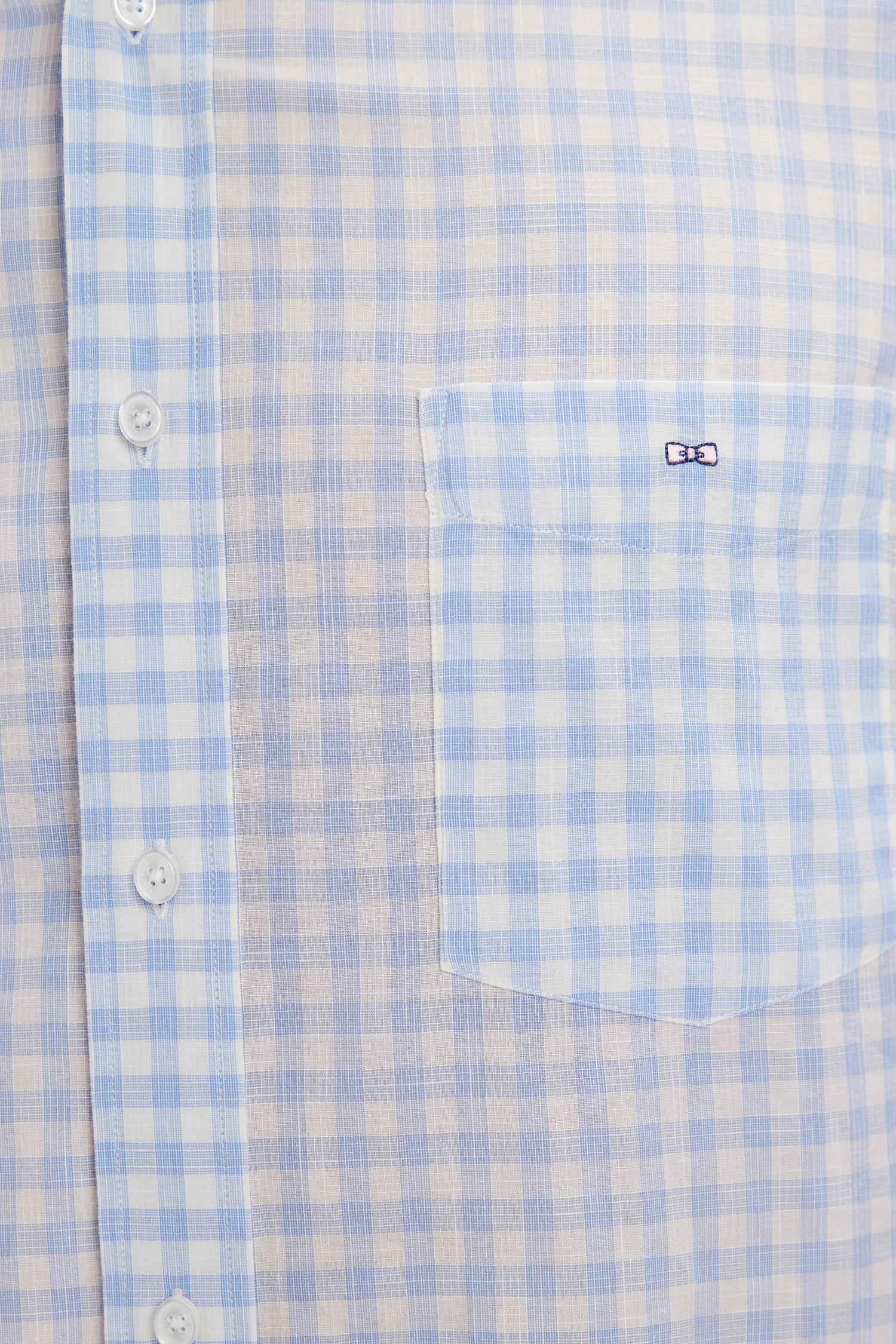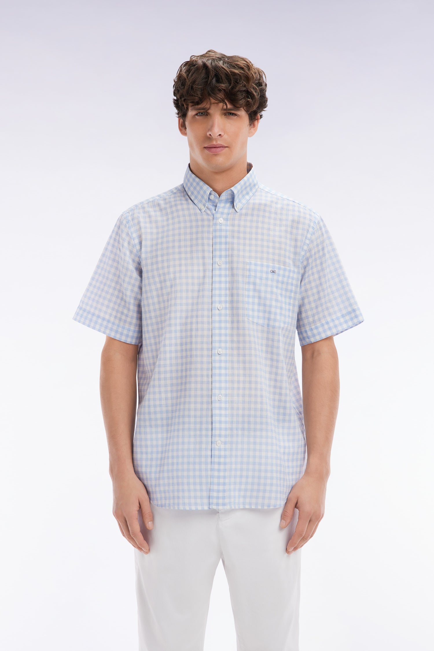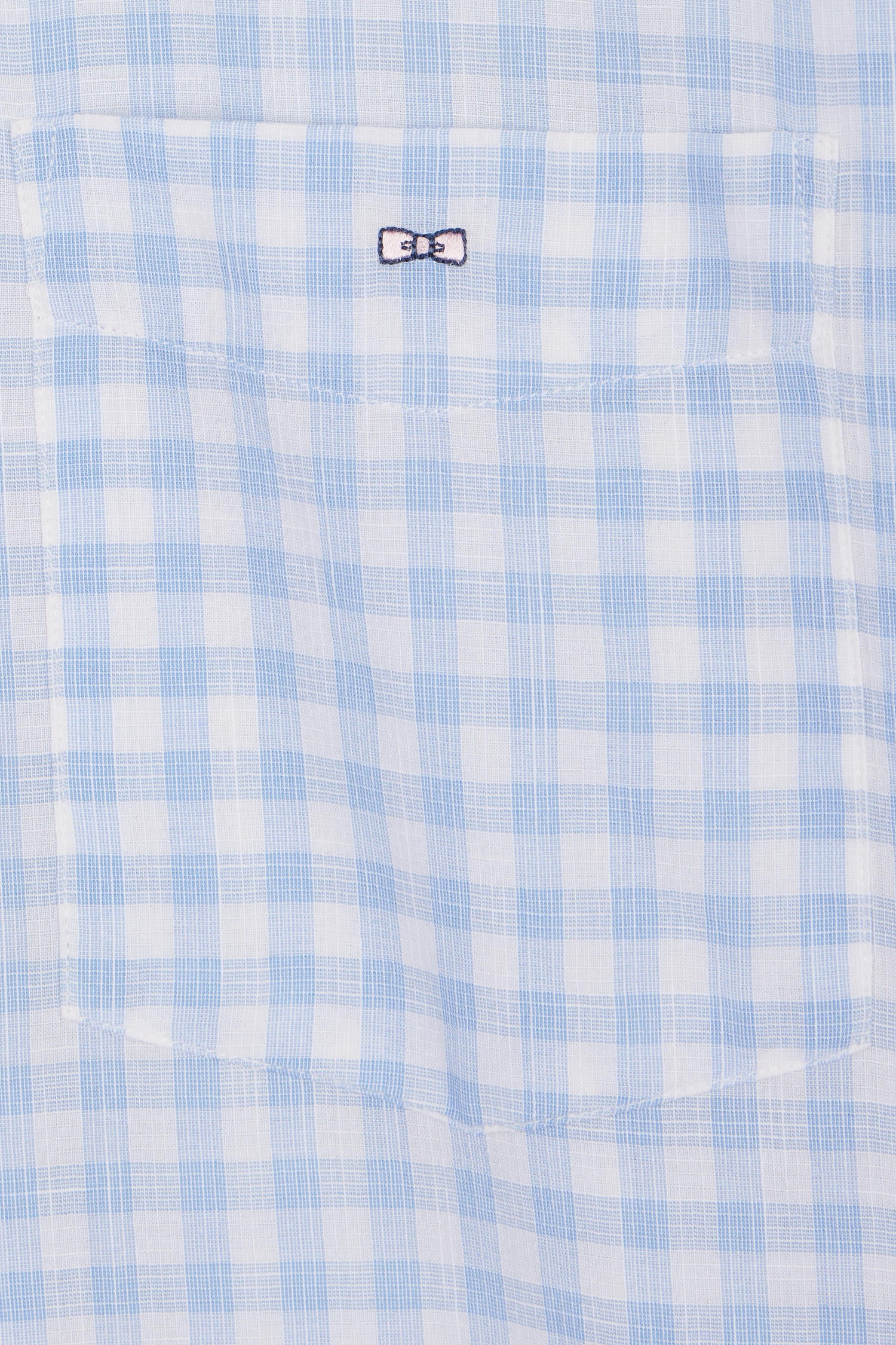 Léger et frais, notre tissu italien à carreaux vichy est conçu pour accompagner vos journées ensoleillées avec élégance. Cette chemisette à coupe droite offre un confort optimal grâce à son coton doux, son pli d’aisance au dos et son col à pointes boutonnées, idéaux pour une allure soignée sans effort. Déclinée en bleu clair ou foncé, elle se distingue par sa poche poitrine brodée du nœud papillon emblématique, signature raffinée de la Maison. Une pièce intemporelle qui incarne un chic décontracté parfait pour la saison printemps-été.
