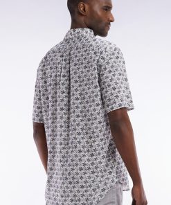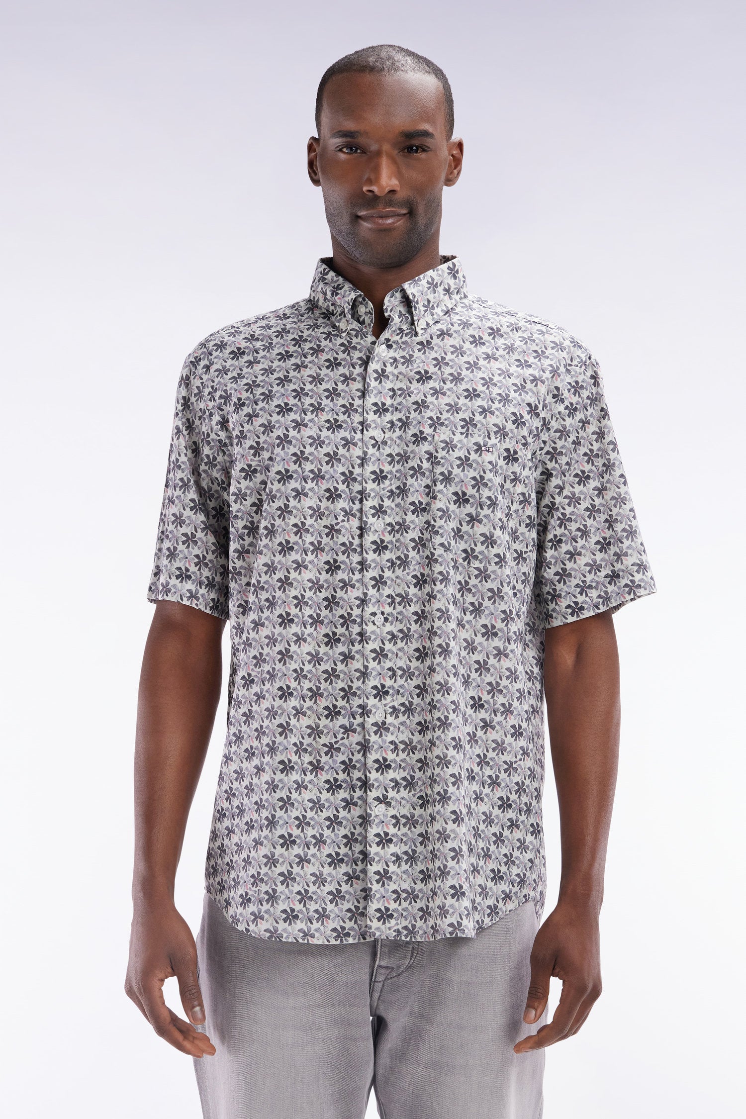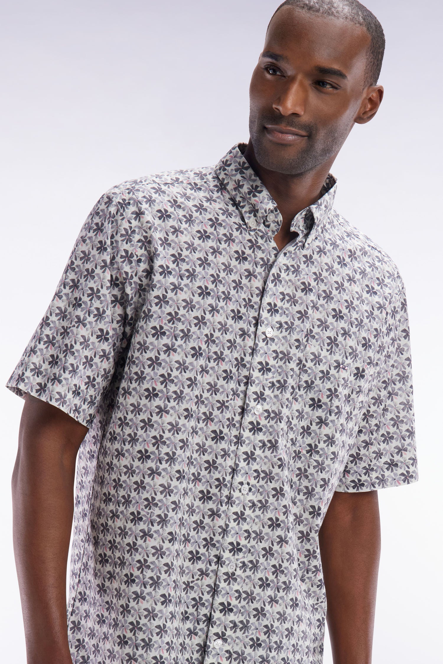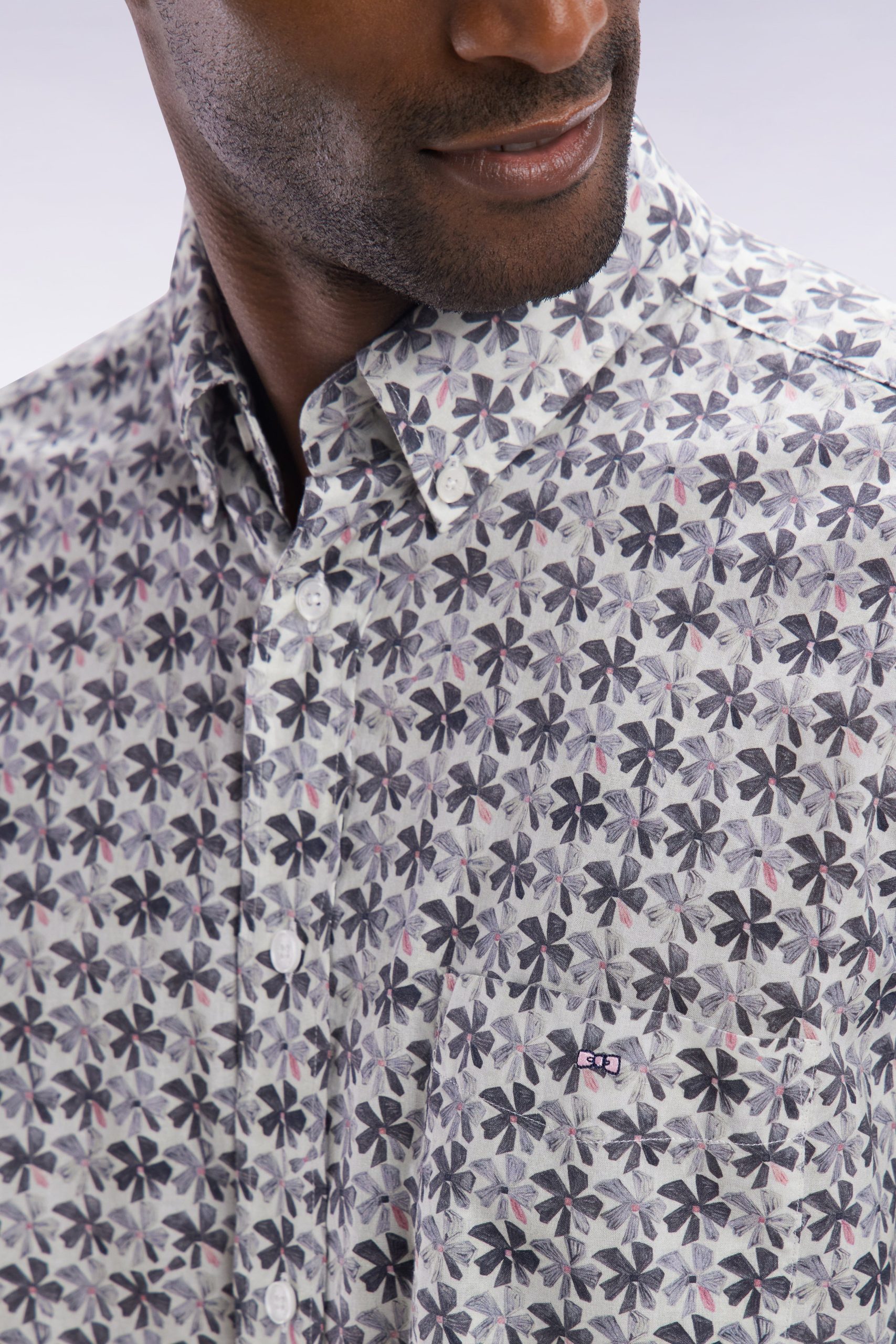 Confectionnée dans un tissu italien en coton, cette chemisette coupe droite se distingue par un motif floral graphique décliné selon le modèle choisi en trois variations de teintes : kaki, gris clair ou gris moyen, sur une base blanche lumineuse. Avec son col à pointes boutonnées et ses finitions impeccables, elle apporte une élégance contemporaine idéale pour la belle saison.