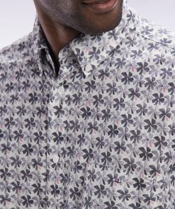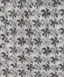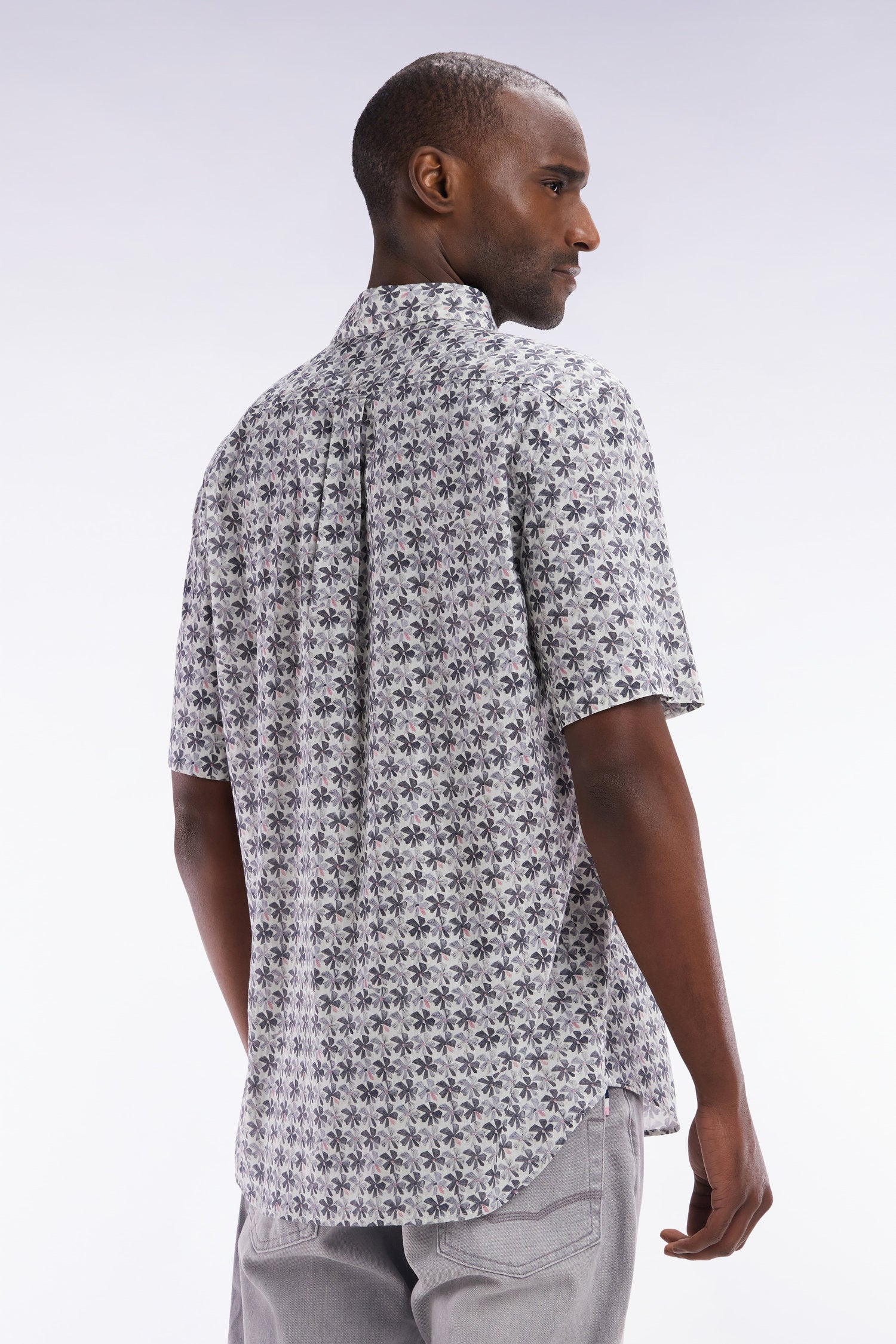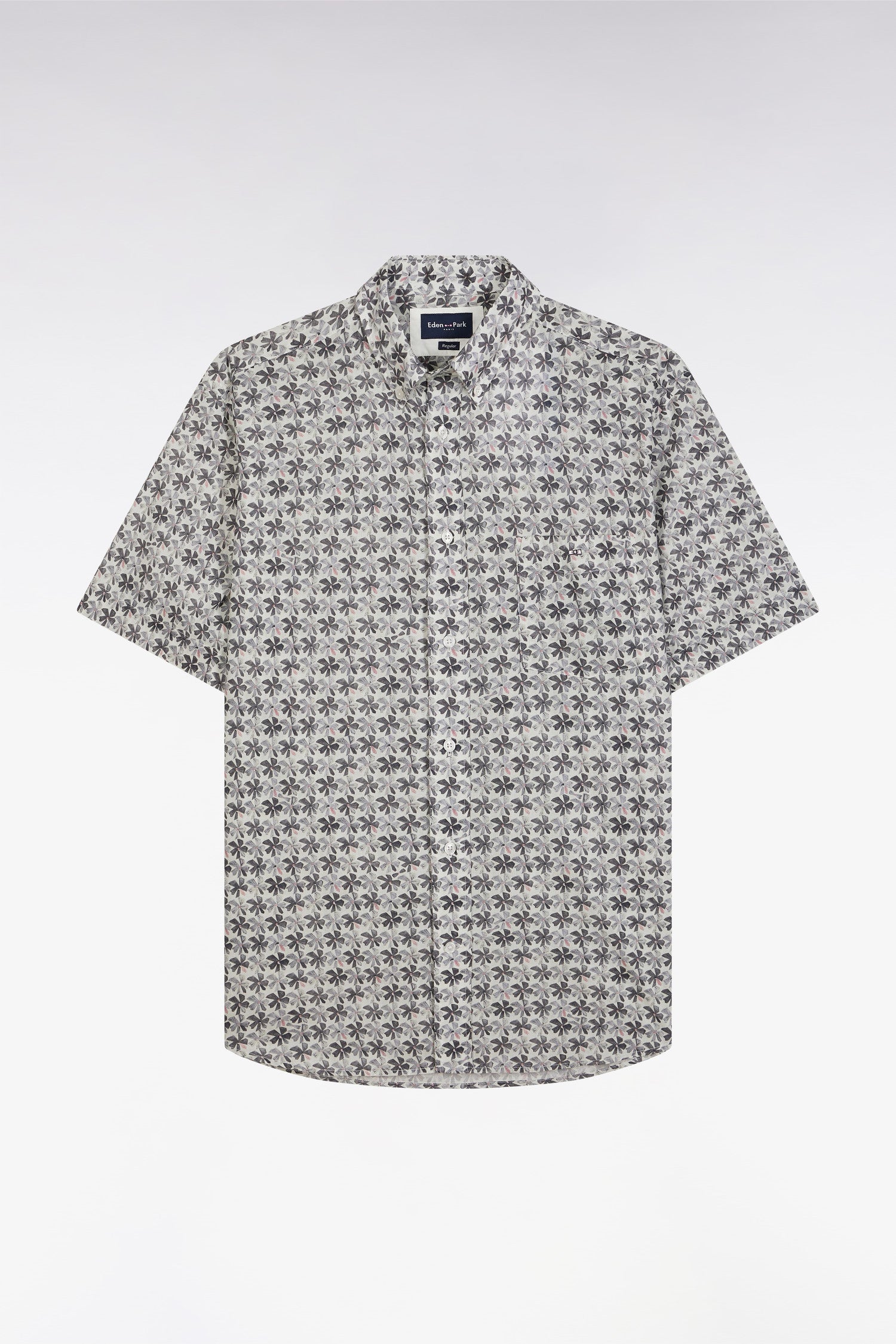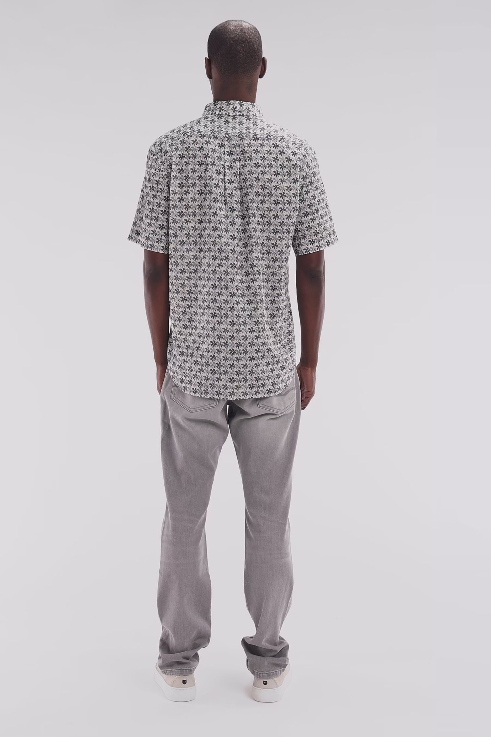 Confectionnée dans un tissu italien en coton, cette chemisette coupe droite se distingue par un motif floral graphique décliné selon le modèle choisi en trois variations de teintes : kaki, gris clair ou gris moyen, sur une base blanche lumineuse. Avec son col à pointes boutonnées et ses finitions impeccables, elle apporte une élégance contemporaine idéale pour la belle saison.