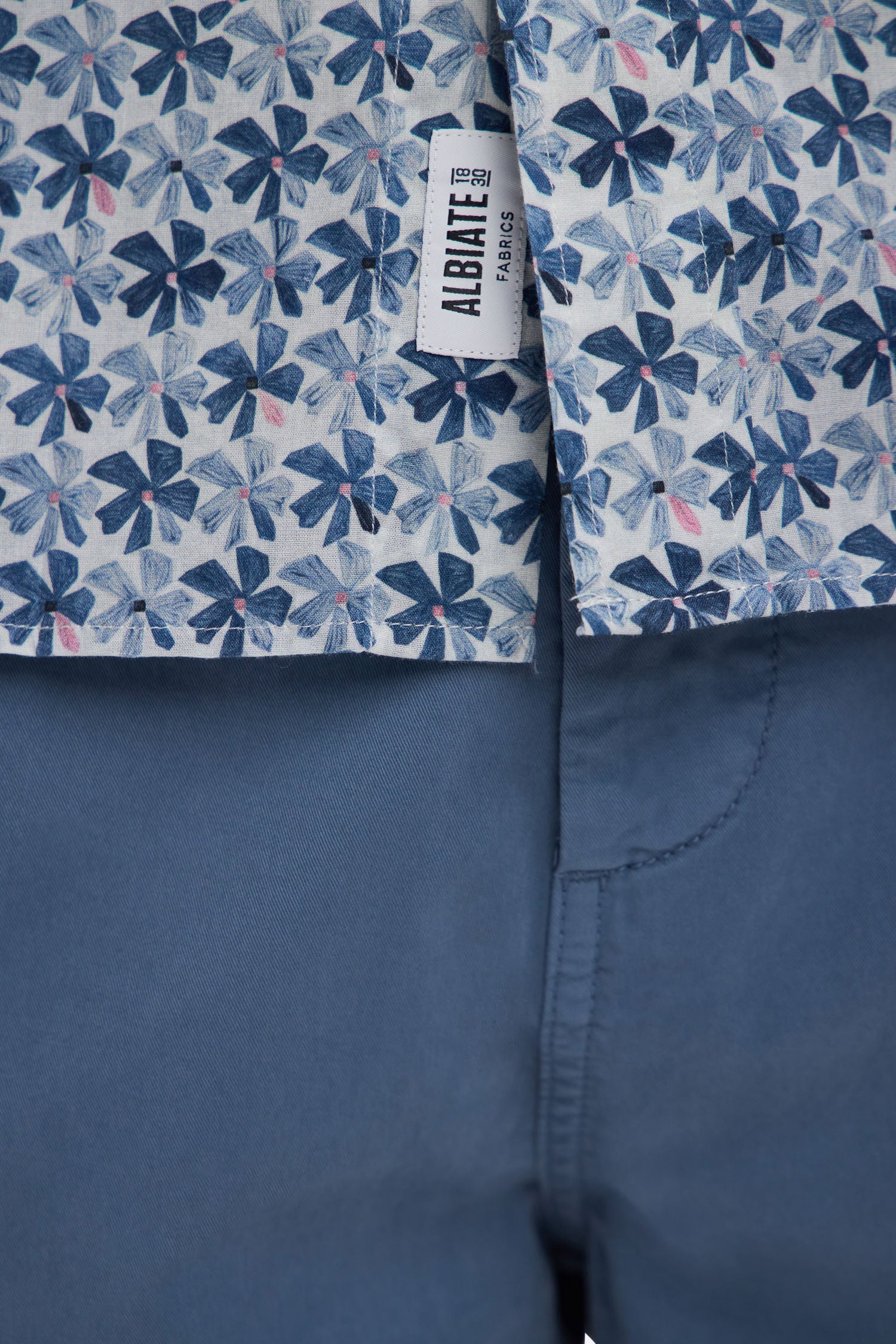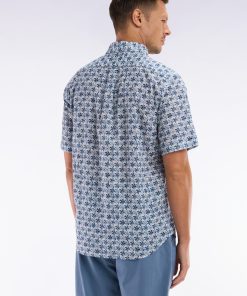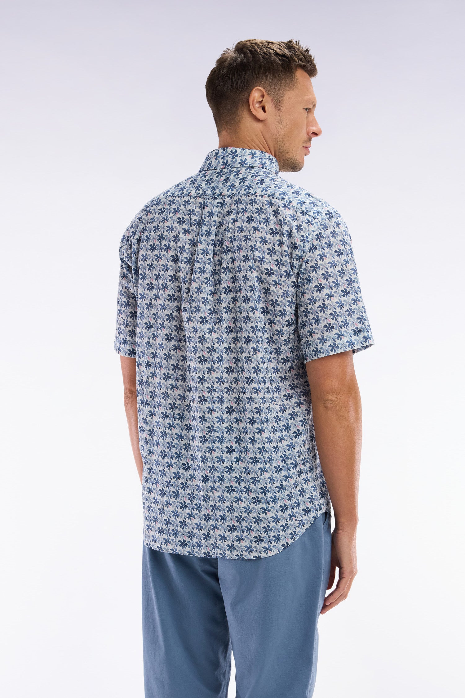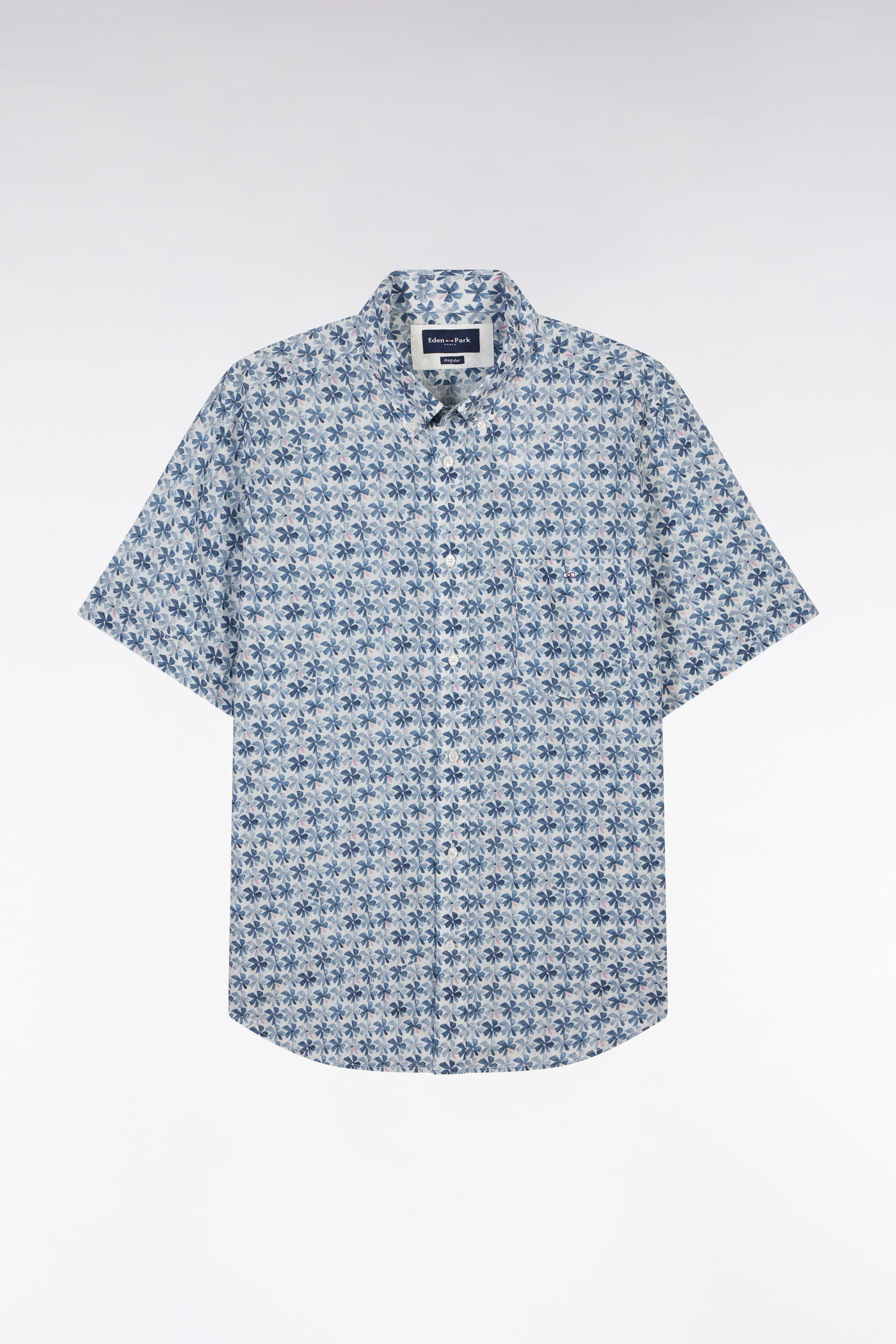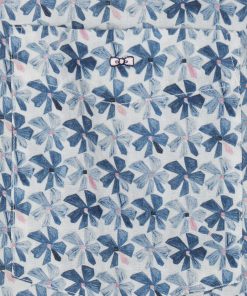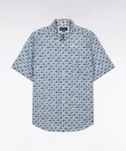 Confectionnée dans un tissu italien en coton, cette chemisette coupe droite se distingue par un motif floral graphique décliné selon le modèle choisi en trois variations de teintes : kaki, gris clair ou gris moyen, sur une base blanche lumineuse. Avec son col à pointes boutonnées et ses finitions impeccables, elle apporte une élégance contemporaine idéale pour la belle saison.