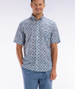 Confectionnée dans un tissu italien en coton, cette chemisette coupe droite se distingue par un motif floral graphique décliné selon le modèle choisi en trois variations de teintes : kaki, gris clair ou gris moyen, sur une base blanche lumineuse. Avec son col à pointes boutonnées et ses finitions impeccables, elle apporte une élégance contemporaine idéale pour la belle saison.