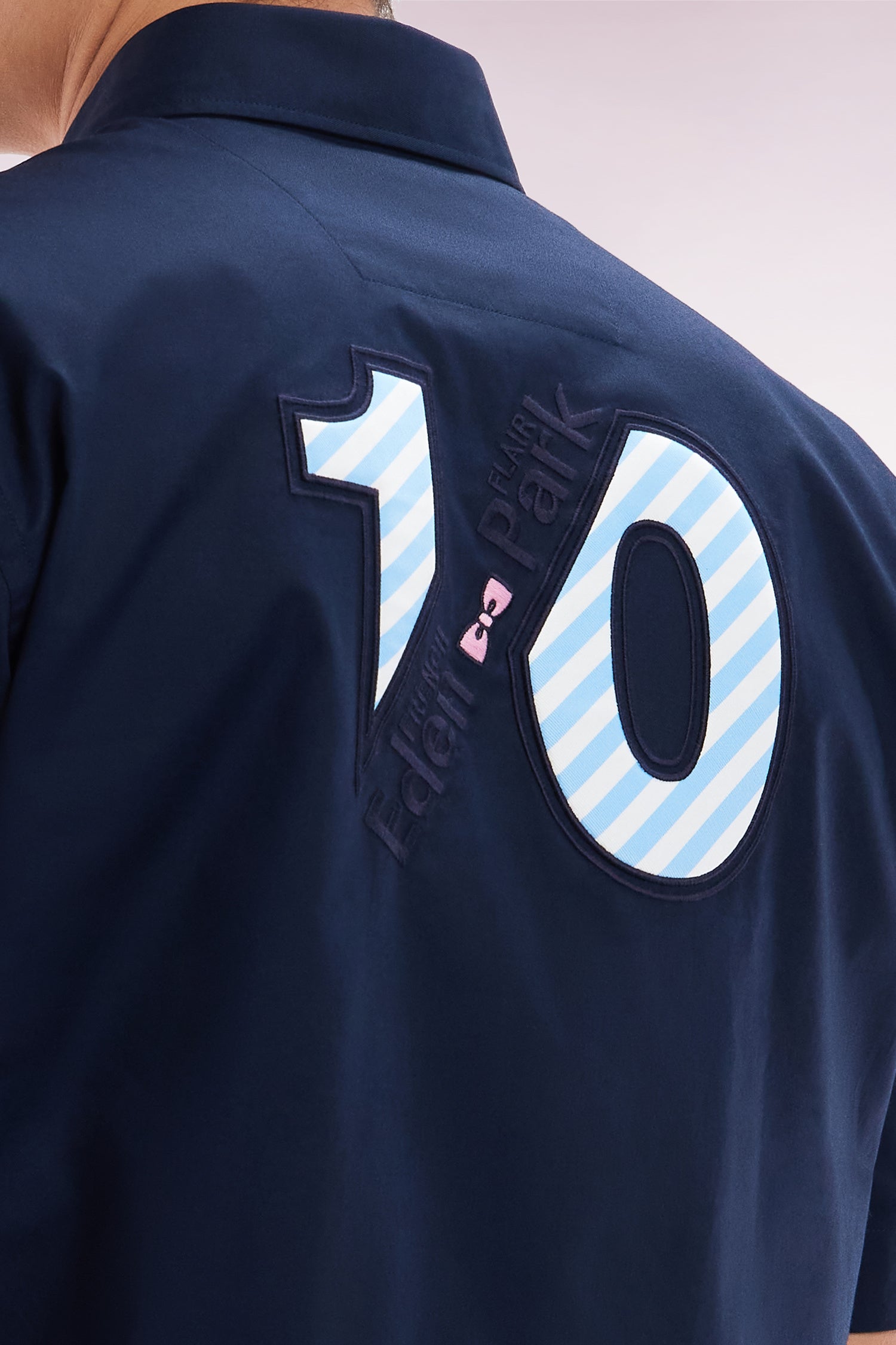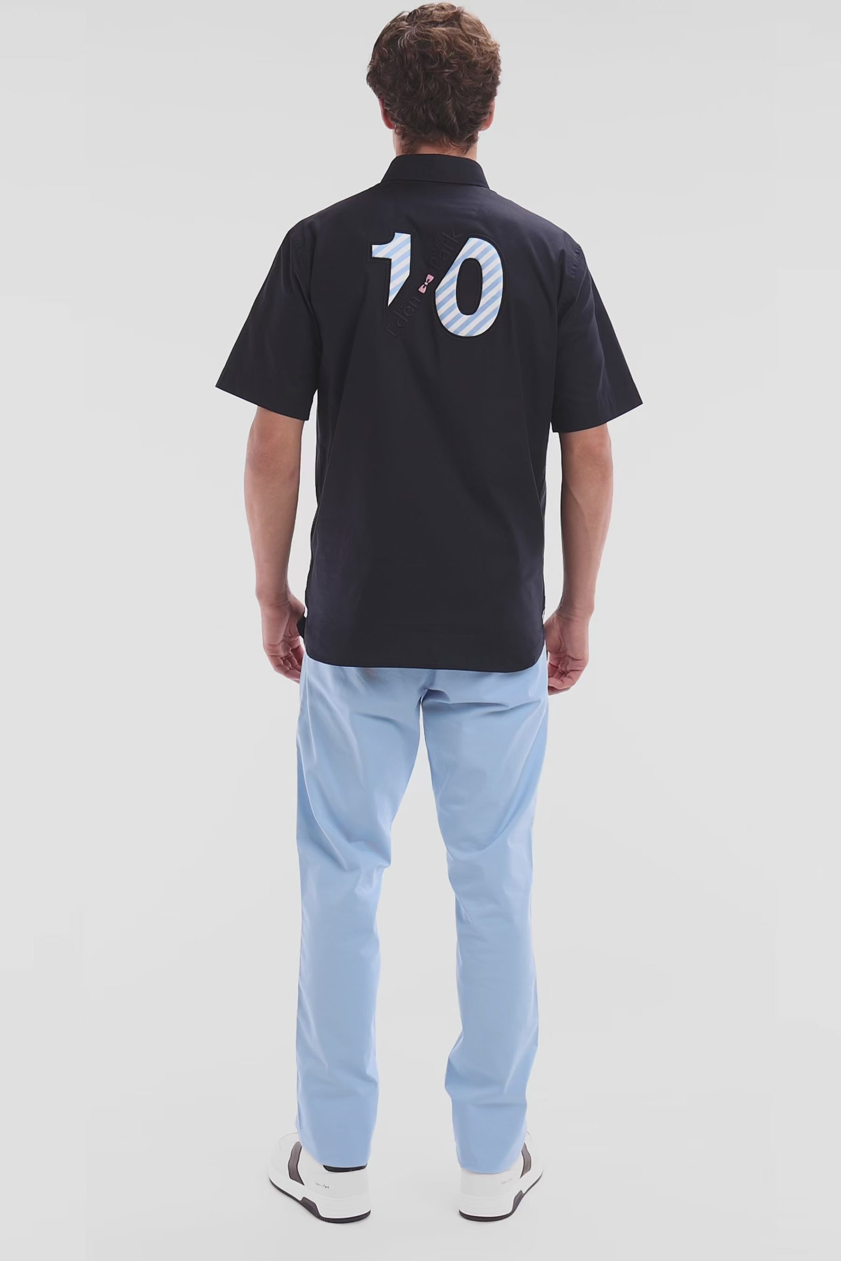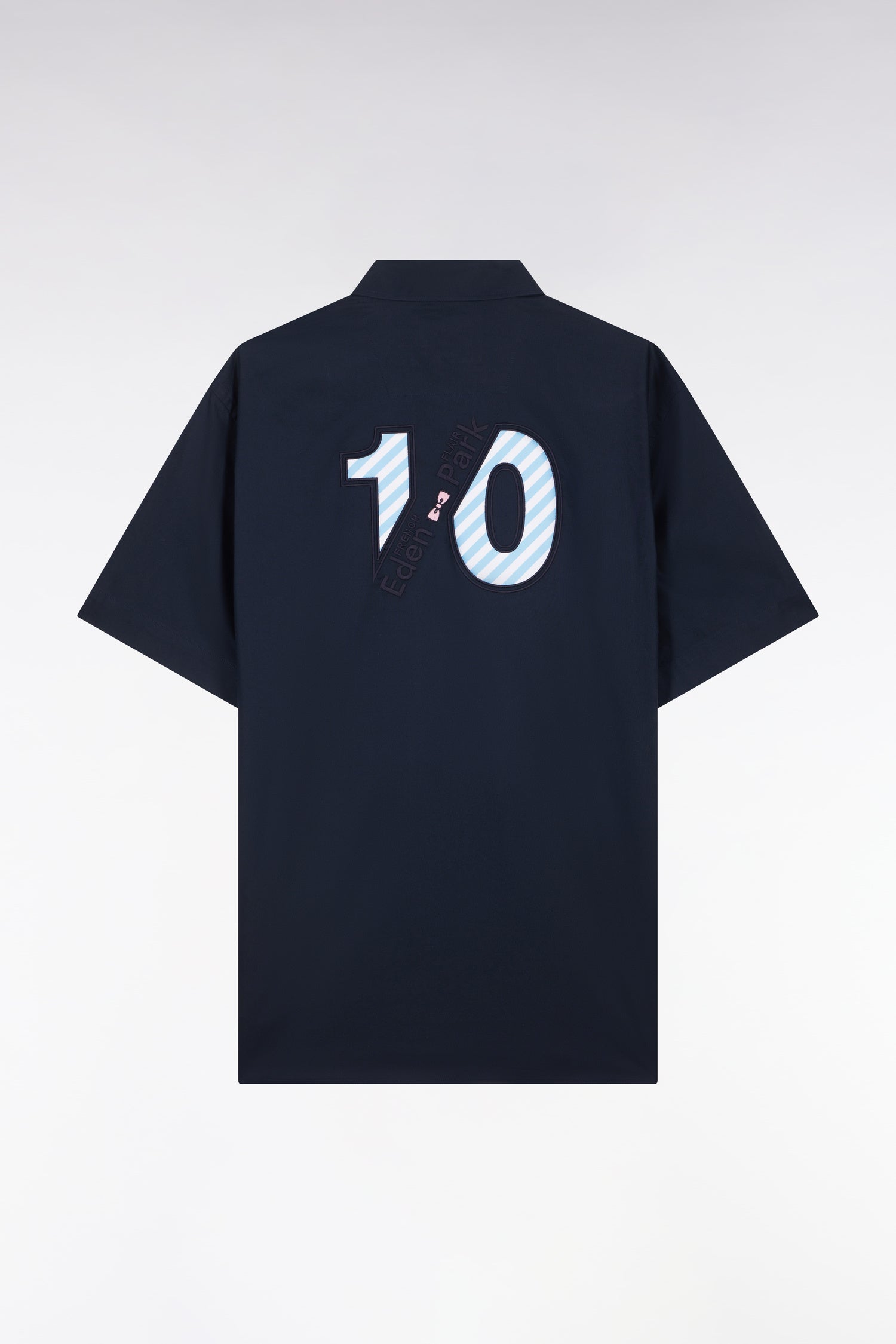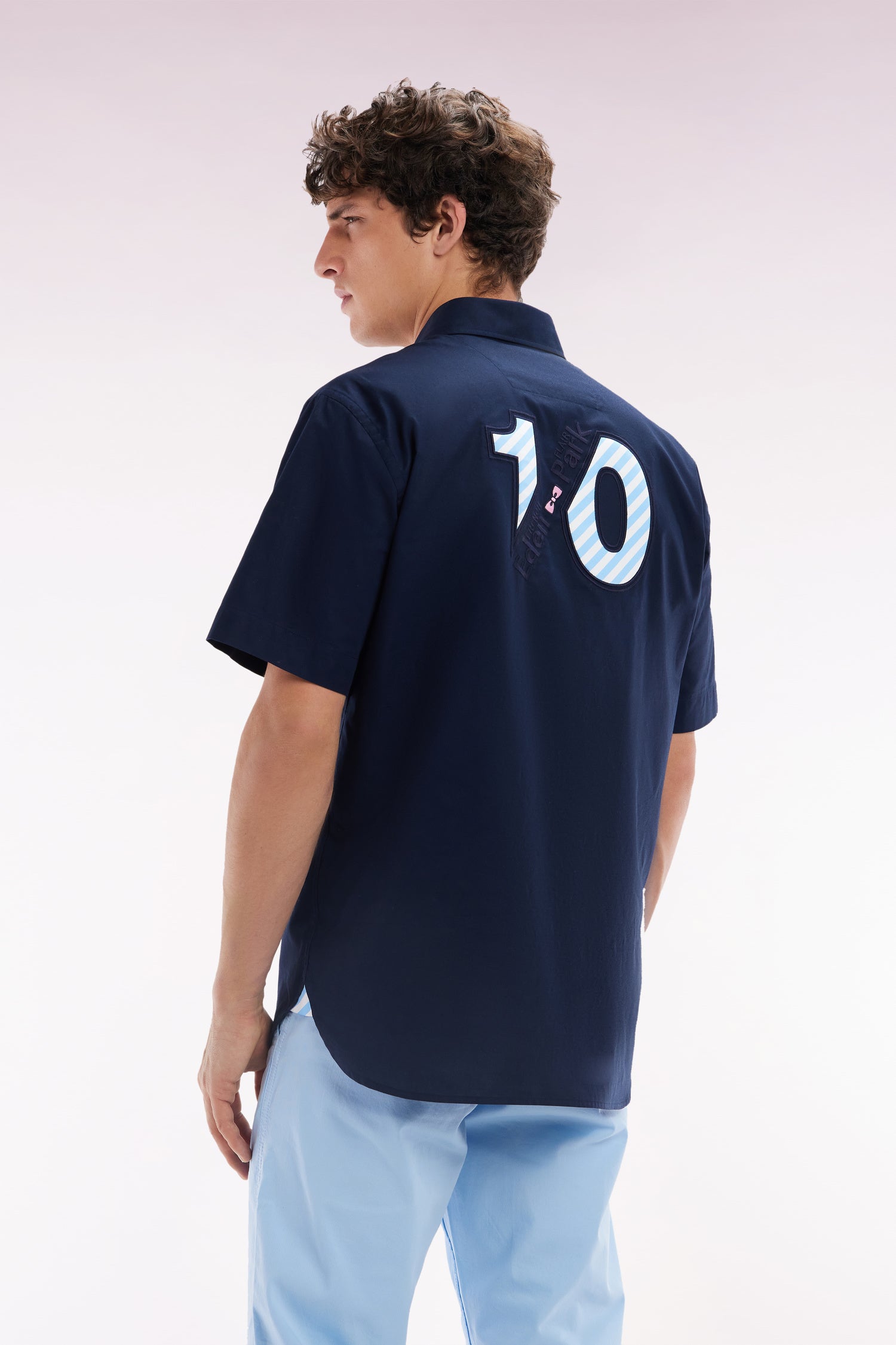 Cette chemise manches courtes est réalisée dans une armure de coton pinpoint, un tissage fin et très subtilement texturé entre la popeline et l’oxford. Cette chemisette se distingue par sa broderie N° 10 à l’arrière rehaussée d’un tissu de cravate cerclé de couleur contrastée, un détail inspiré du maillot historiquement porté par notre fondateur Franck Mesnel et rappelé en pied de col par des rayures contrastés.