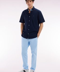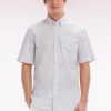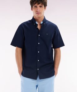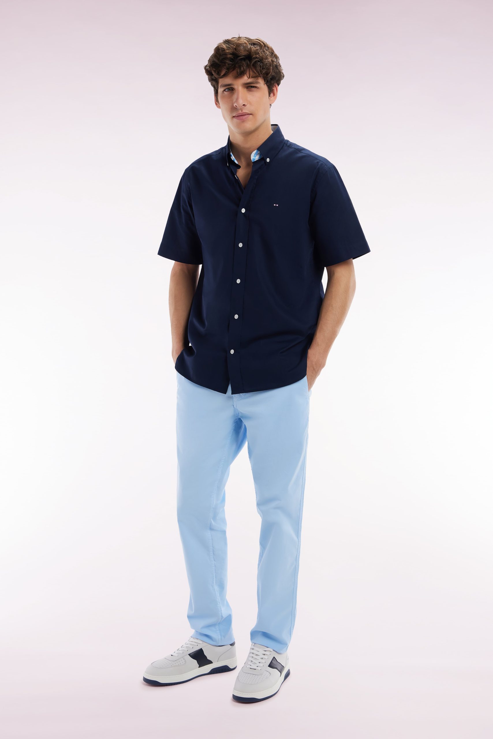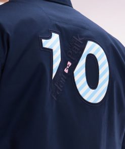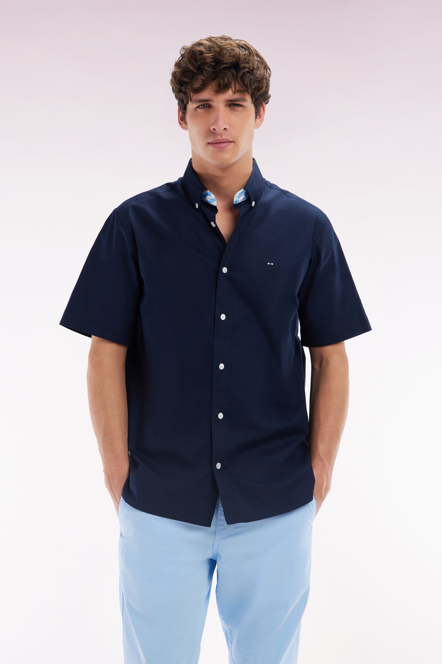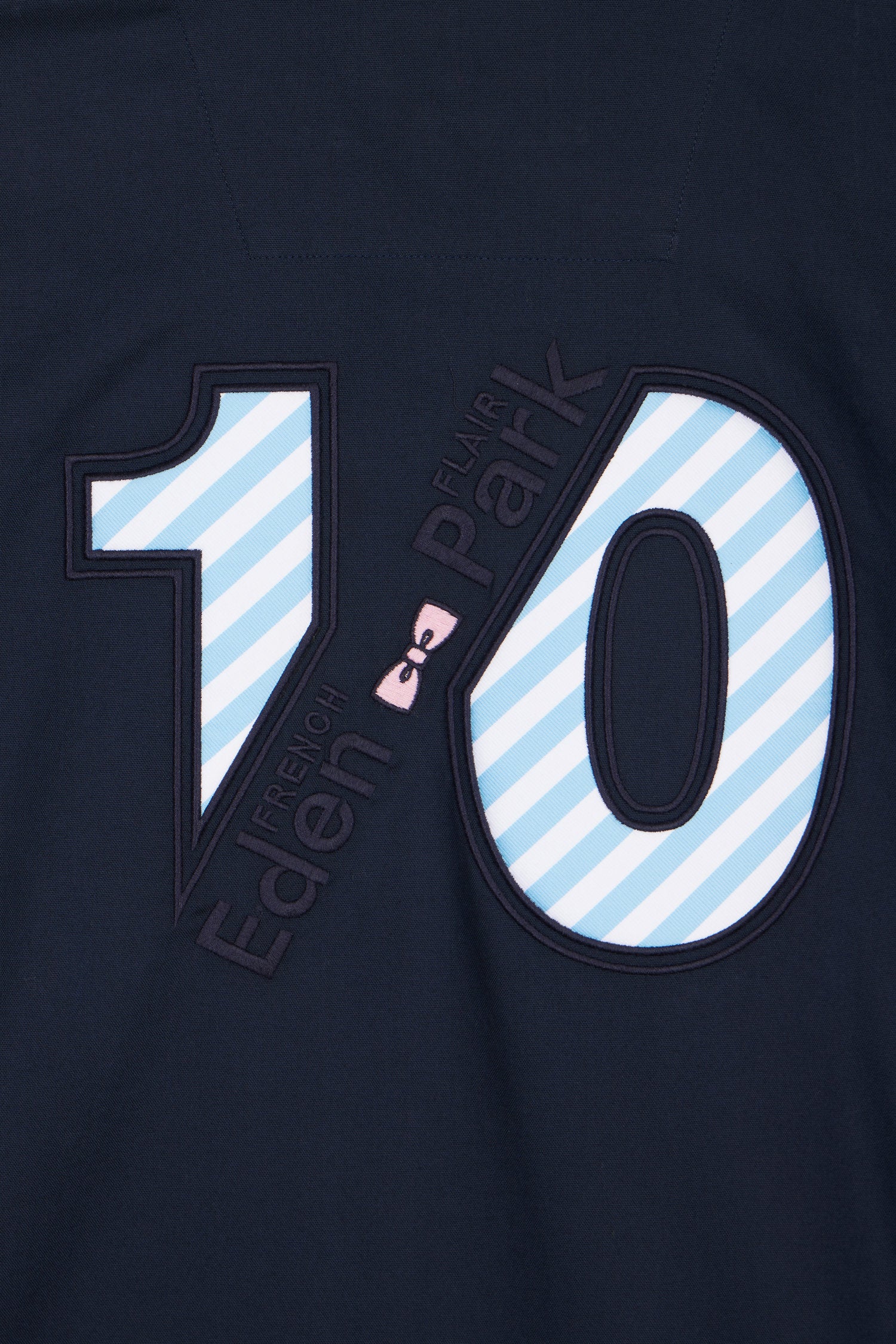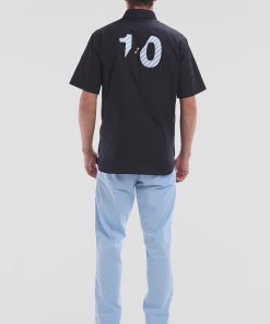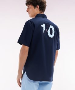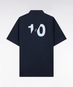 Cette chemise manches courtes est réalisée dans une armure de coton pinpoint, un tissage fin et très subtilement texturé entre la popeline et l’oxford. Cette chemisette se distingue par sa broderie N° 10 à l’arrière rehaussée d’un tissu de cravate cerclé de couleur contrastée, un détail inspiré du maillot historiquement porté par notre fondateur Franck Mesnel et rappelé en pied de col par des rayures contrastés.