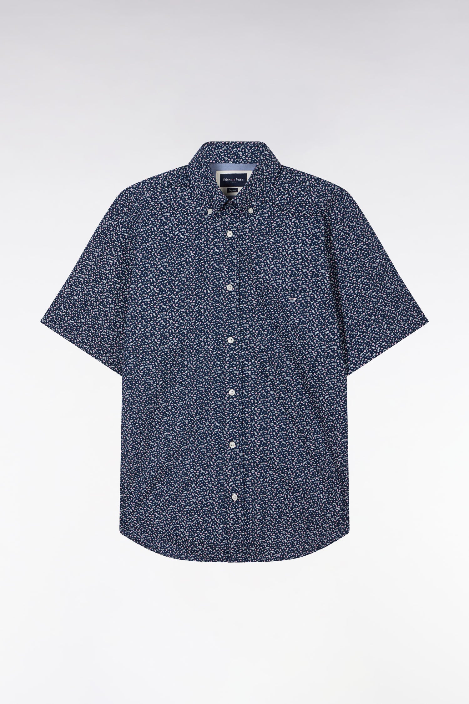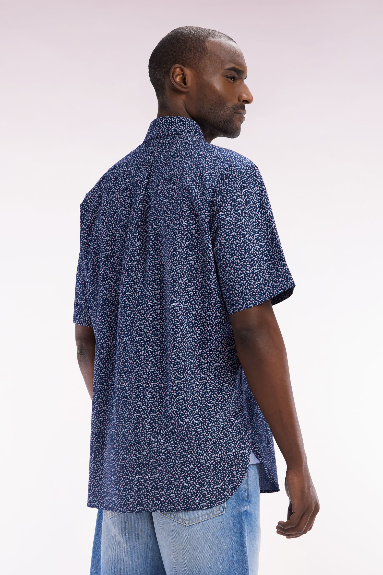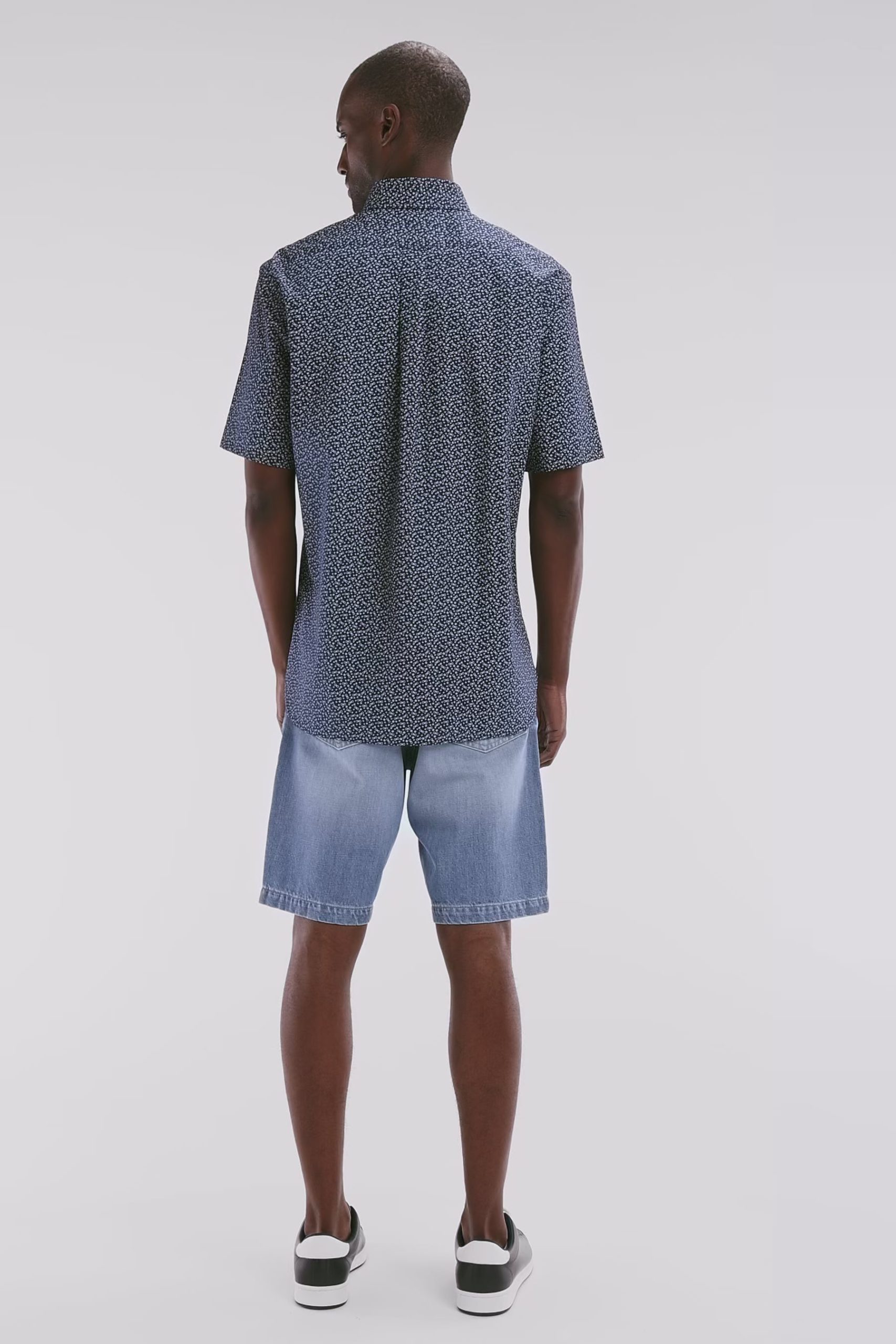 Cette chemise à manches courtes en popeline de coton, déclinée en écru ou marine, arbore un micromotif nœud papillon pour une touche emblématique. Avec sa coupe droite, ses poches plaquées, ses boutons rugby, et ses finitions en twill bleu sur les hirondelles et la bande de propreté, cette chemisette allie élégance et détails signatures typiques de notre Maison française.