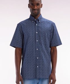 Cette chemise à manches courtes en popeline de coton, déclinée en écru ou marine, arbore un micromotif nœud papillon pour une touche emblématique. Avec sa coupe droite, ses poches plaquées, ses boutons rugby, et ses finitions en twill bleu sur les hirondelles et la bande de propreté, cette chemisette allie élégance et détails signatures typiques de notre Maison française.