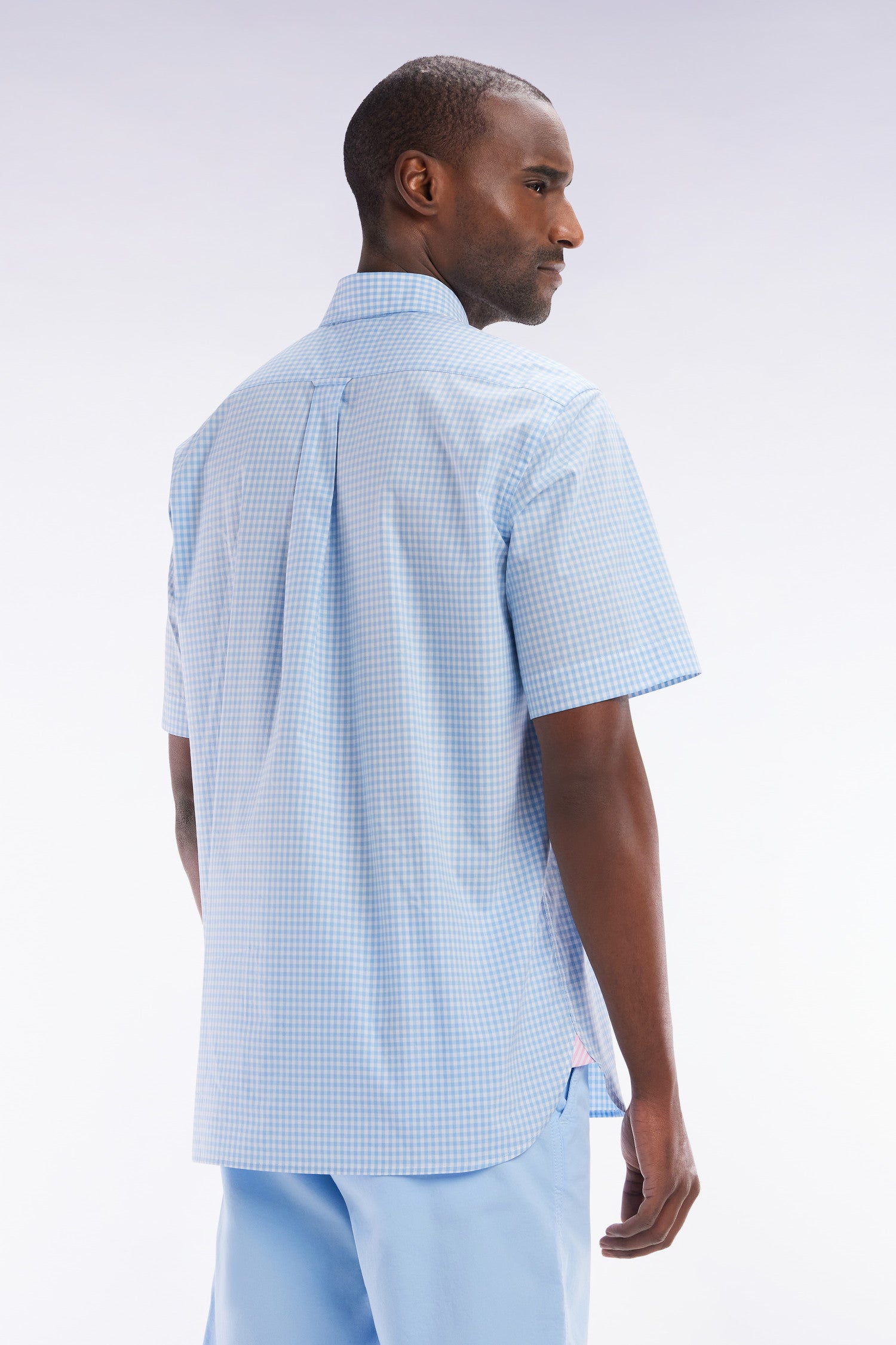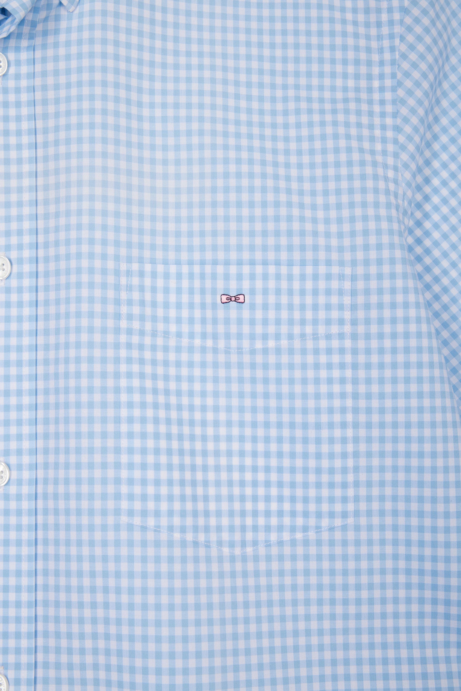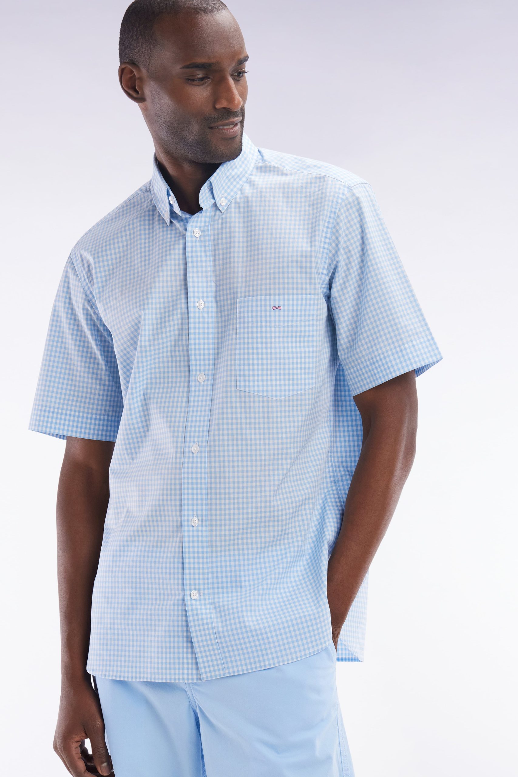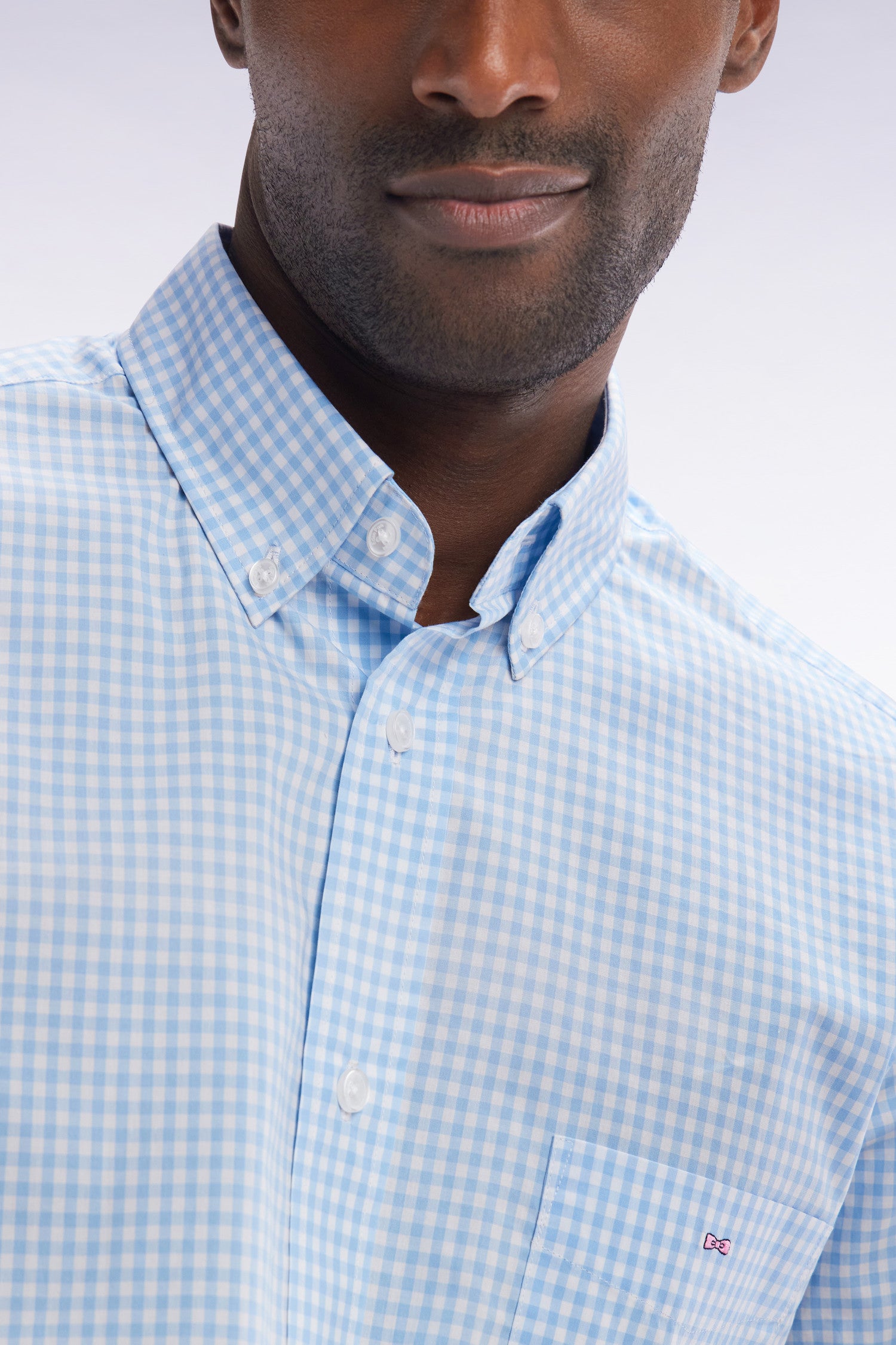 Cette chemisette en popeline de coton à carreaux vichy, disponible en marine, rose ou bleu ciel, allie élégance et confort avec sa Coupe Droite et son bas arrondi. Le col à pointes boutonnées et le pli au dos assurent une tenue impeccable, tandis que la poche poitrine ornée du nœud papillon brodé, emblème de notre Maison, apporte une signature subtile à cet essentiel estival. Légère et respirante, cette chemisette est idéale pour les journées chaudes, offrant un style à la fois décontracté et raffiné.