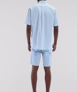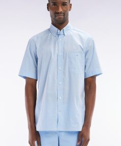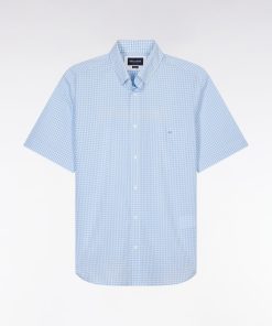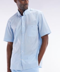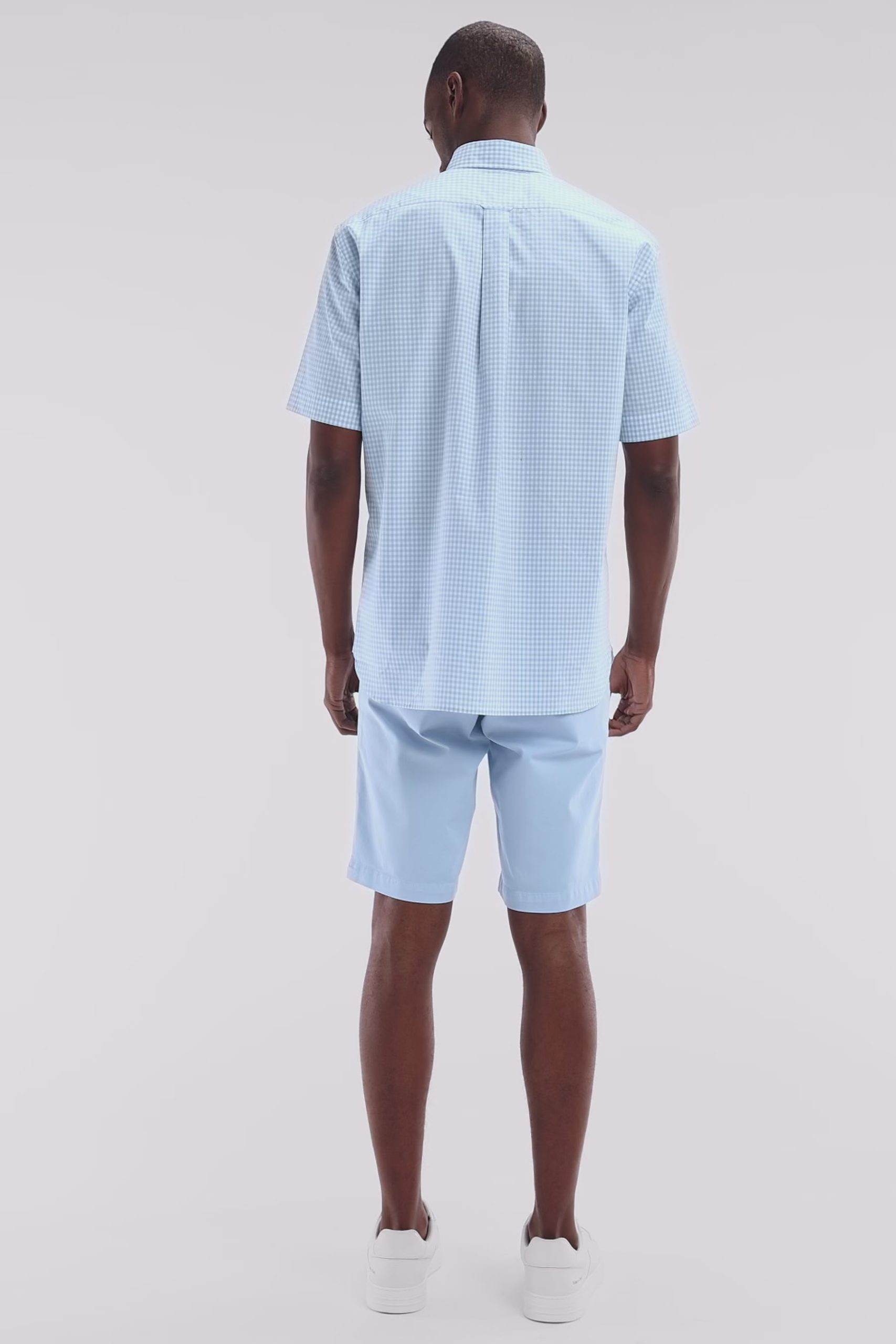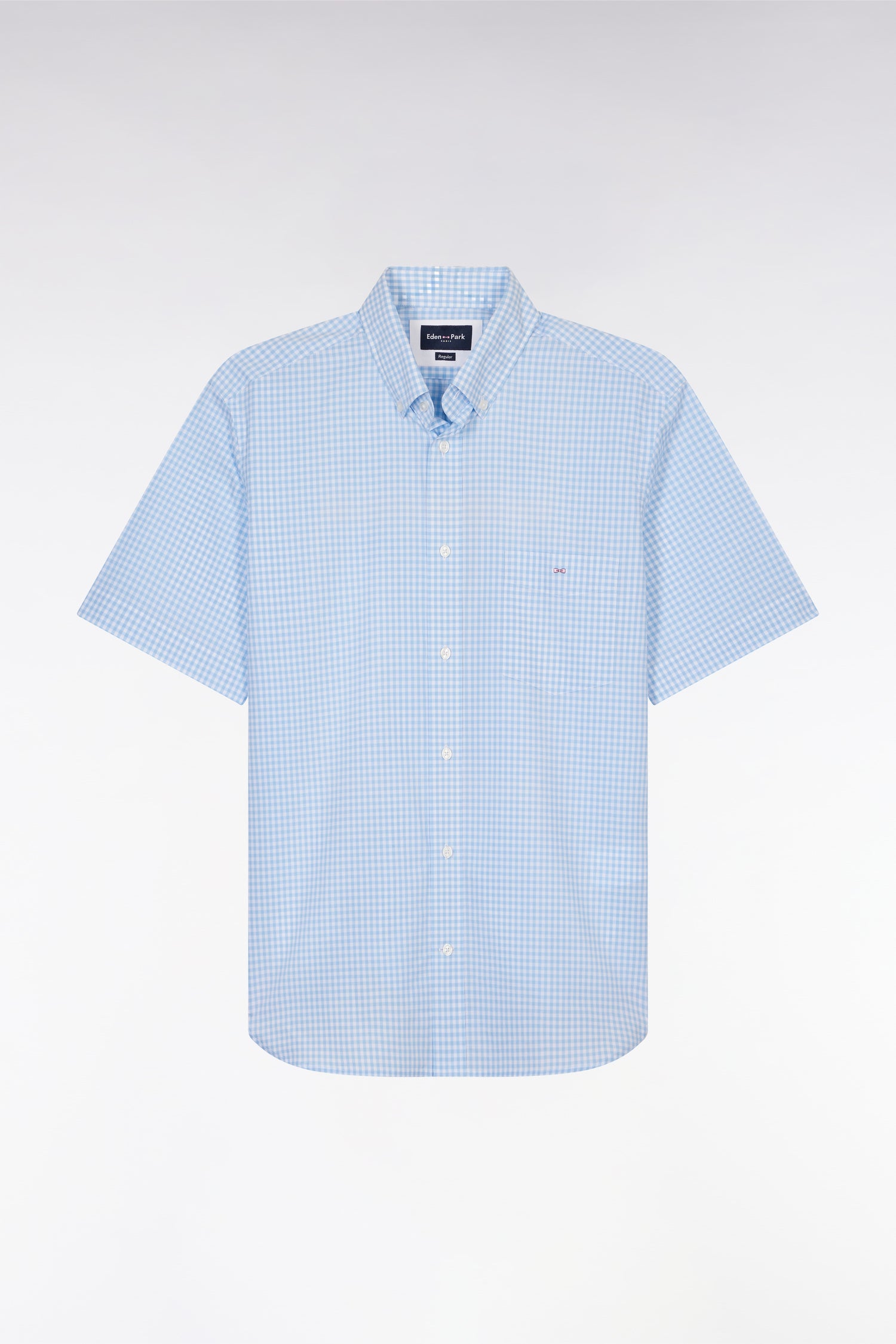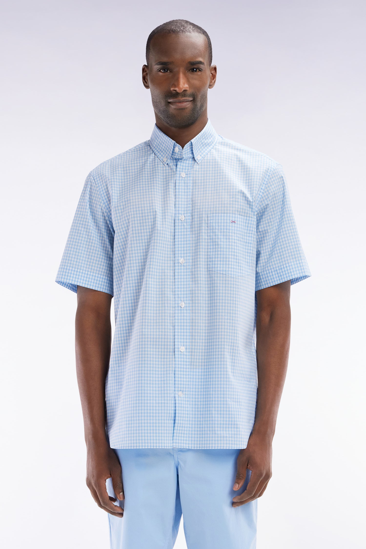 Cette chemisette en popeline de coton à carreaux vichy, disponible en marine, rose ou bleu ciel, allie élégance et confort avec sa Coupe Droite et son bas arrondi. Le col à pointes boutonnées et le pli au dos assurent une tenue impeccable, tandis que la poche poitrine ornée du nœud papillon brodé, emblème de notre Maison, apporte une signature subtile à cet essentiel estival. Légère et respirante, cette chemisette est idéale pour les journées chaudes, offrant un style à la fois décontracté et raffiné.