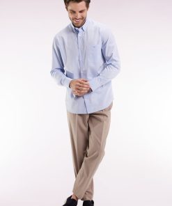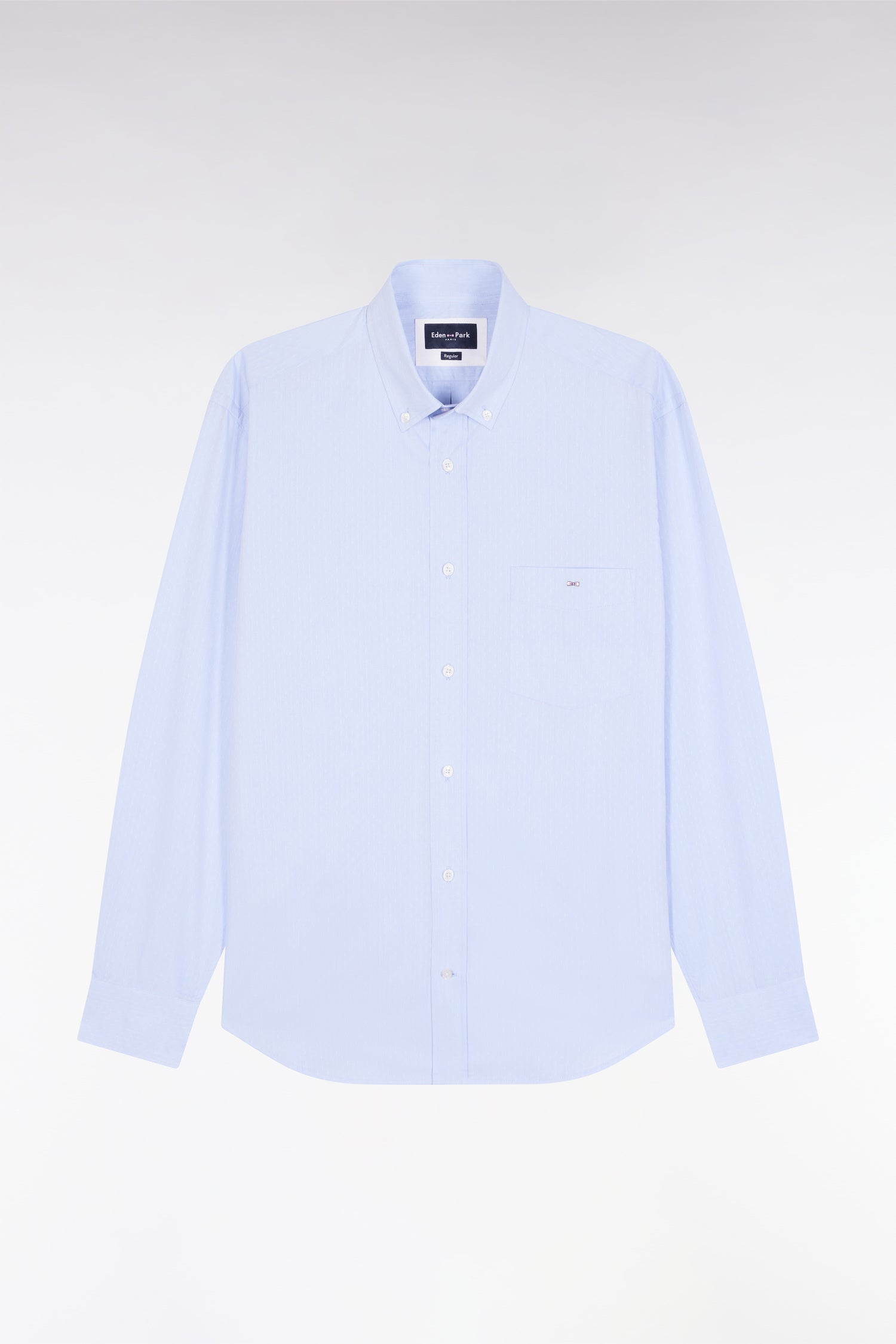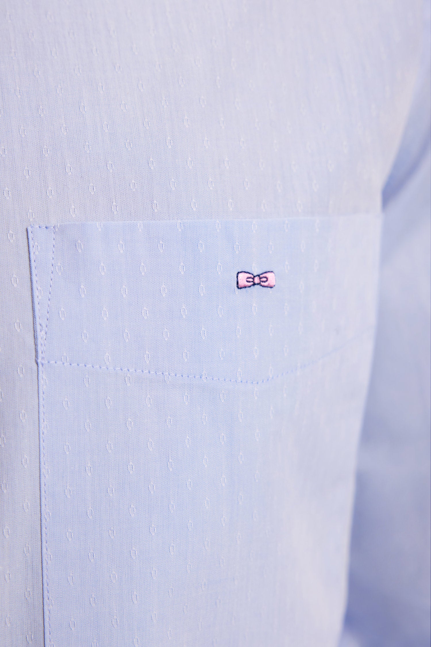 Le raffinement discret de cette chemise masculine repose sur son étoffe coton associant tissage jacquard et dobby au motif subtil, qui apporte du relief sans ostentation. Cette chemise épurée présente une coupe droite facile à porter au quotidien. Ses finitions soignées, du col boutonné à la broderie nœud papillon sur sa poche poitrine, rappellent l’attachement d’Eden Park au savoir-faire tailleur et aux détails gages de l’élégance masculine. Un modèle décliné dans nos coloris signature : ciel ou rose pour s’accorder à vos favoris de la saison