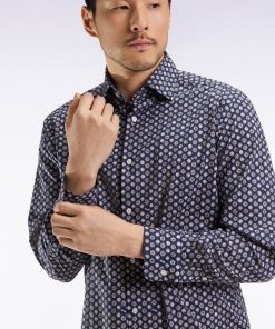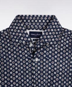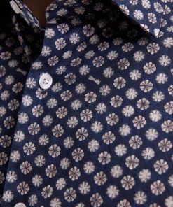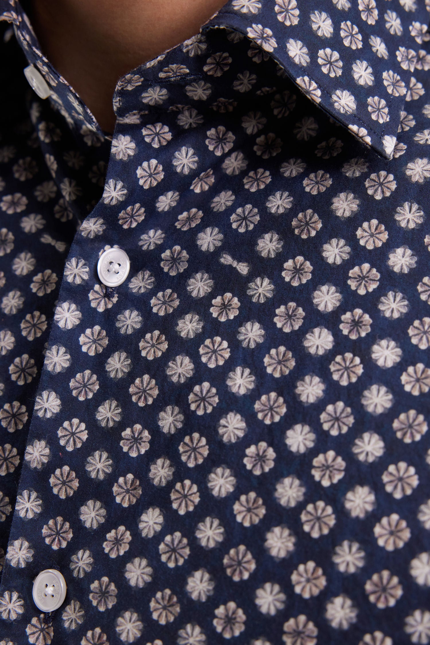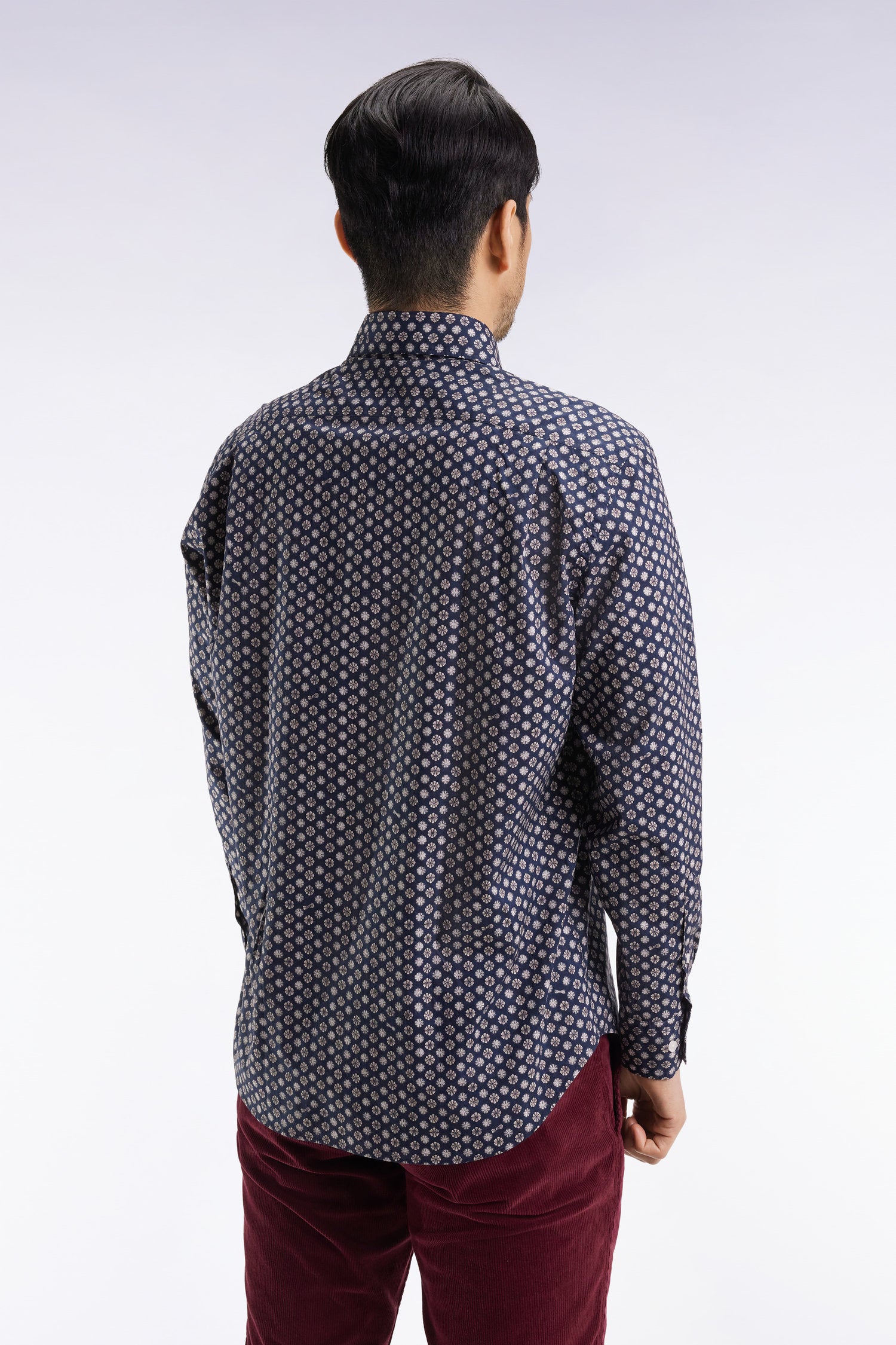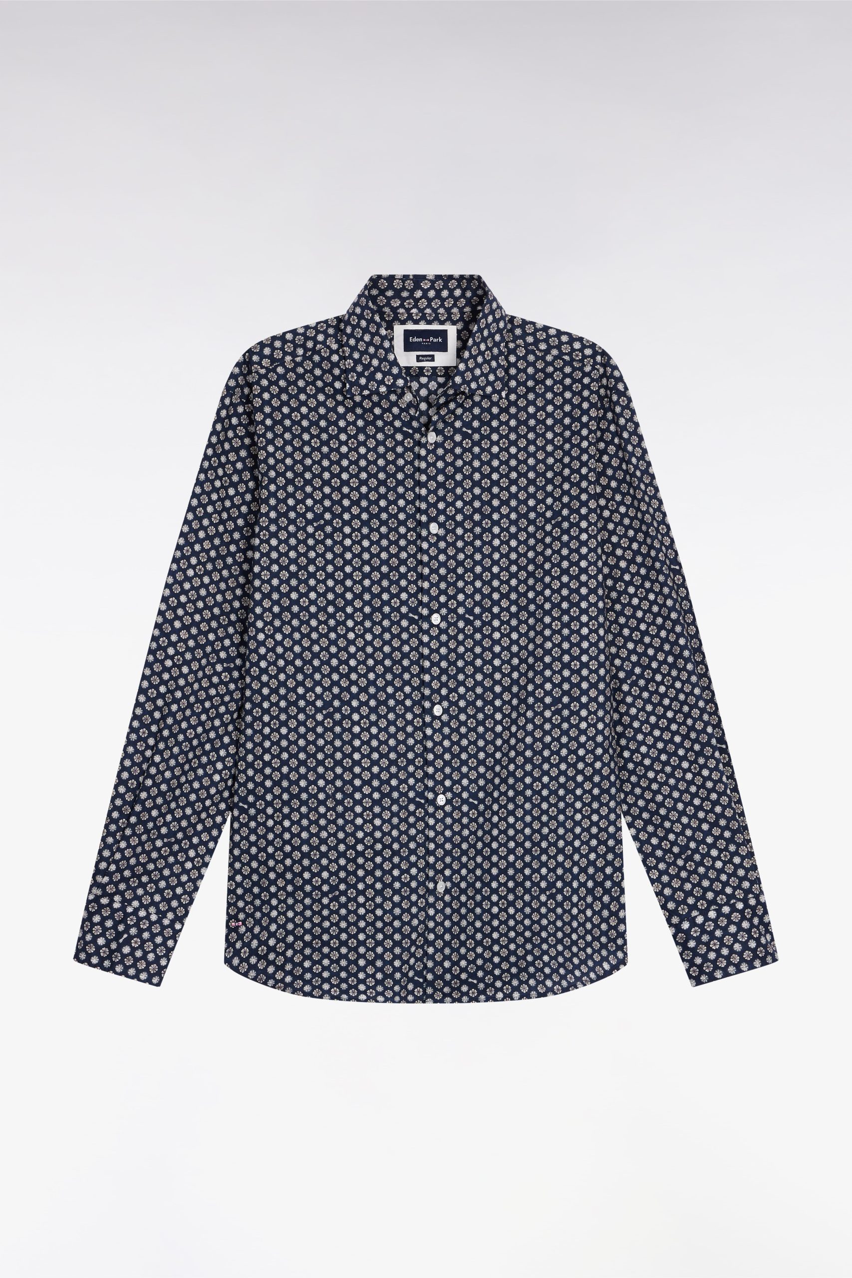 Moderne et graphique, cette chemise à l’imprimé fleurs moins figuratif, travaillé avec originalité sur fond marine, s’inscrit dans la tradition du chic à la française. Son col classique, ses boutons ovales siglés et sa coupe droite au tombé impeccable signent une allure soignée, parfaite pour rehausser un jean brut ou un pantalon clair