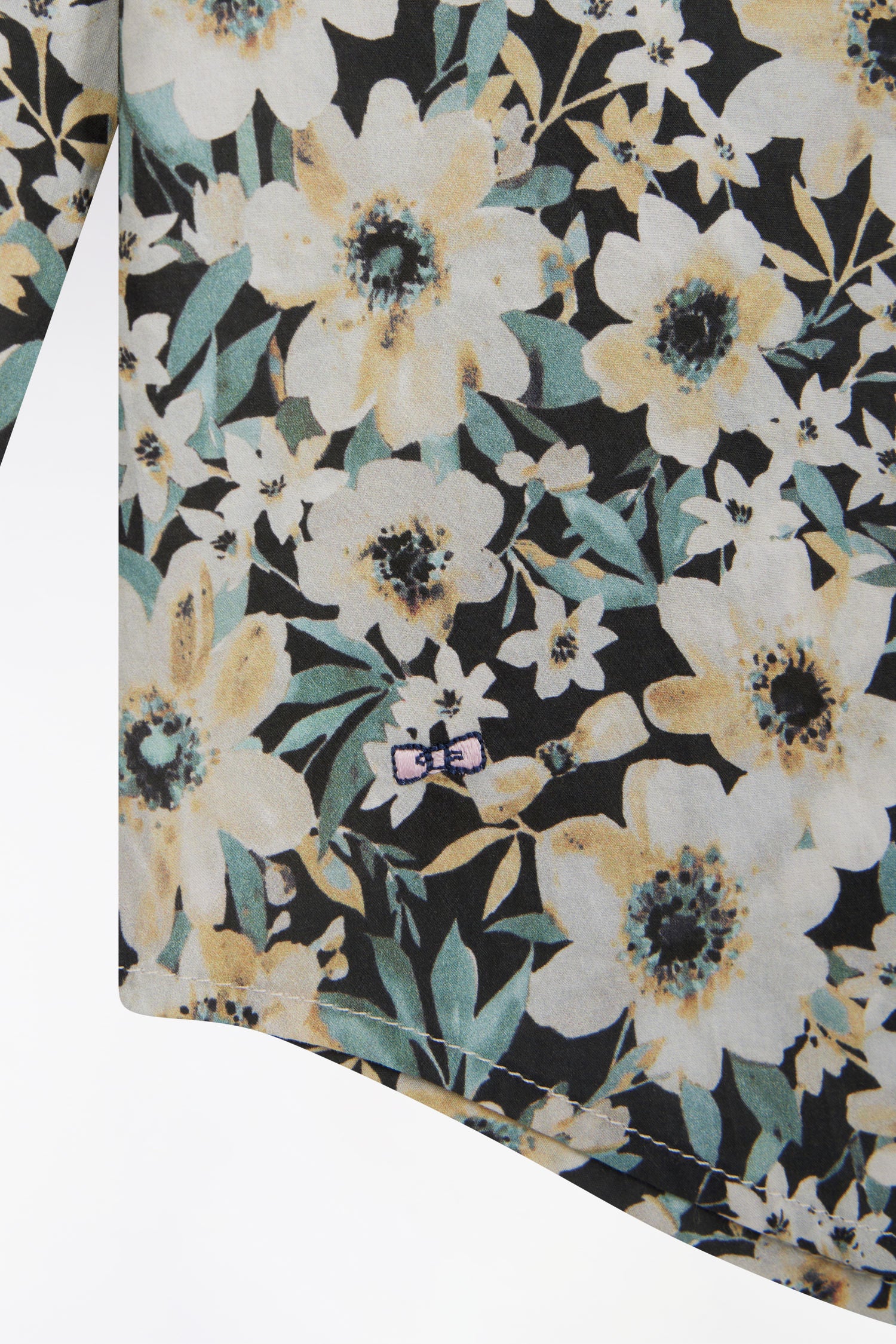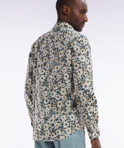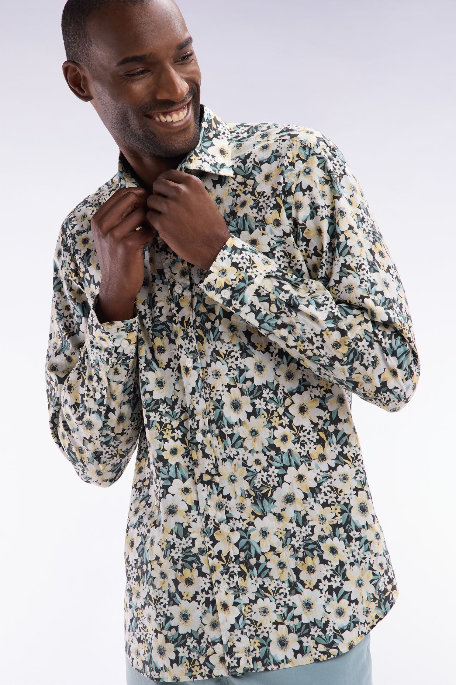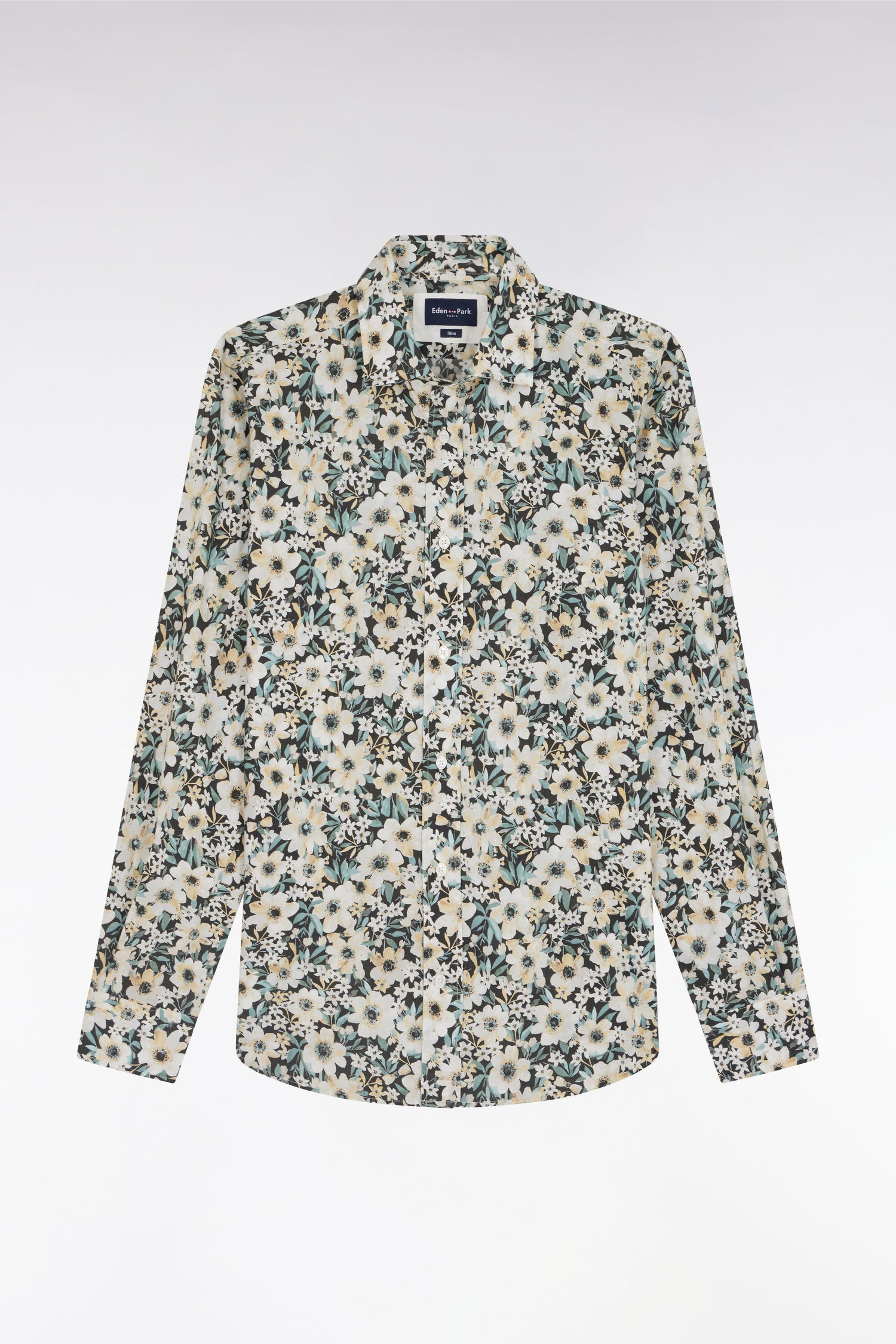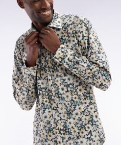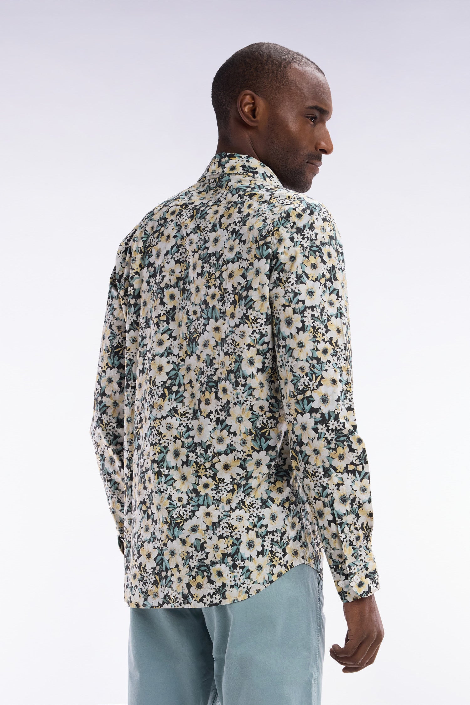 Cette chemise à manches longues séduit par son motif floral exclusif jaune, écru et vert sur fond noir, apportant une touche tendance et audacieuse au vestiaire masculin. Sa construction minimaliste met en valeur cet imprimé original, tout en restant fidèle à la vision d’une élégance sport-chic propre à notre Maison.
