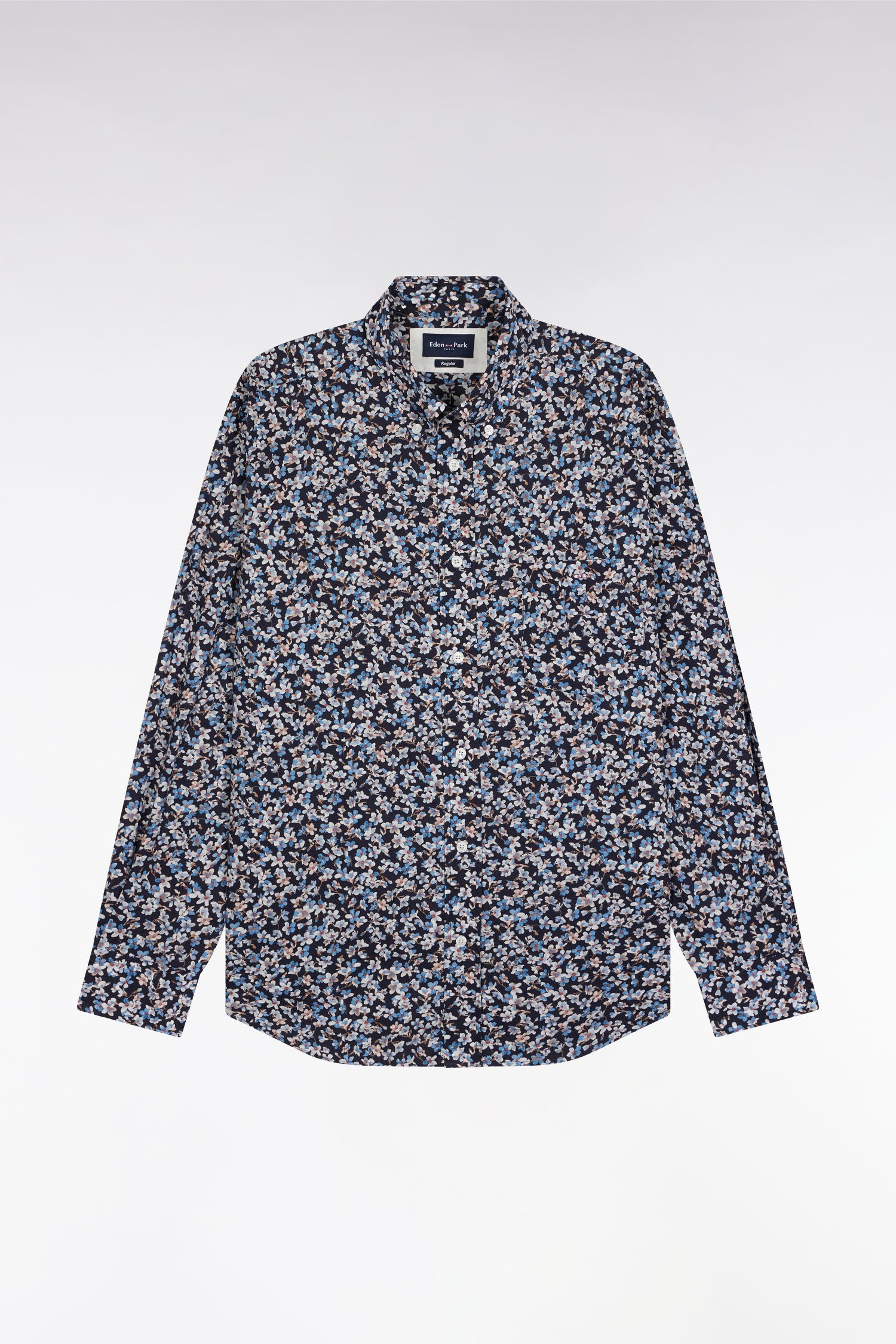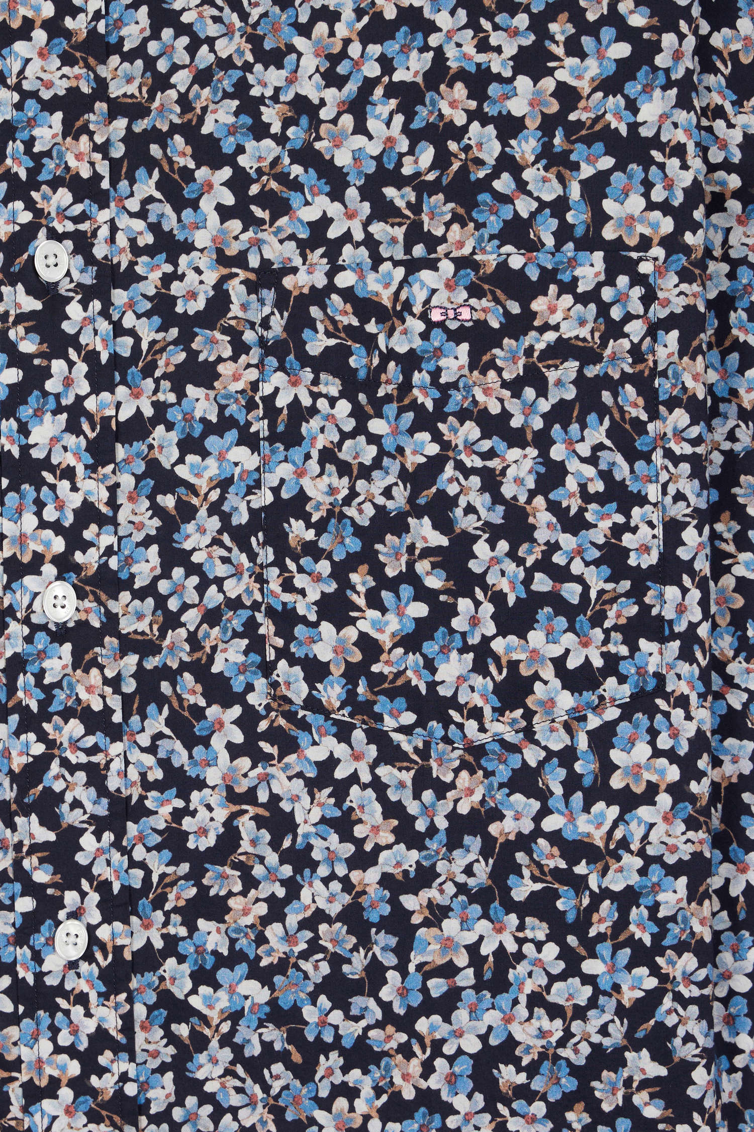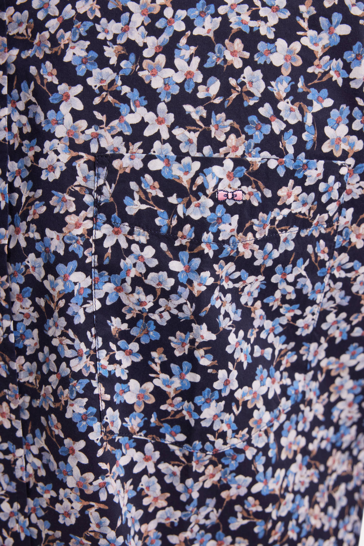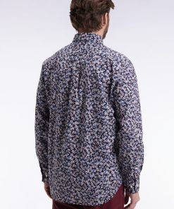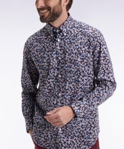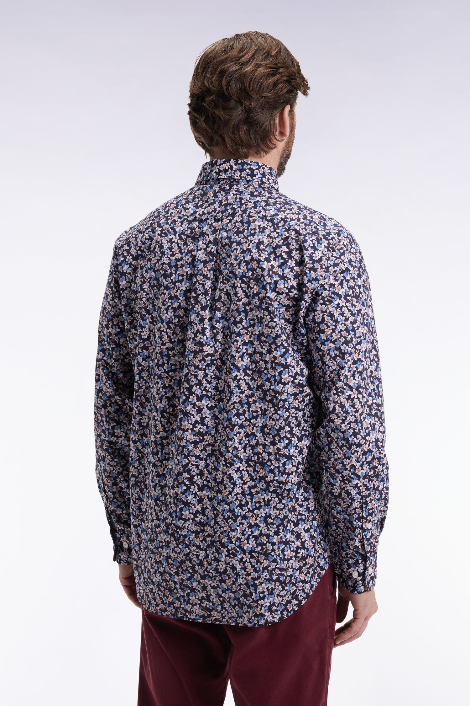 Conçue dans une popeline de coton légère, cette chemise homme à l’imprimé floral raffiné, proposé en rouge sur un fond écru ou en camaïeu de bleus, affiche un style sophistiqué maîtrisé. Le motif, tout en délicatesse, contraste avec sa coupe droite structurée et ses finitions sport-chic : poche plaquée et bouton ovales rugby siglés. Son col à pointes boutonné met en valeur le port de tête, que vous la portiez fermée ou largement entrouverte
