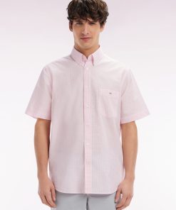 Eden Park Homme Men’s Chemise Rayée À Manches Courtes En Coton Rose Coupe Droite