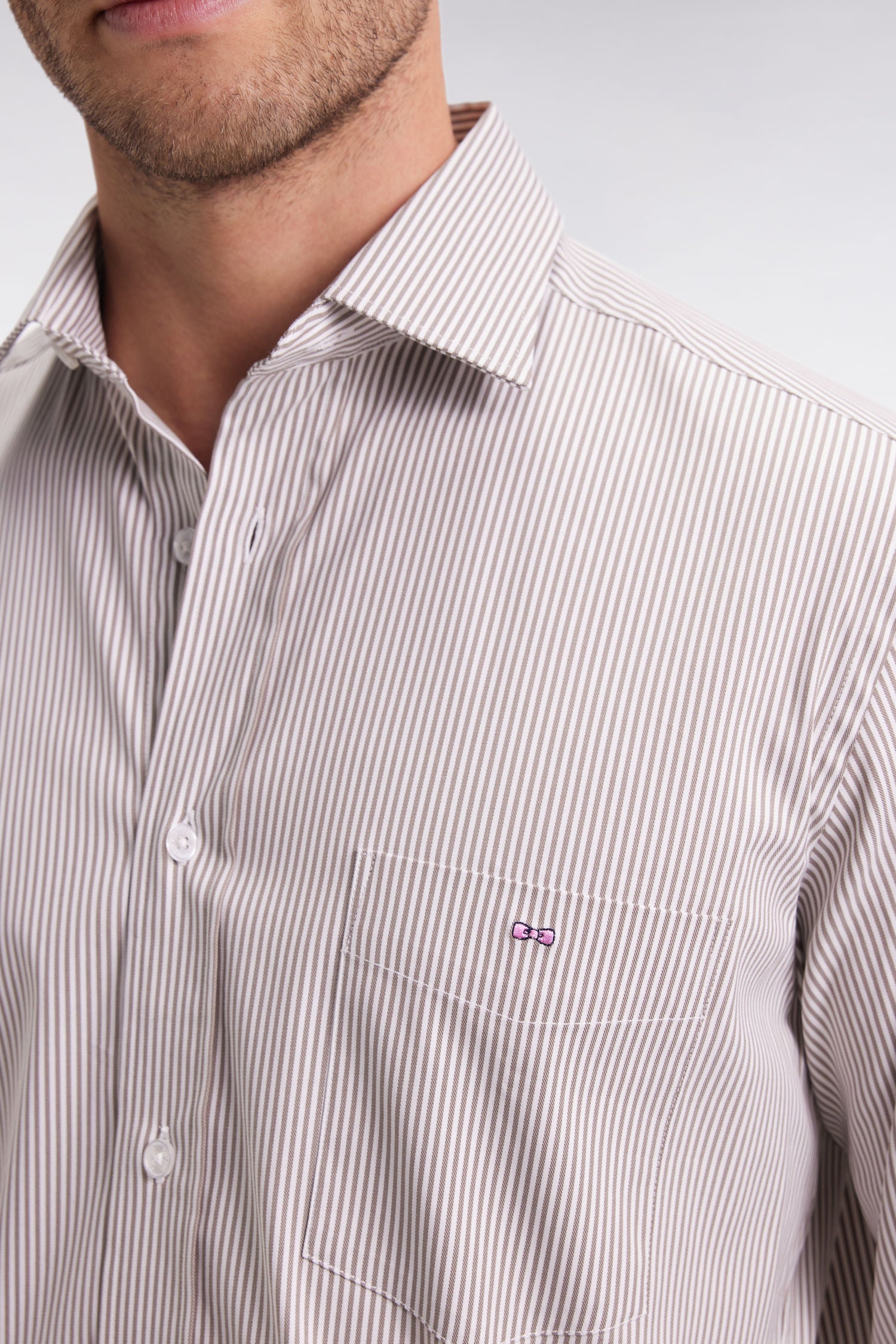 Derrière sa sobriété apparente, une construction précise et des finitions discrètes révèlent tout le savoir-faire de la Maison. Alliant coton biologique et fibres stretch, cette chemise homme conjugue souplesse, respirabilité et confort. Pensée pour une allure dynamique au quotidien, elle se distingue par ses fines rayures beige et ses finitions sport-chic soignées typiques du vestiaire Eden Park. Un clin d’œil assumé à l’héritage sportif de notre maison française, toujours revisité avec élégance pour habiller votre quotidien. Chinos ou jeans s’y accorderont en un clin d’œil
