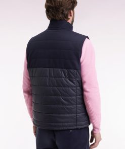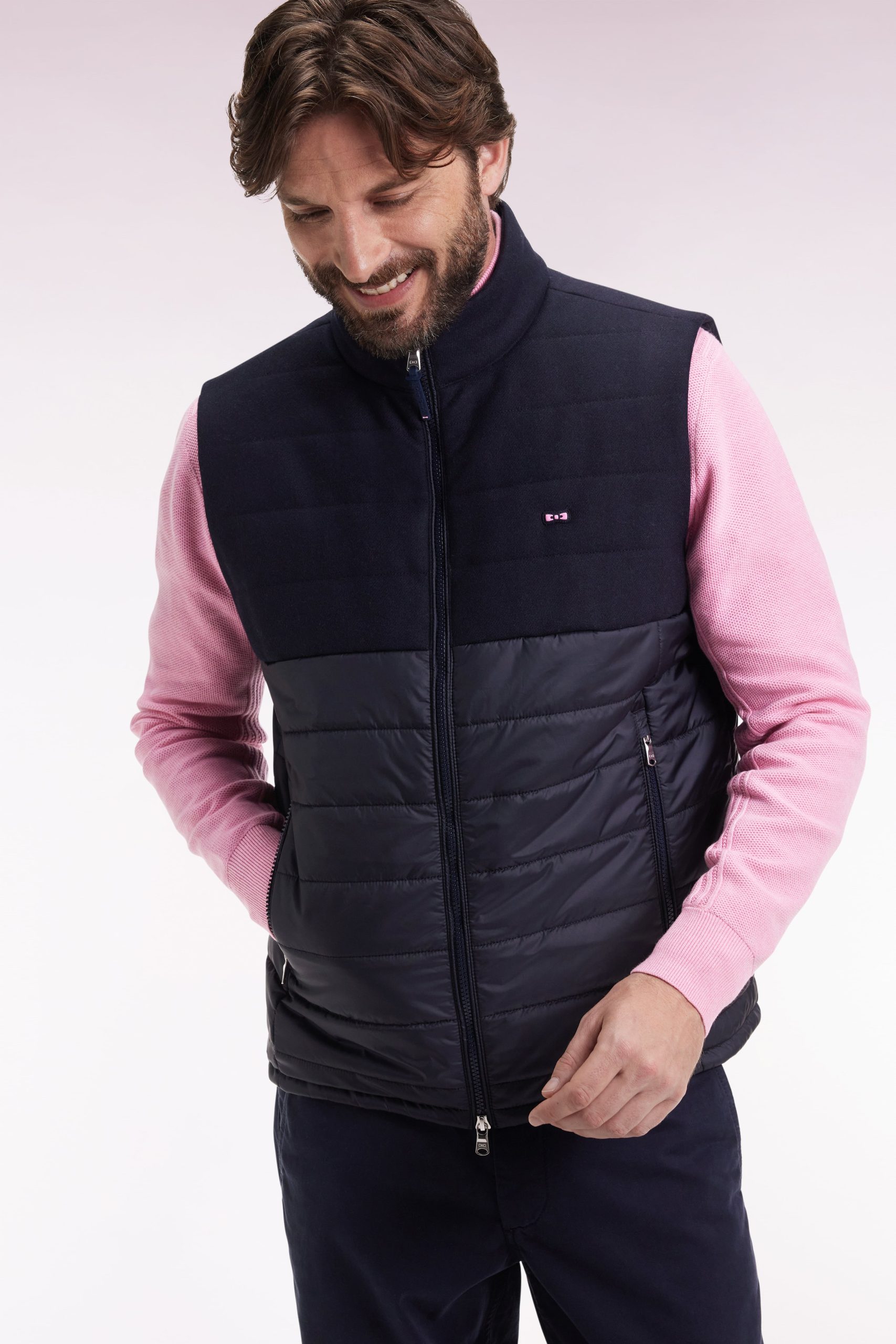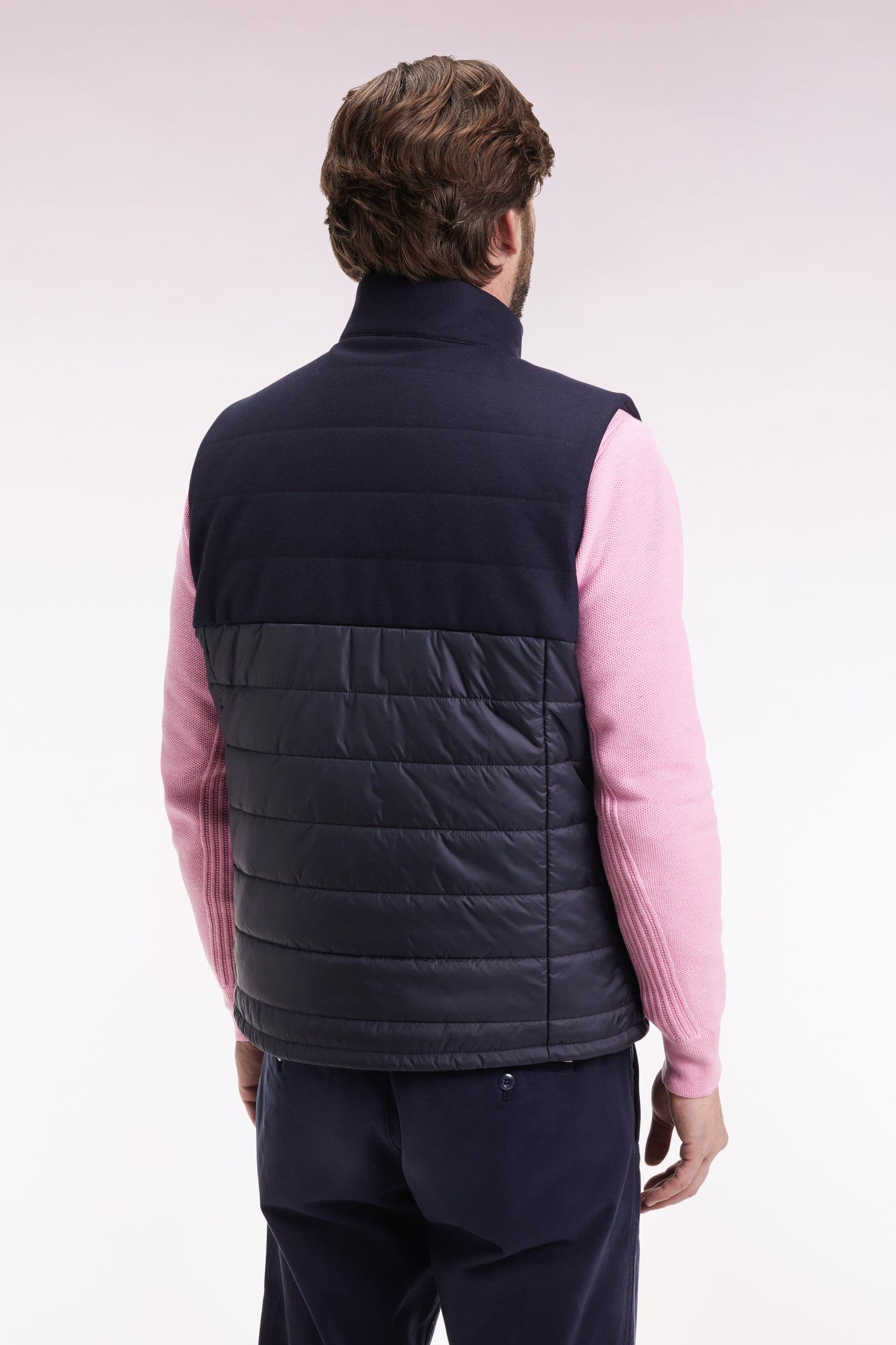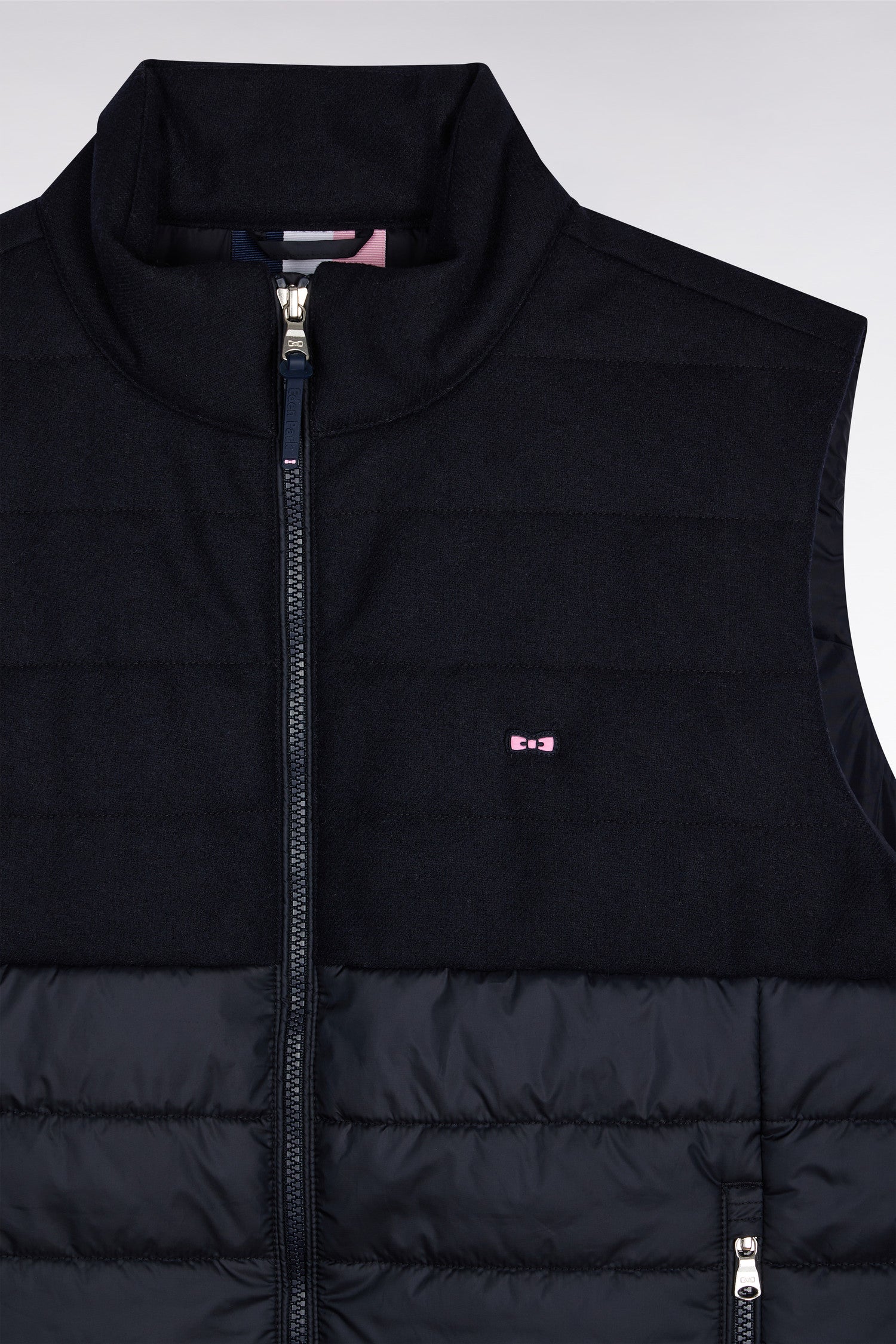 Conçue dans un esprit sport chic affirmé, cette doudoune sans manches à col montant combine une flanelle élégante et un nylon matelassé pour une silhouette graphique et urbaine. Le jeu de découpes sur le devant et le dos souligne la structure, tandis que le zip à double curseur et les finitions signature de notre Maison affirment son identité