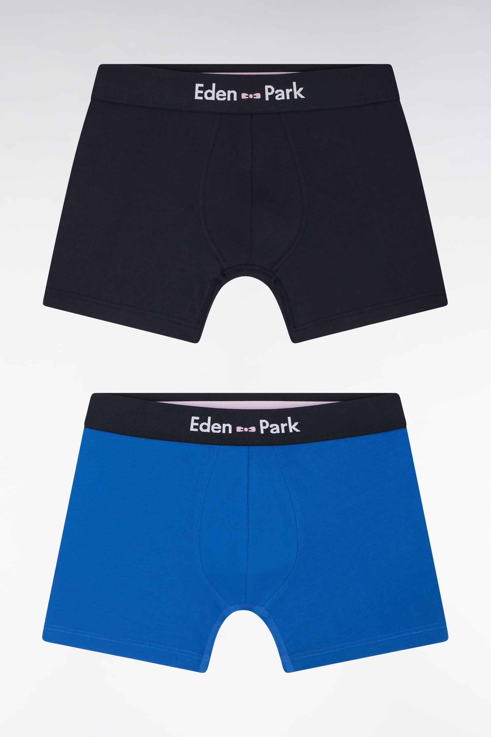 Ce lot de sous-vêtements réunit un boxer uni marine et un modèle coloré, variant selon le pack choisi, pour allier sobriété et fantaisie. Fabriqués en coton stretch avec ceinture élastique siglée Eden Park, ces boxers masculins offrent confort et maintien tout au long de la journée.