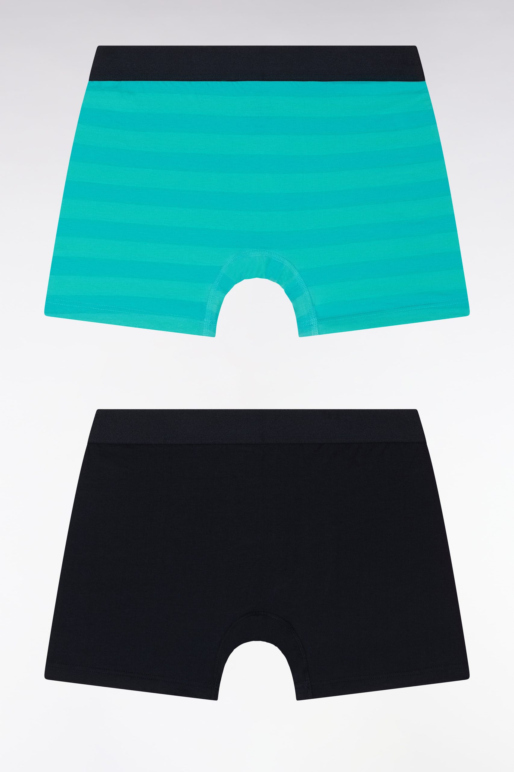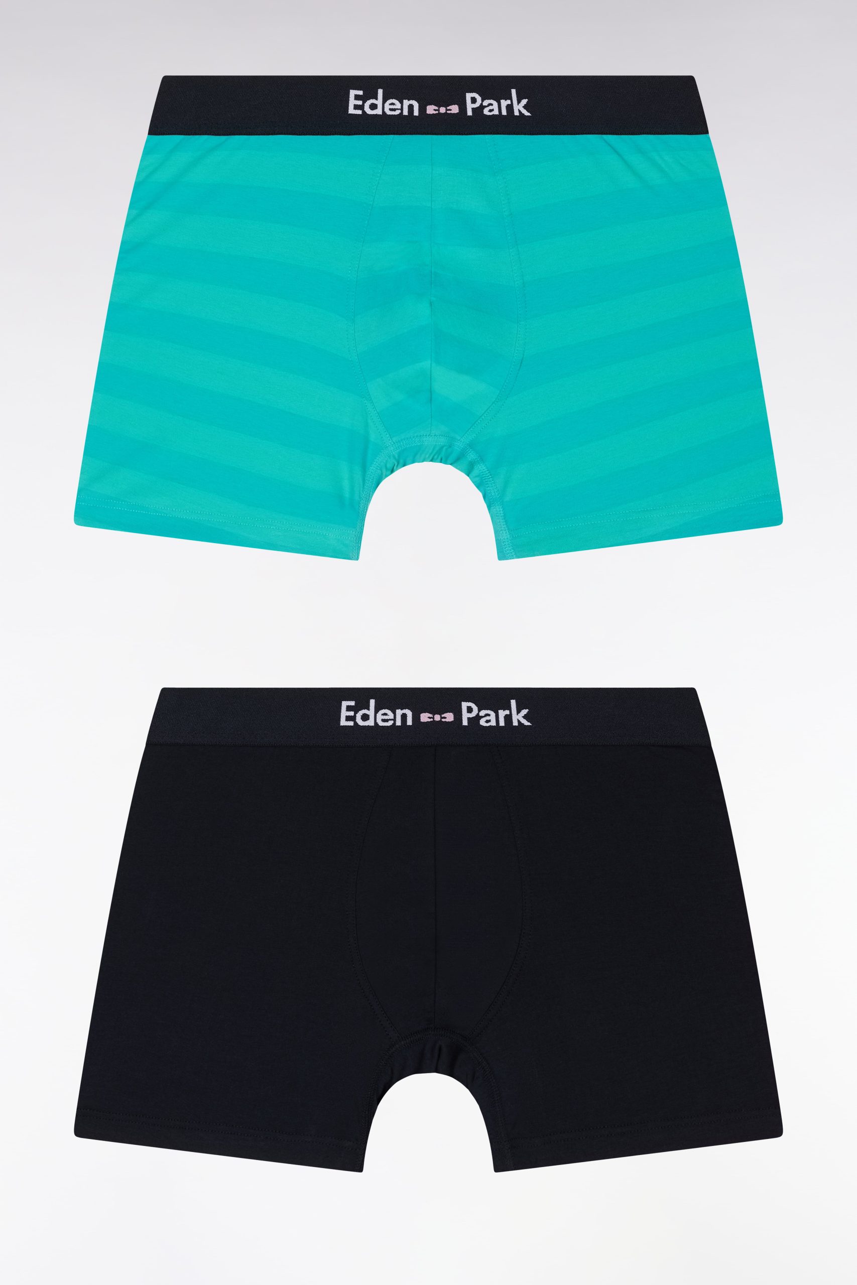 Apportez une touche graphique à vos sous-vêtements avec ce lot de deux boxers en coton stretch, l’un bleu marine minimaliste et l’autre cerclé de nos rayures contrastées dans le coloris de votre choix. Sa ceinture élastique siglée et son design moderne en font un choix confortable pour toutes les occasions.