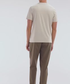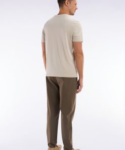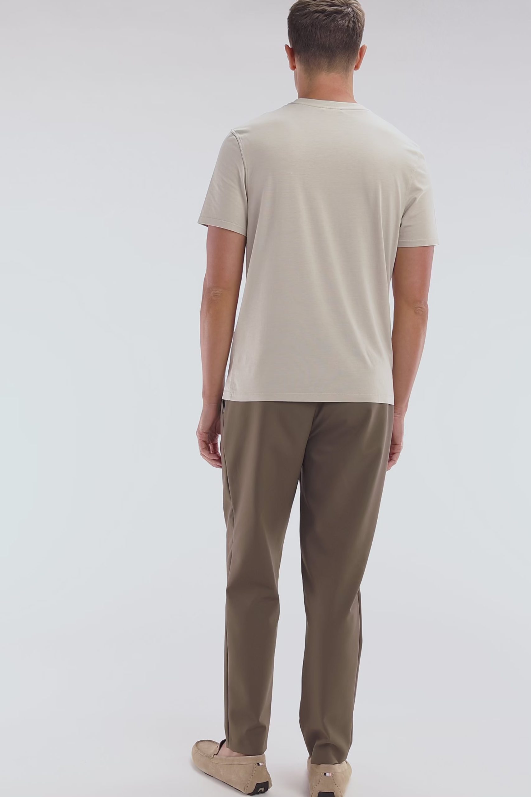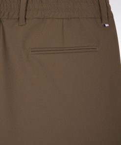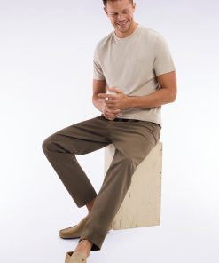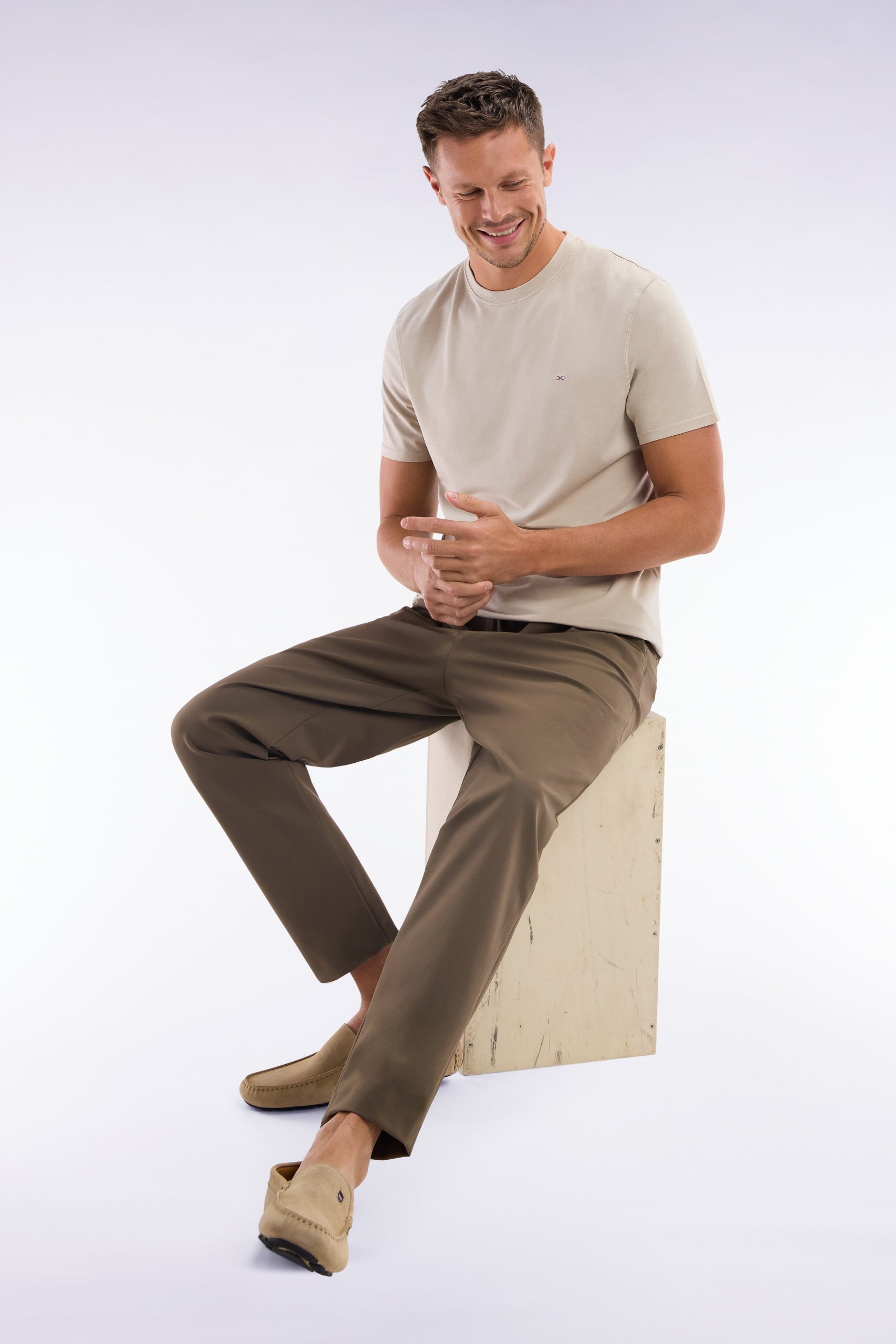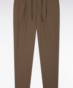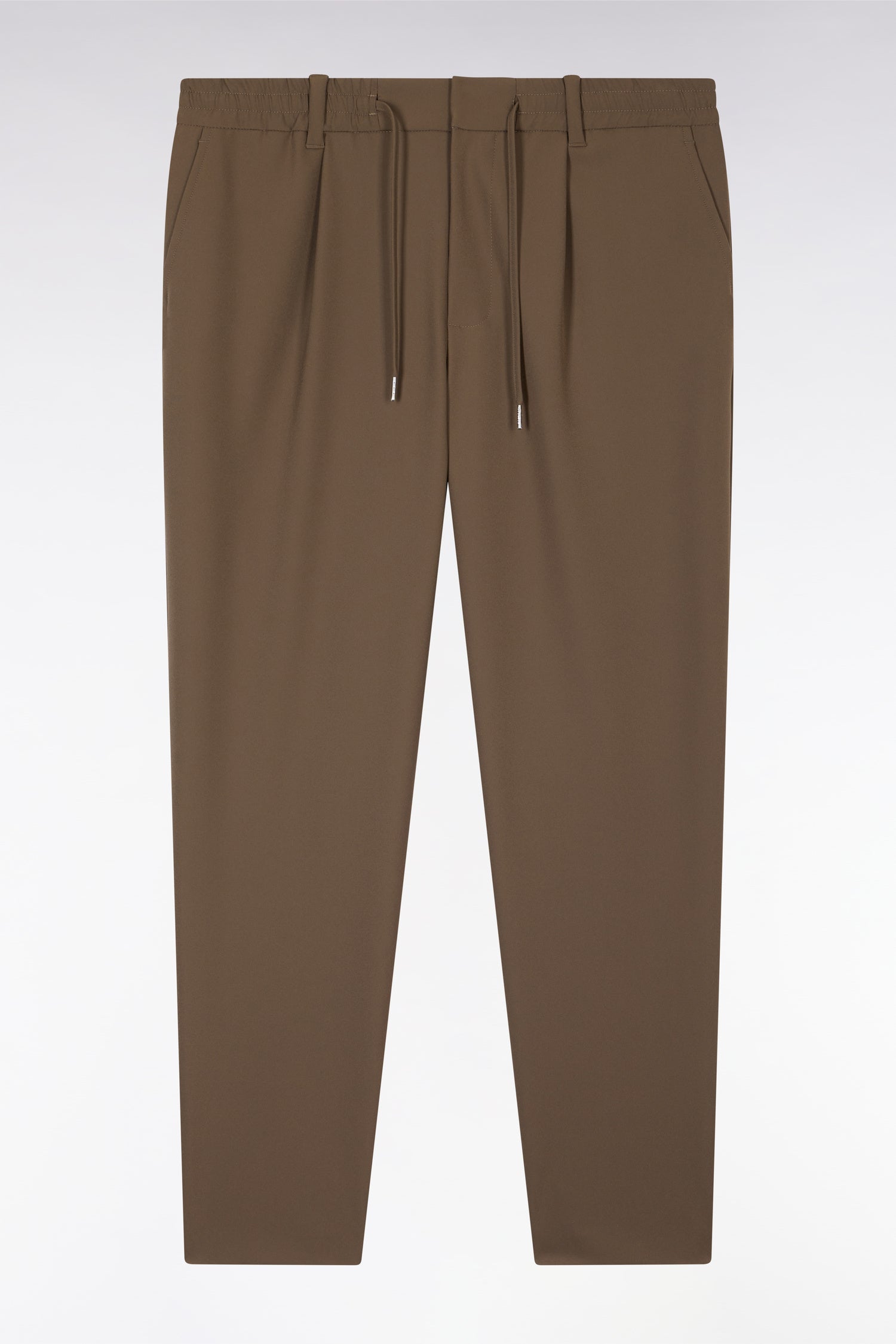 Ce pantalon chic revisite les codes du costume masculin avec une taille élastiquée et une coupe moderne légèrement carotte, alliant confort et élégance. Proposé en marron chocolat, marine ou kaki, ce pantalon homme à mi-chemin entre le pantalon de costume et le chino se distingue par son ruban ottoman tricolore sous la ceinture, ses passants ceinture et ses cordons à embouts métal argenté personnalisés.