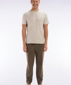Ce pantalon chic revisite les codes du costume masculin avec une taille élastiquée et une coupe moderne légèrement carotte, alliant confort et élégance. Proposé en marron chocolat, marine ou kaki, ce pantalon homme à mi-chemin entre le pantalon de costume et le chino se distingue par son ruban ottoman tricolore sous la ceinture, ses passants ceinture et ses cordons à embouts métal argenté personnalisés.