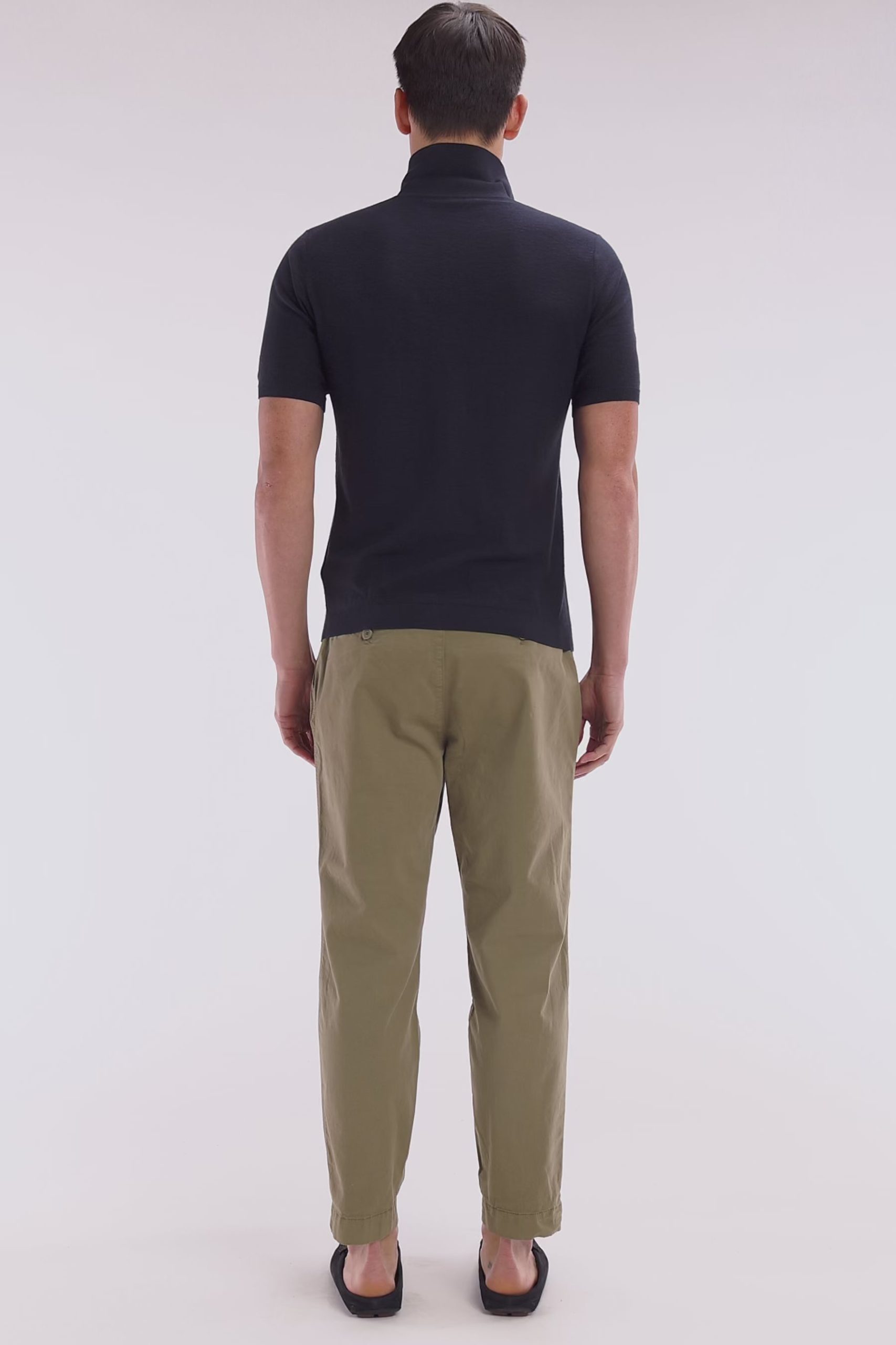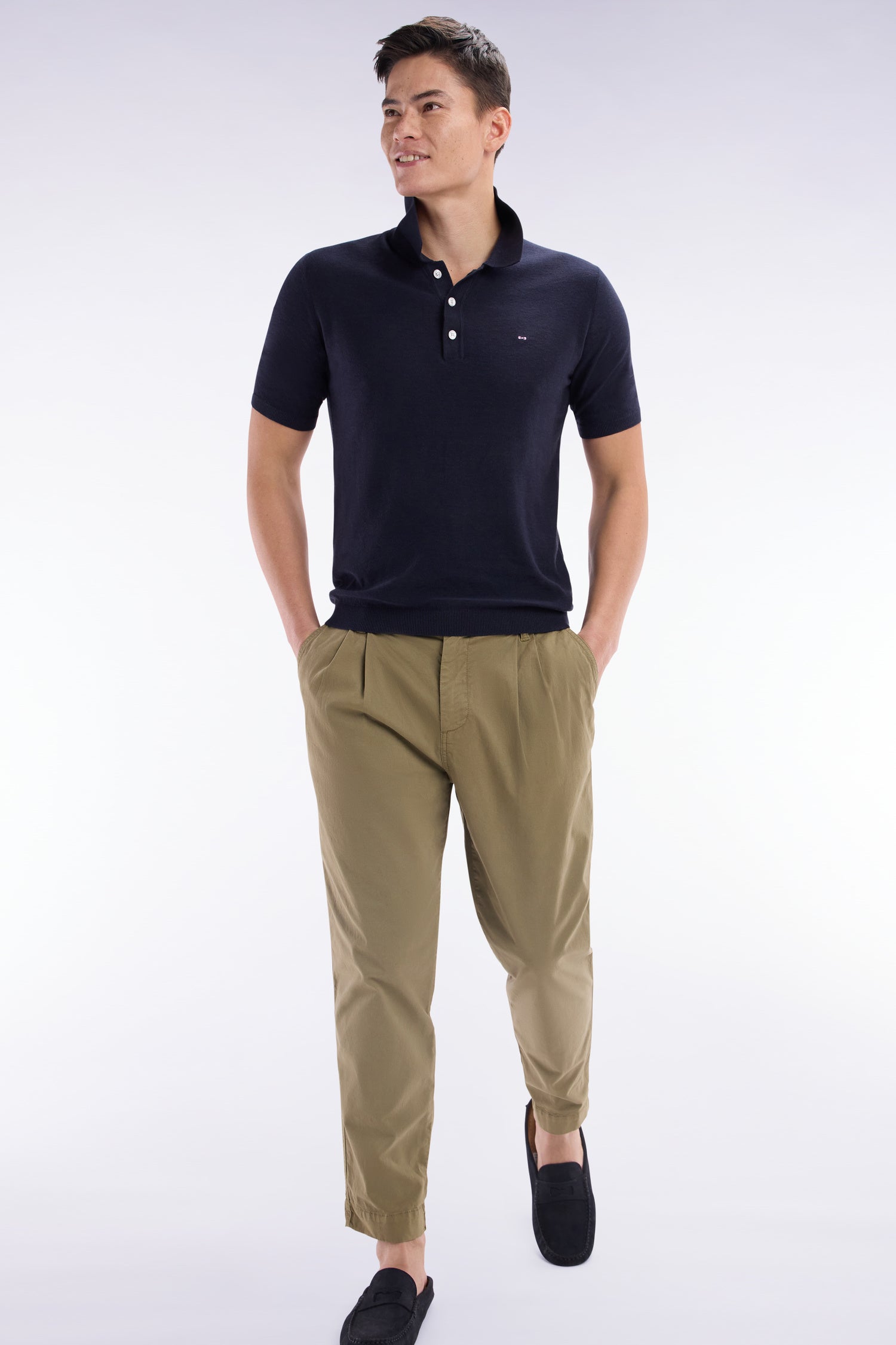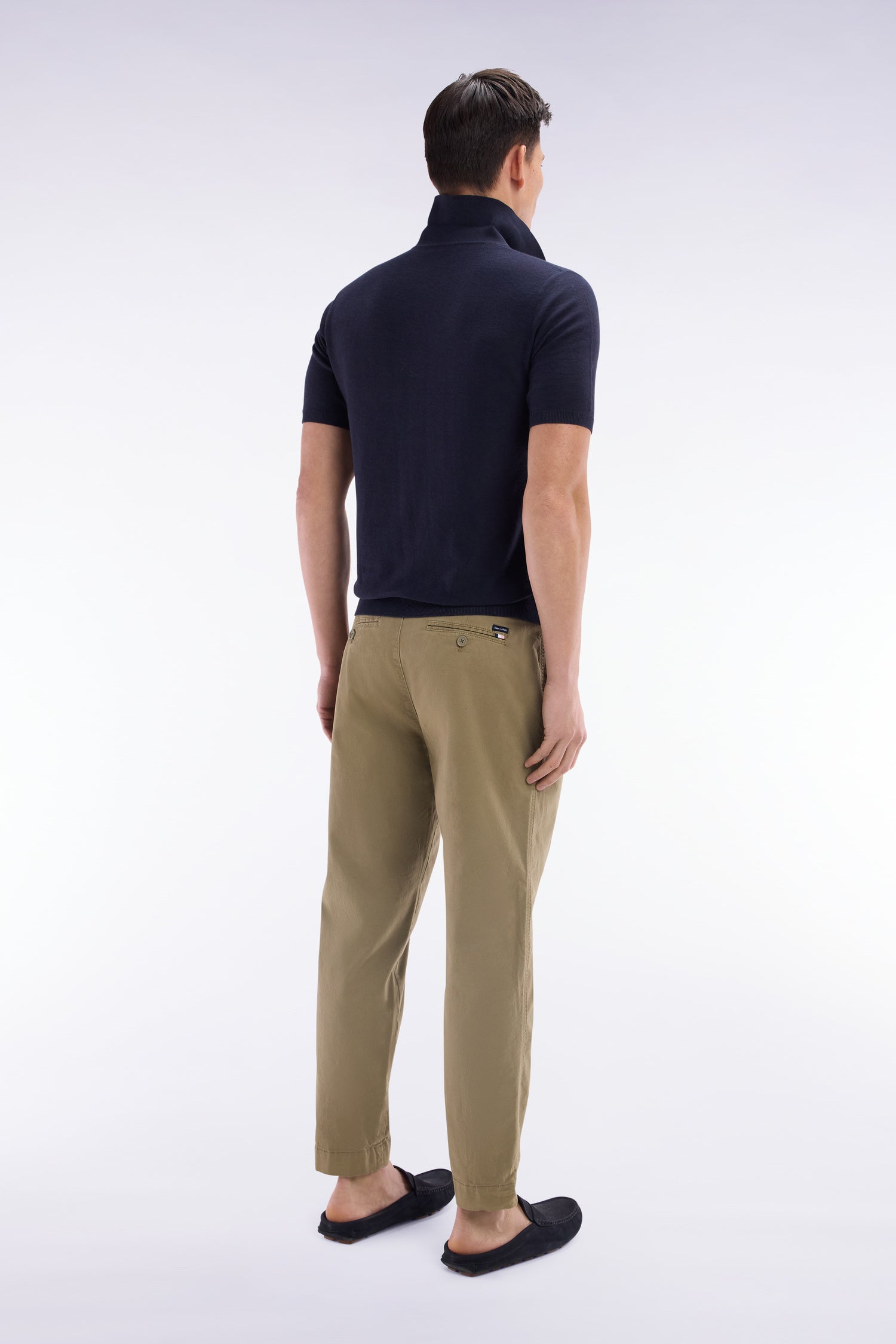 Ce pantalon chino à plis, décliné en marine, rose ou kaki, s’impose comme un pilier du vestiaire masculin. Confectionné en coton stretch, il allie élégance et confort pour toutes les occasions. Ses finitions soignées mettent en lumière l’excellence de nos atelier. Craquez pour son style chic et intemporel qui marque des points à chaque tenue.