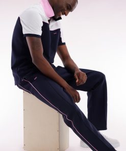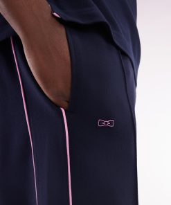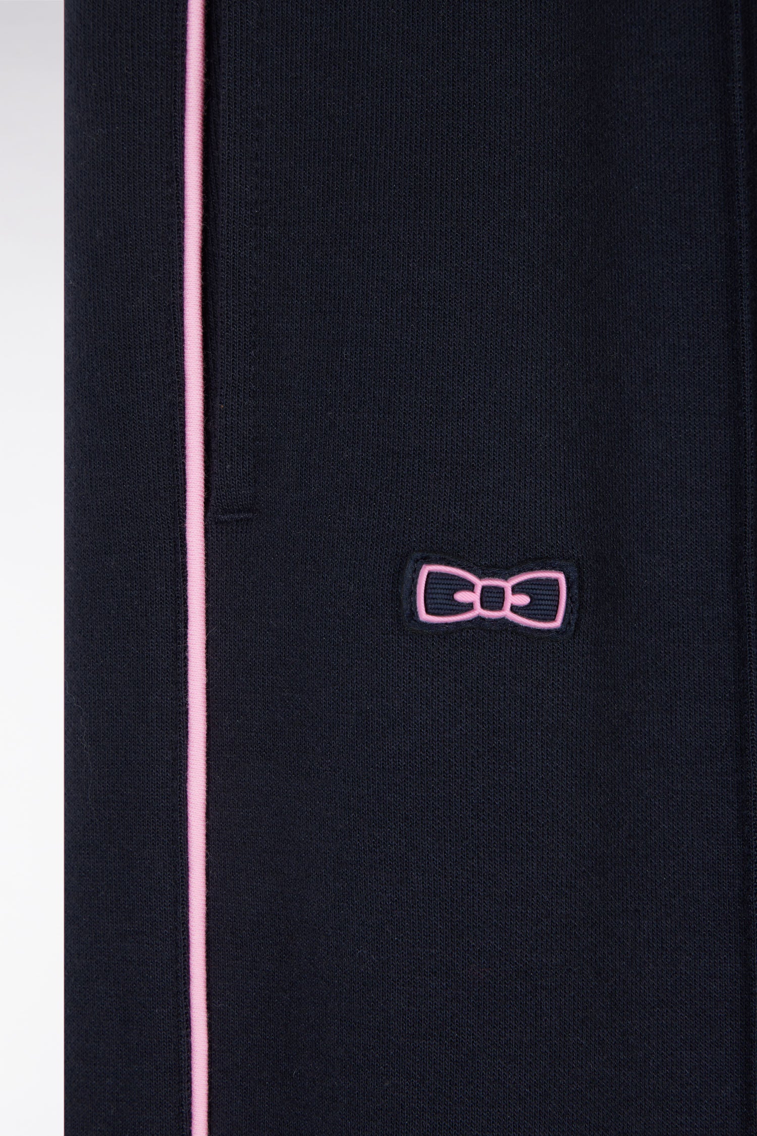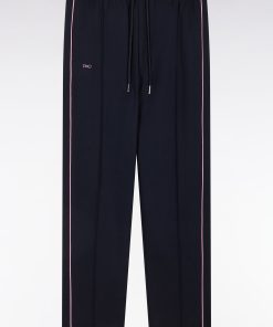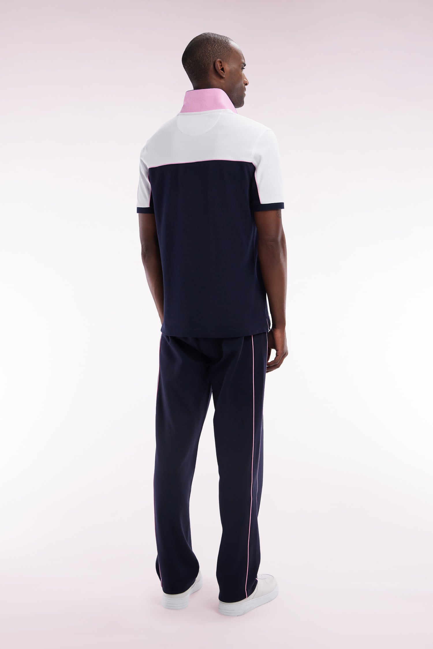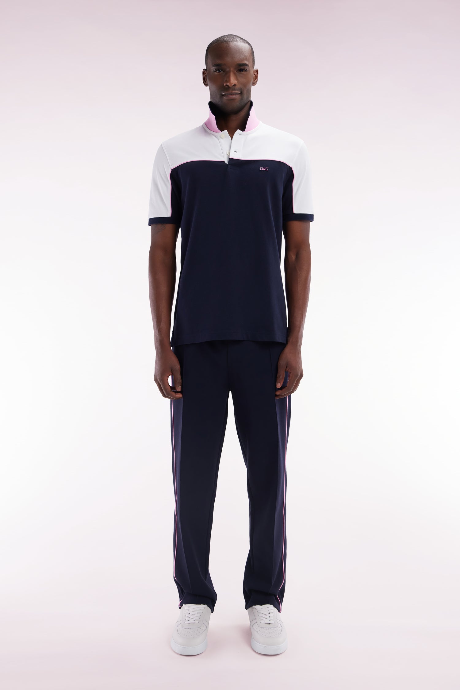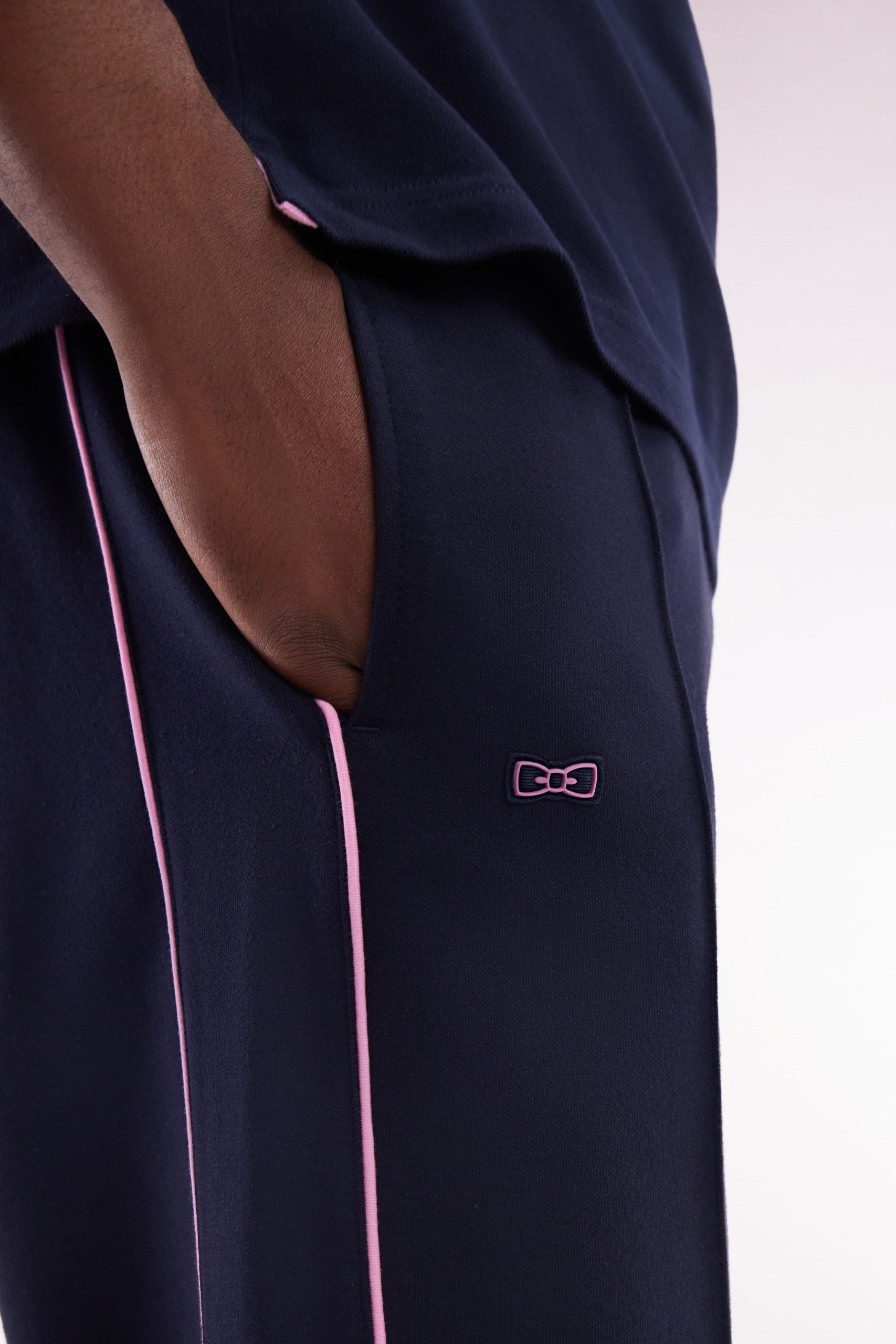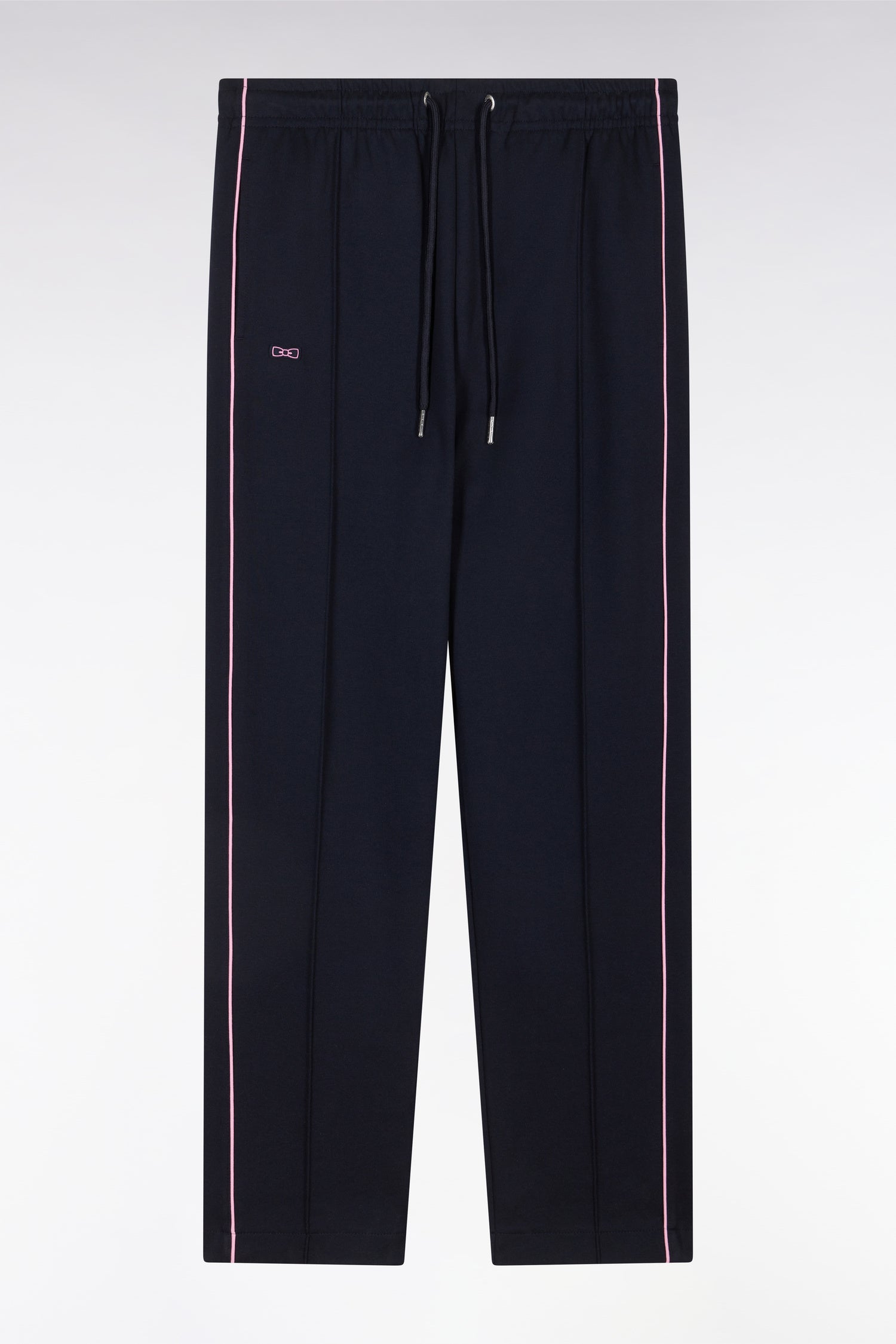 Ce pantalon de jogging en interlock marine ou bleu ciel, conçu pour être porté avec le sweatshirt assorti, allie confort et style. Plus épais que le jersey, il offre chaleur et douceur. Les détails soignés, comme le badge en gomme aligné avec la poche et les biais contrastés le long des jambes, soulignent l’attention aux finitions de notre Maison. Sa ceinture élastique et son cordon de serrage assurent un ajustement parfait pour un style athlétique et travaillé à la fois.