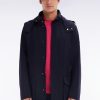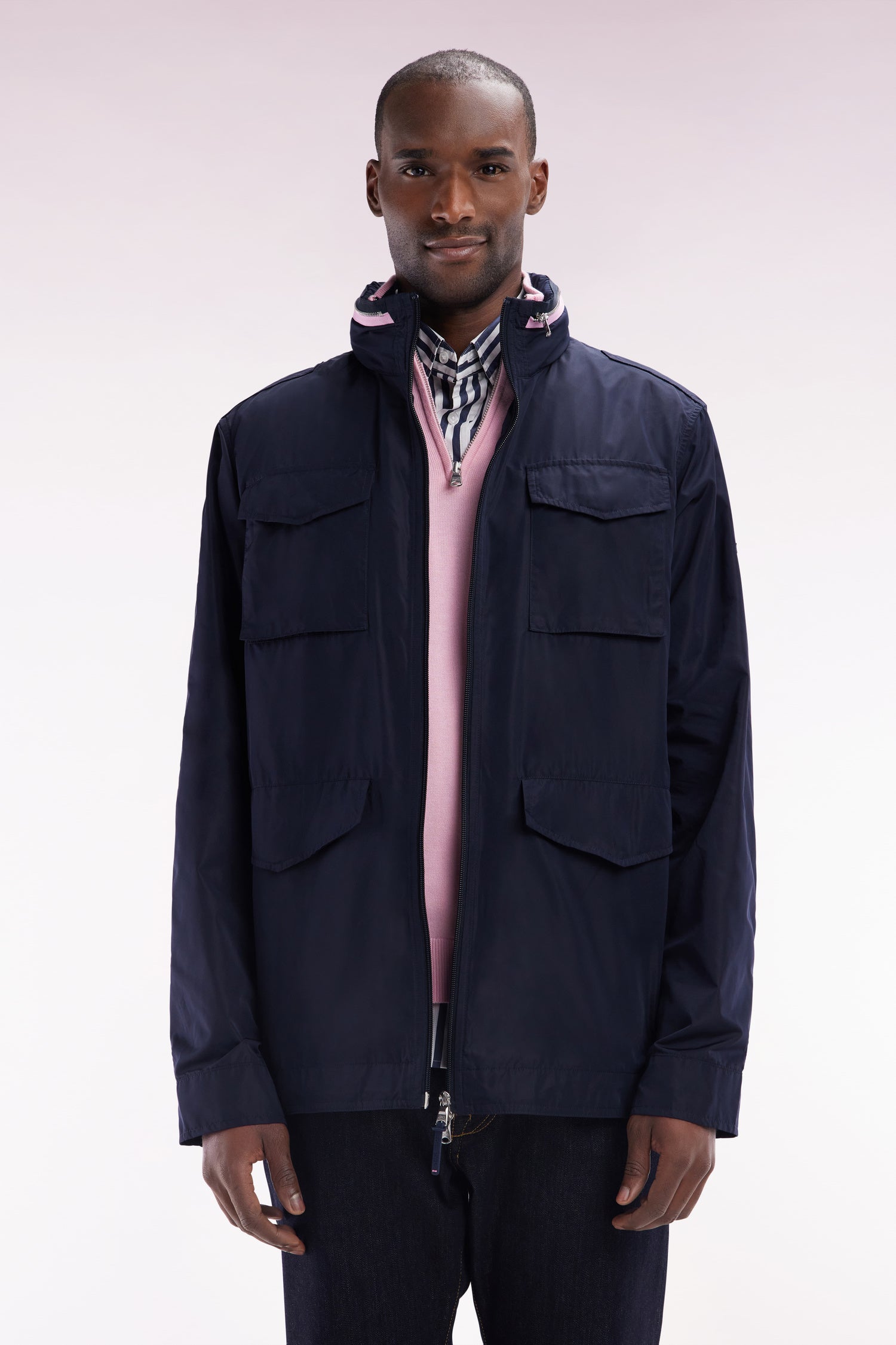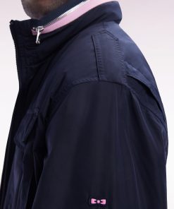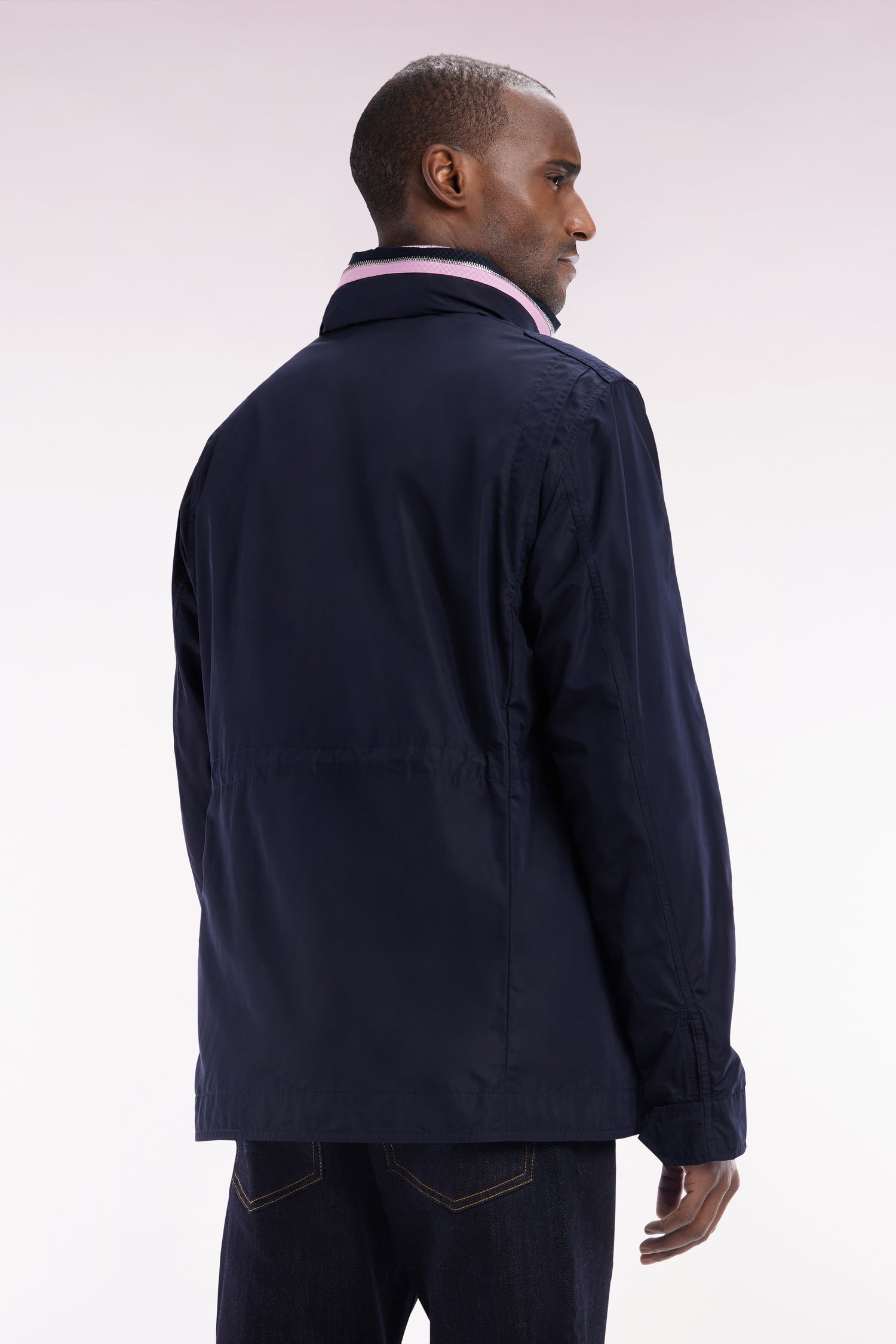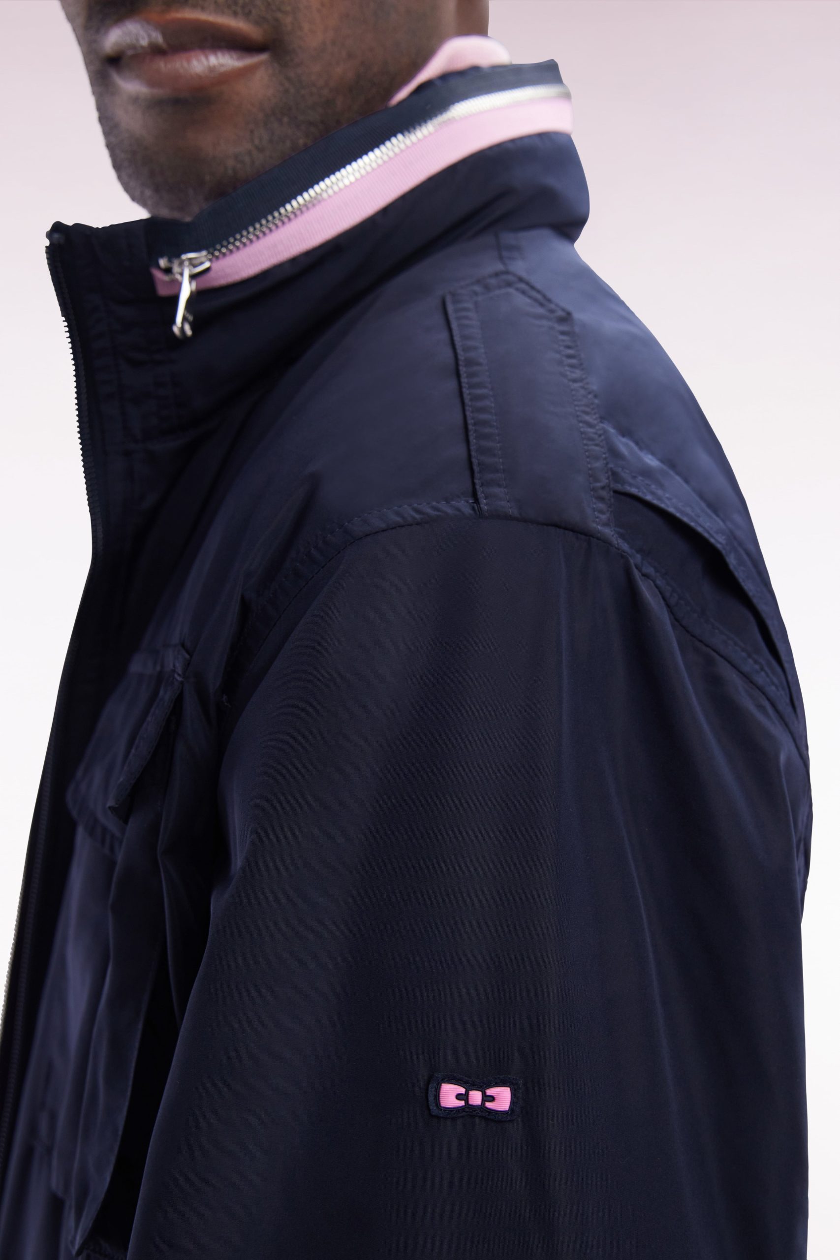 Cette parka courte en nylon allie praticité et élégance avec son col haut zippé et sa capuche intégrée se repliant à l’intérieur du col. Les découpes et empiècements aux épaules ajoutent une touche moderne, tandis que les quatre poches à rabats et les cordons de resserrage à la taille renforcent son aspect fonctionnel. Les détails signature, comme le nœud gomme sur la manche et le ruban tricolore sous l’encolure, complètent ce modèle parfait pour une silhouette urbaine raffinée par tous les temps.