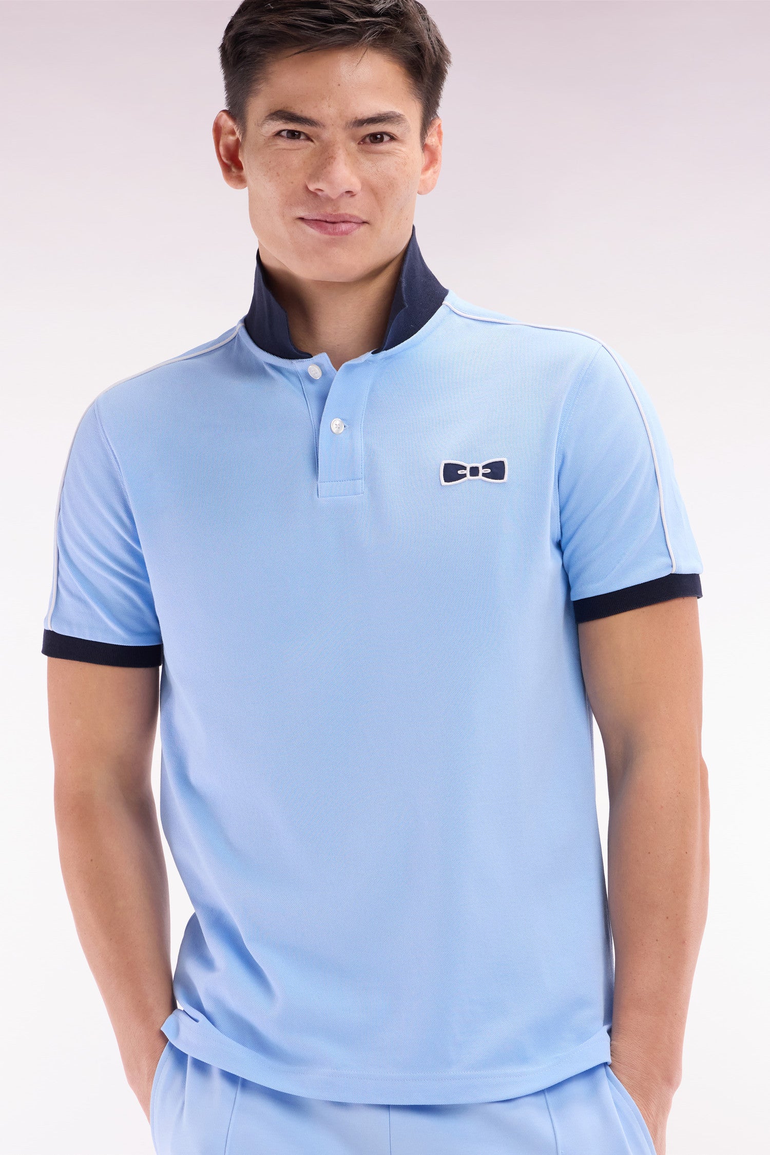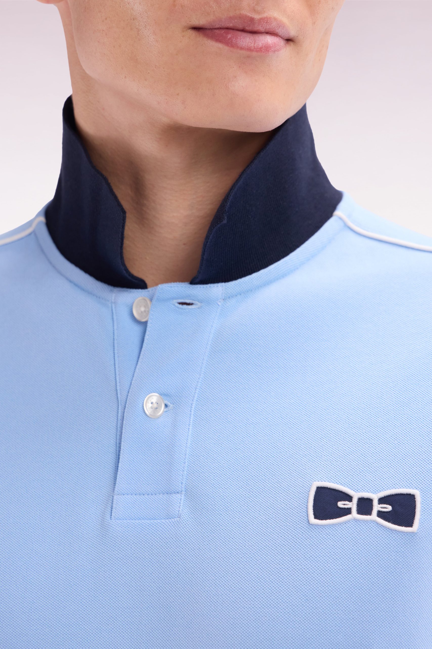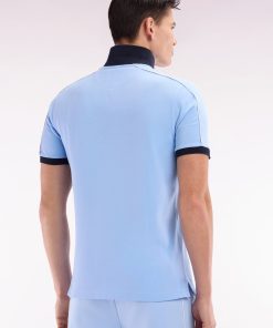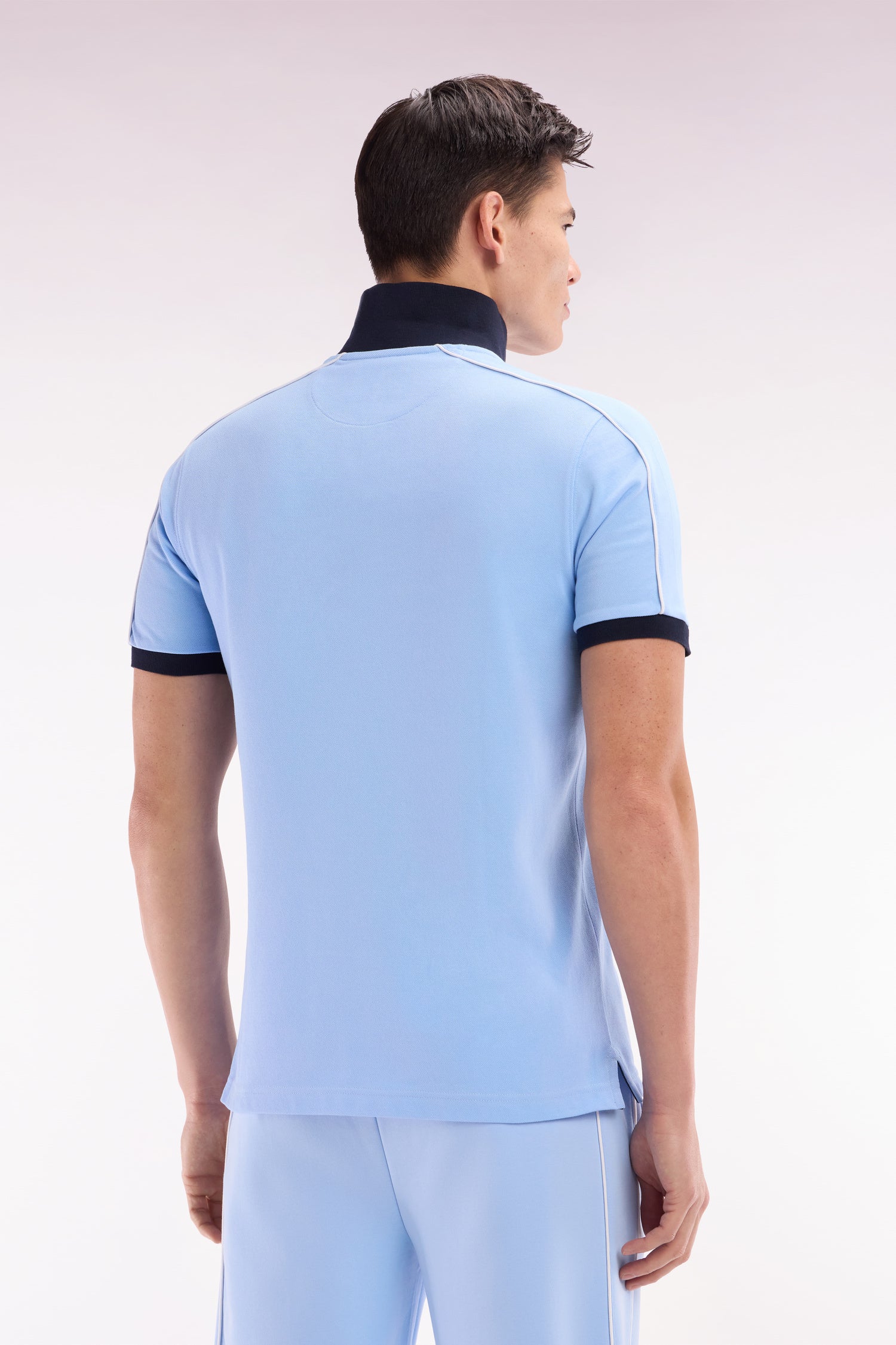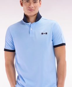 Ce polo homme en piqué de coton, disponible en coloris ciel avec col polo et bordures de manches bleu marine ou en marine avec col rose, se distingue par un passepoil discret contrasté, le long de la ligne d’épaules. Un détail chic et sportif pour un style affirmé et une carrure élégamment mise en valeur.