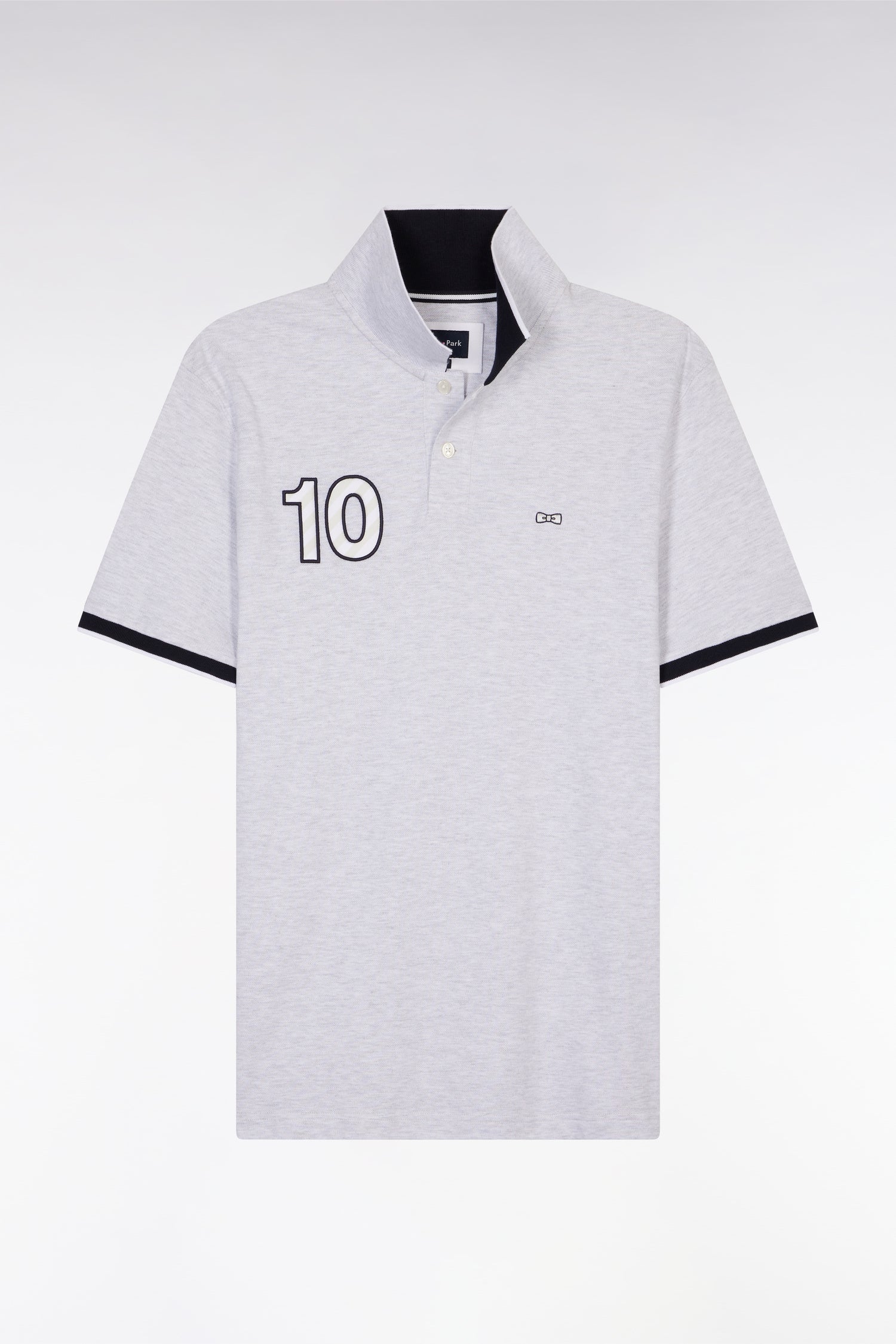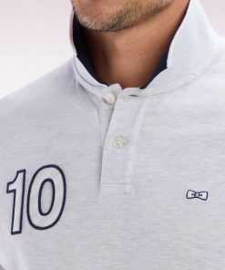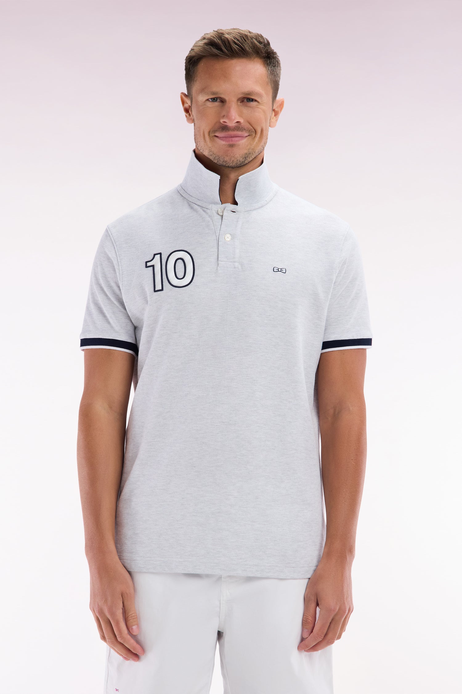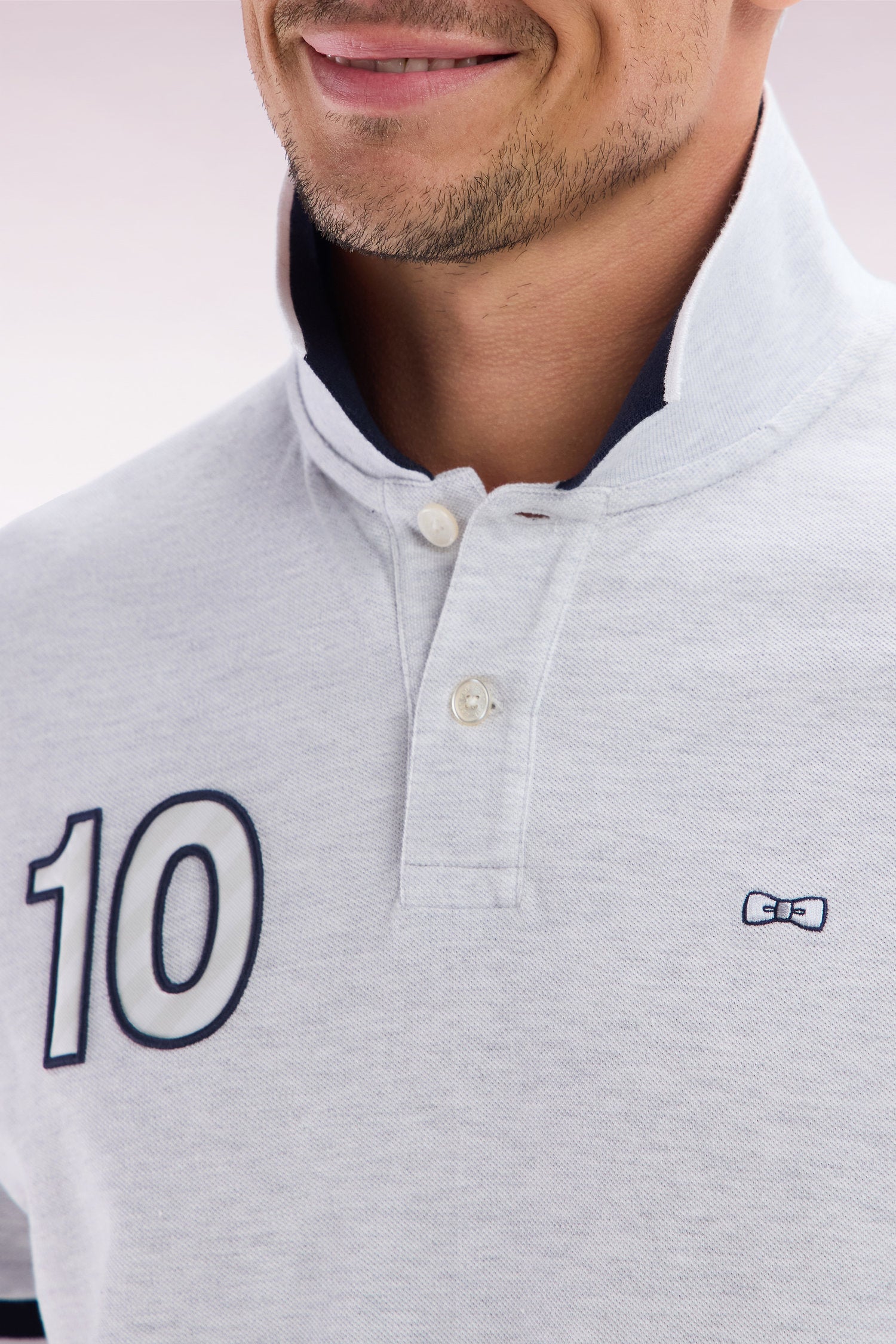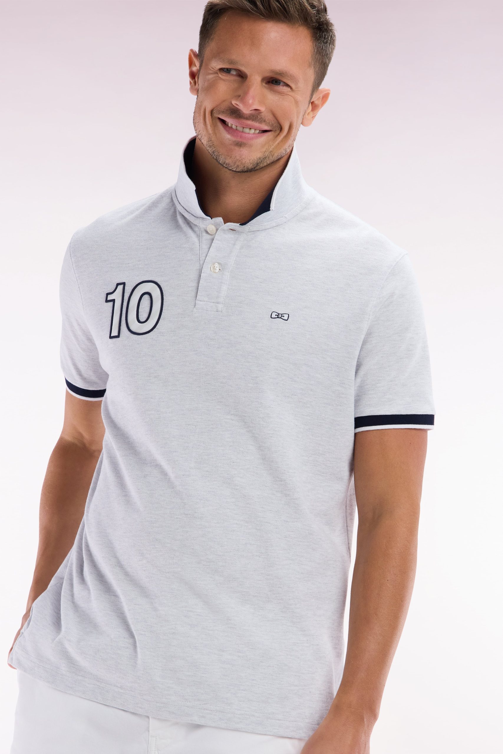 Ce polo à la coupe décontractée, proposé dans des coloris pop comme le bleu ciel, jaune et rose, ainsi qu’en gris intemporel, se distingue par sa broderie nœud papillon ton sur ton avec un contour bleu marine pour un effet plus prononcé. Ce détail fait écho aux bordures de manches en bord-côtes et au col polo bleu marine. La broderie numéro 10, hommage au maillot de rugby porté par Frank Mesnel, le fondateur de notre Maison, en fait une pièce emblématique et tendance.