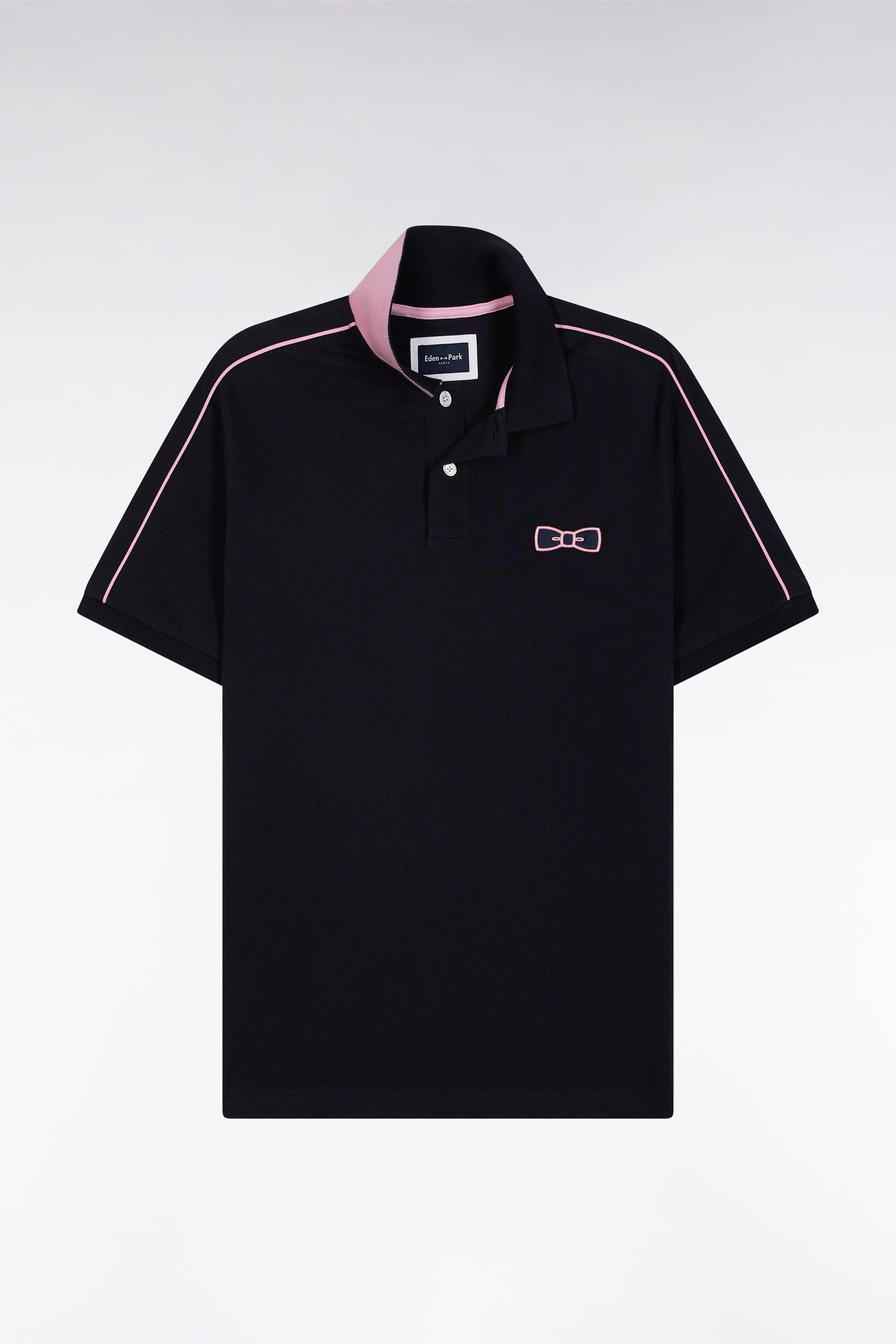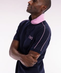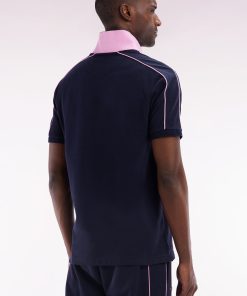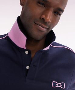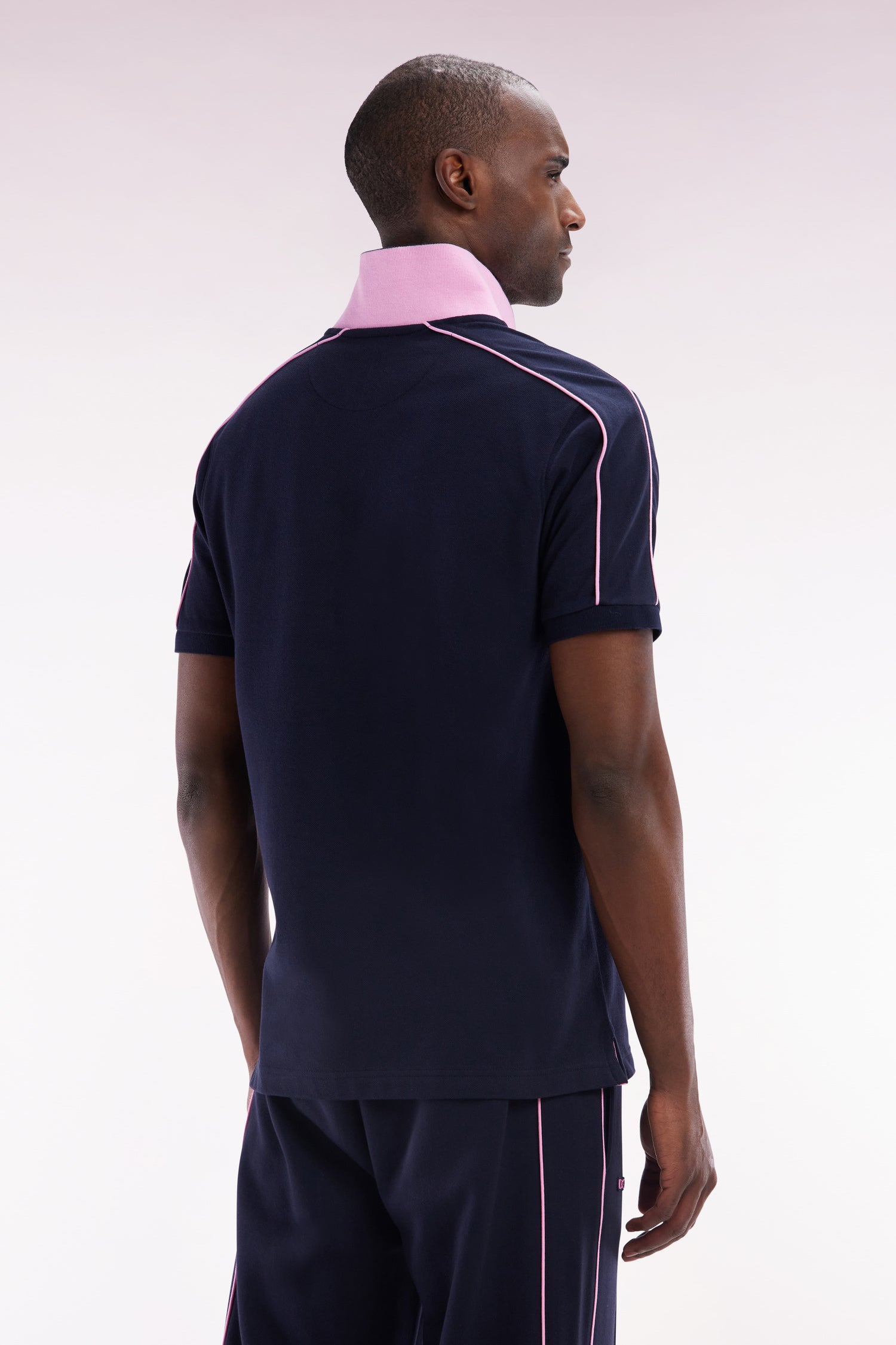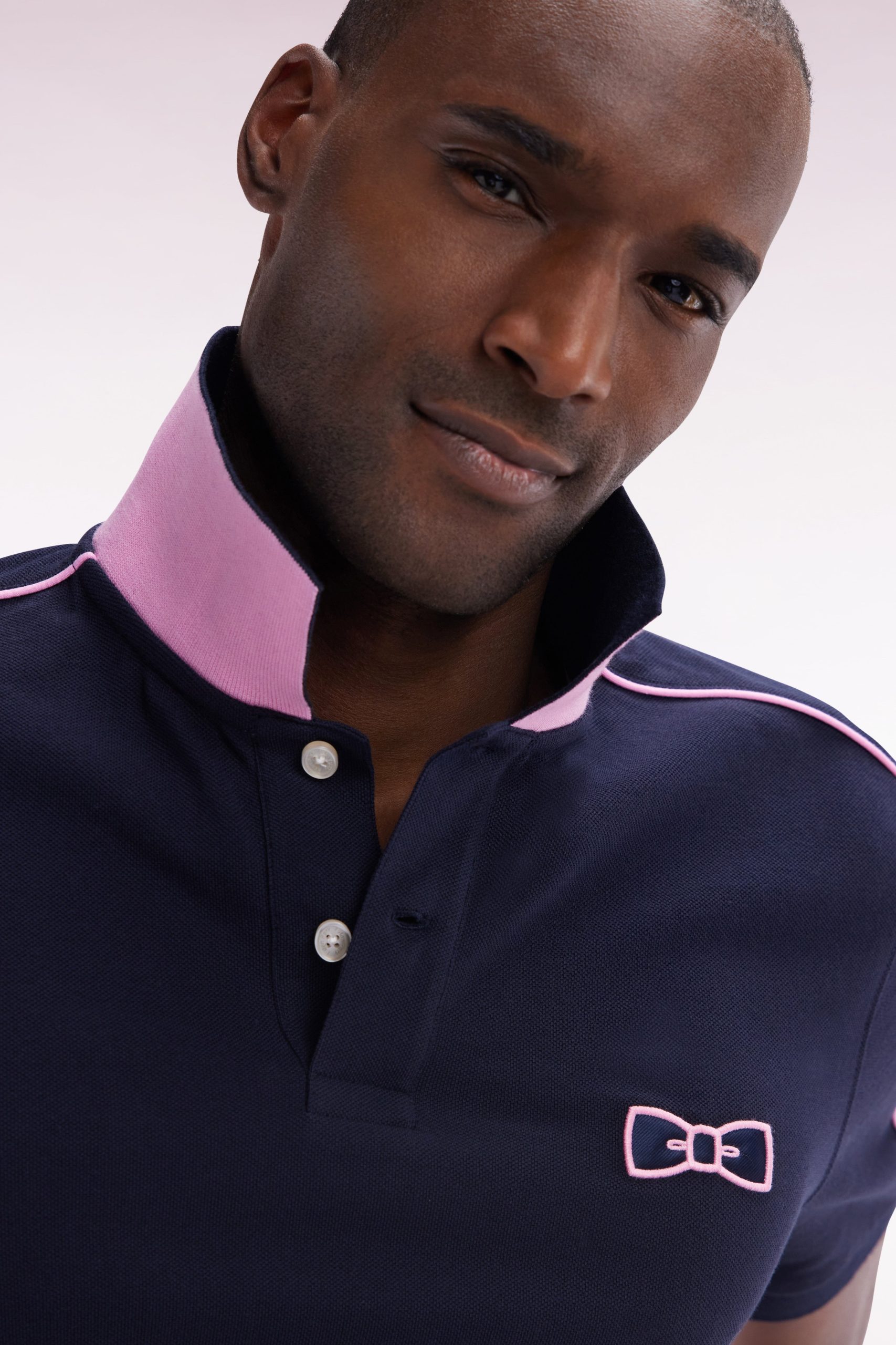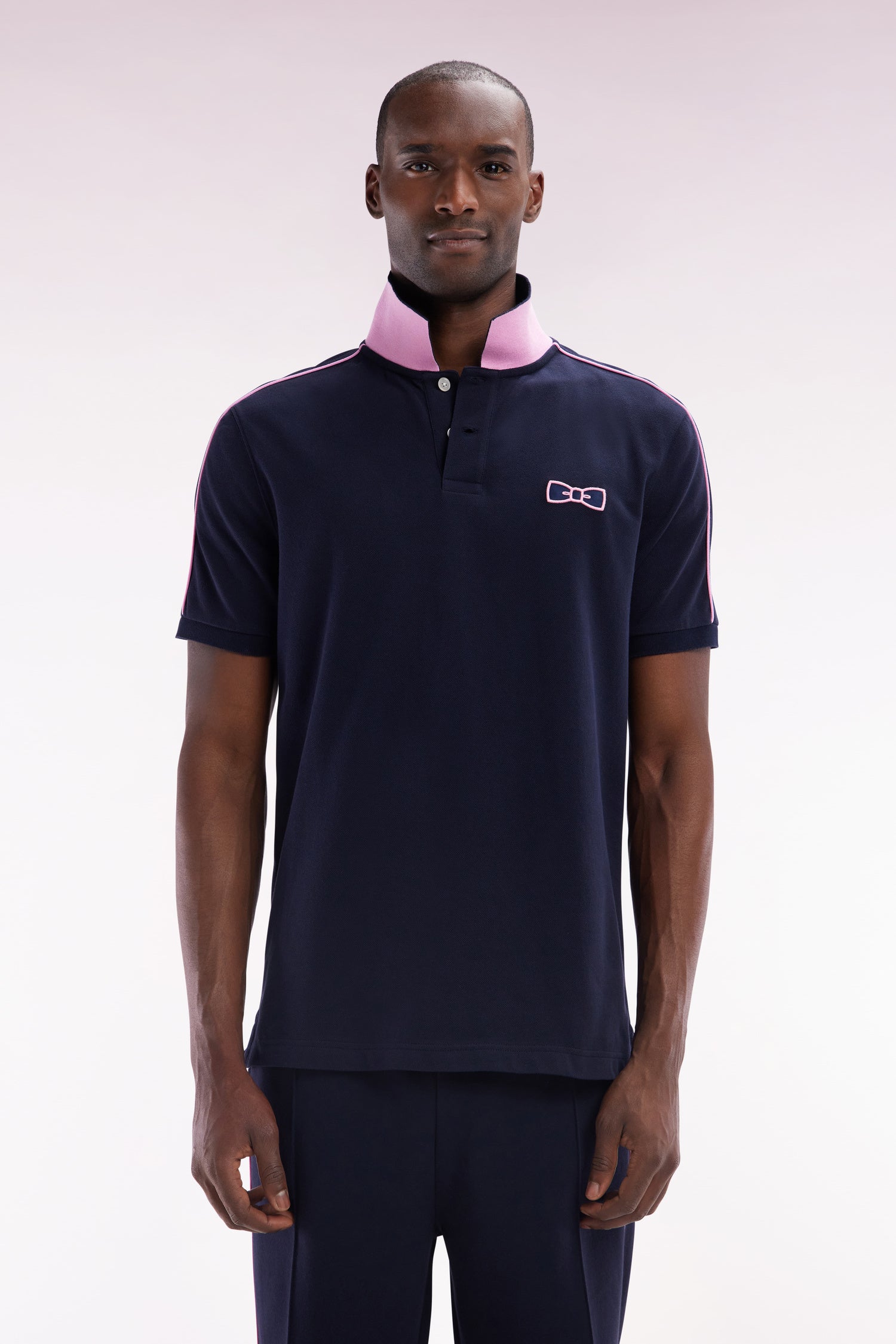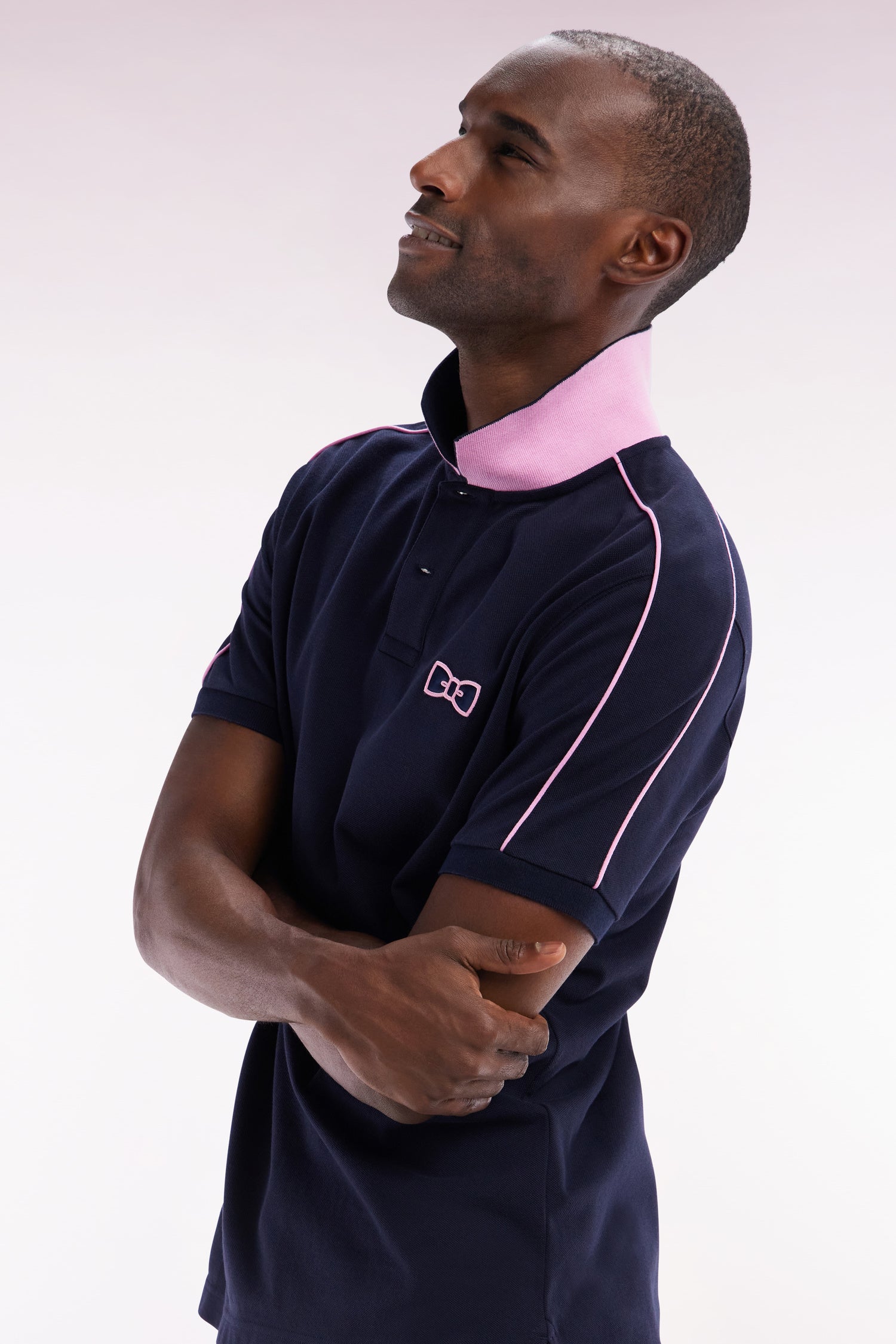 Ce polo homme en piqué de coton, disponible en coloris ciel avec col polo et bordures de manches bleu marine ou en marine avec col rose, se distingue par un passepoil discret contrasté, le long de la ligne d’épaules. Un détail chic et sportif pour un style affirmé et une carrure élégamment mise en valeur.